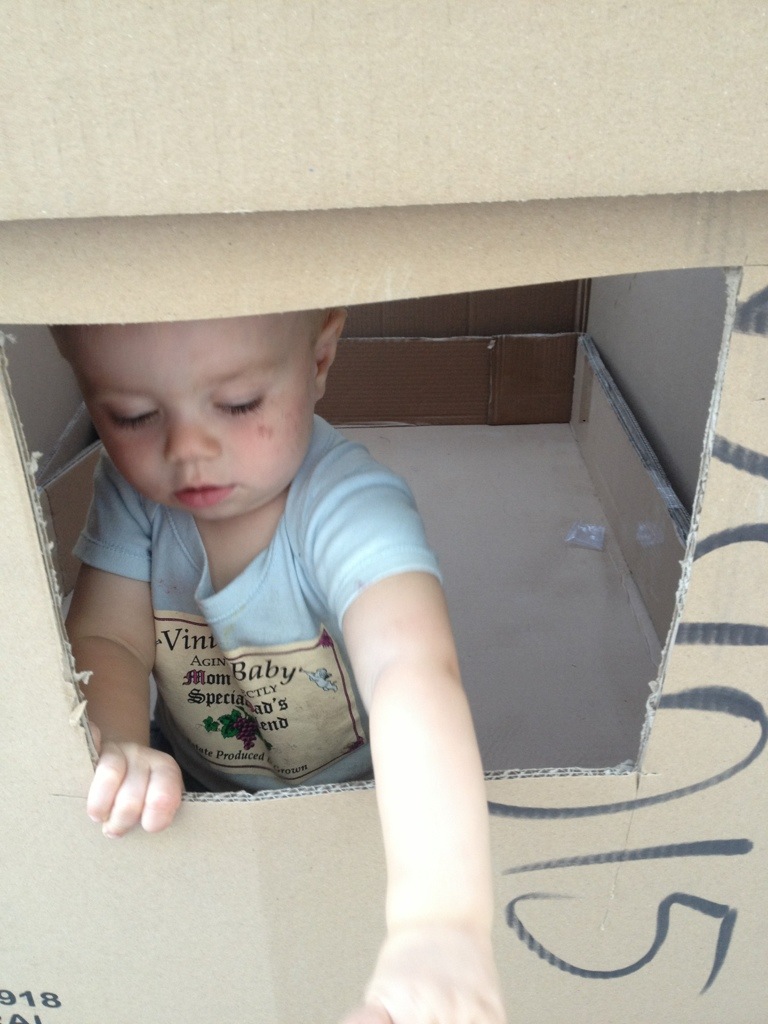 Josh cut a door and window into a big box from our patio furniture to make him a playhouse.