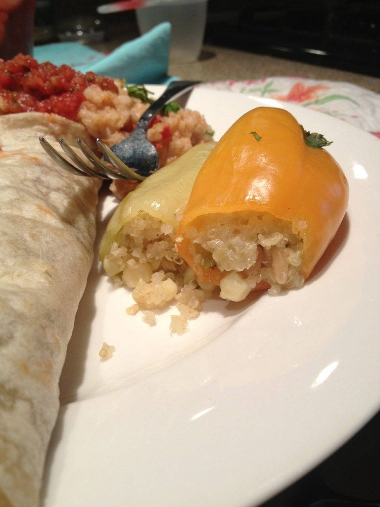 Mix together all ingredients in medium bowl. Holding a pepper over the bowl, stuff with a small spoon. Wrap each pepper in foil, making sure to enclose the cut and open top. Bake at 450 for 15 minutes or grill. Skin should be lightly brown in spots and soft. You can also open the foil for the last minute or two if you like the really roasted flavor.