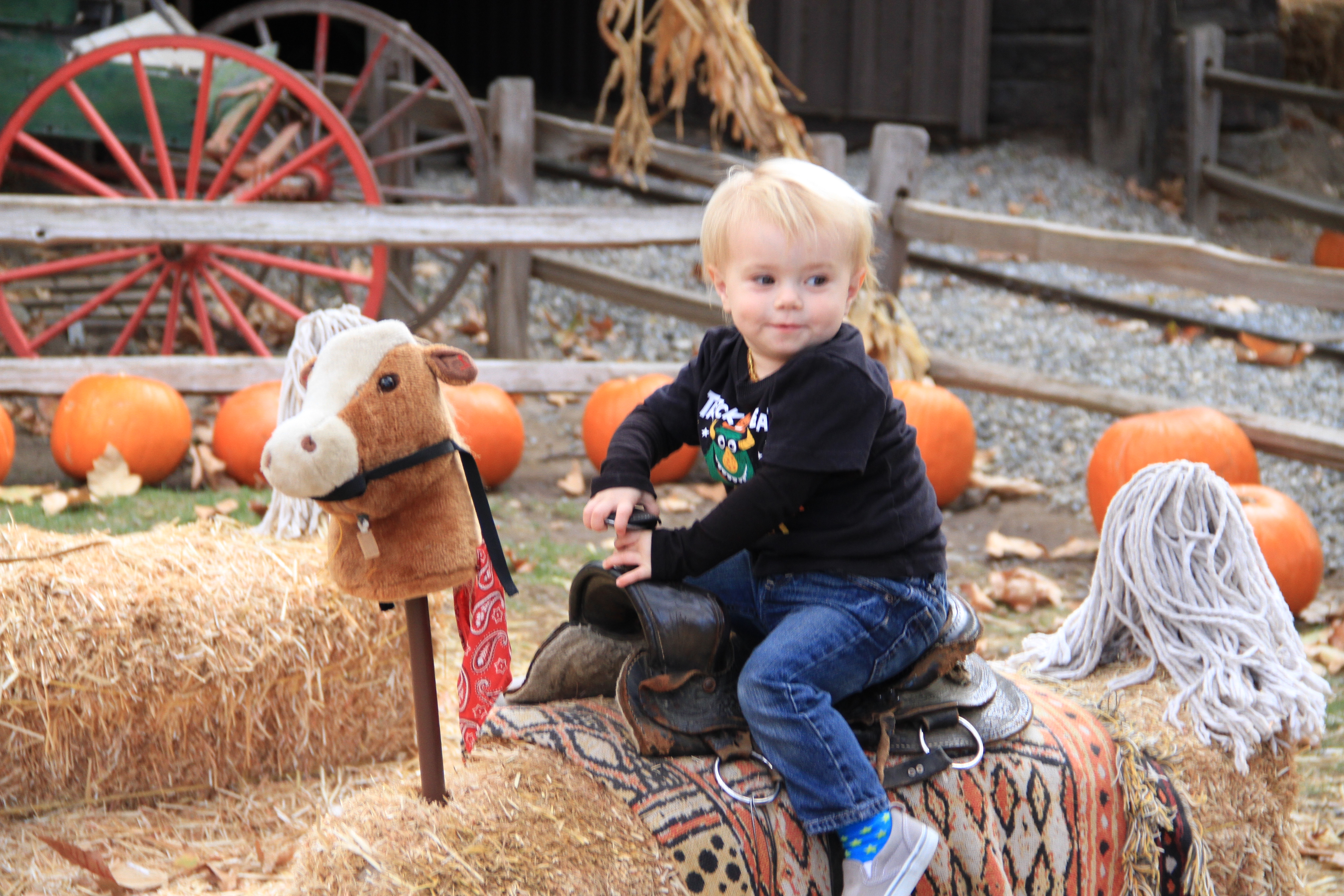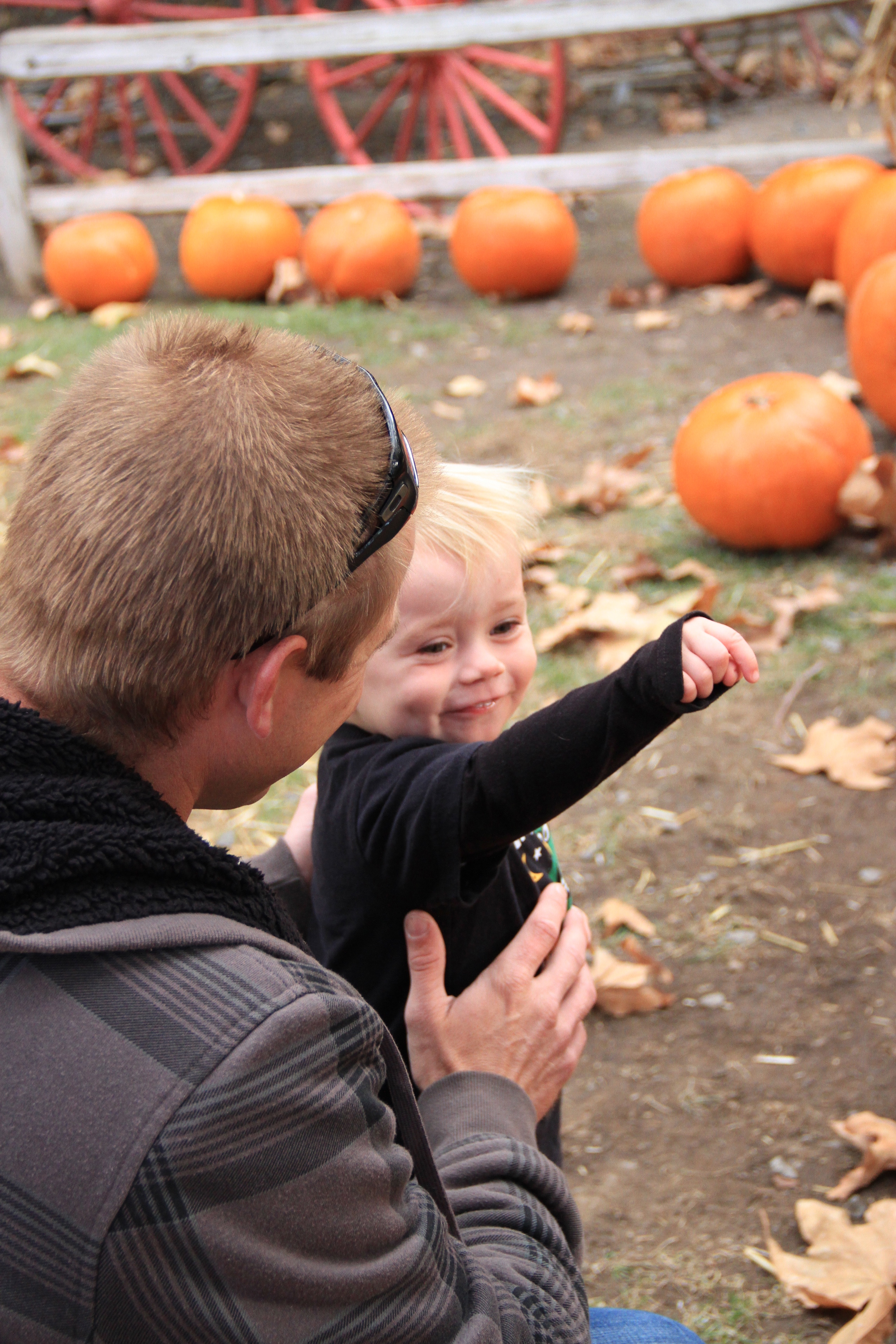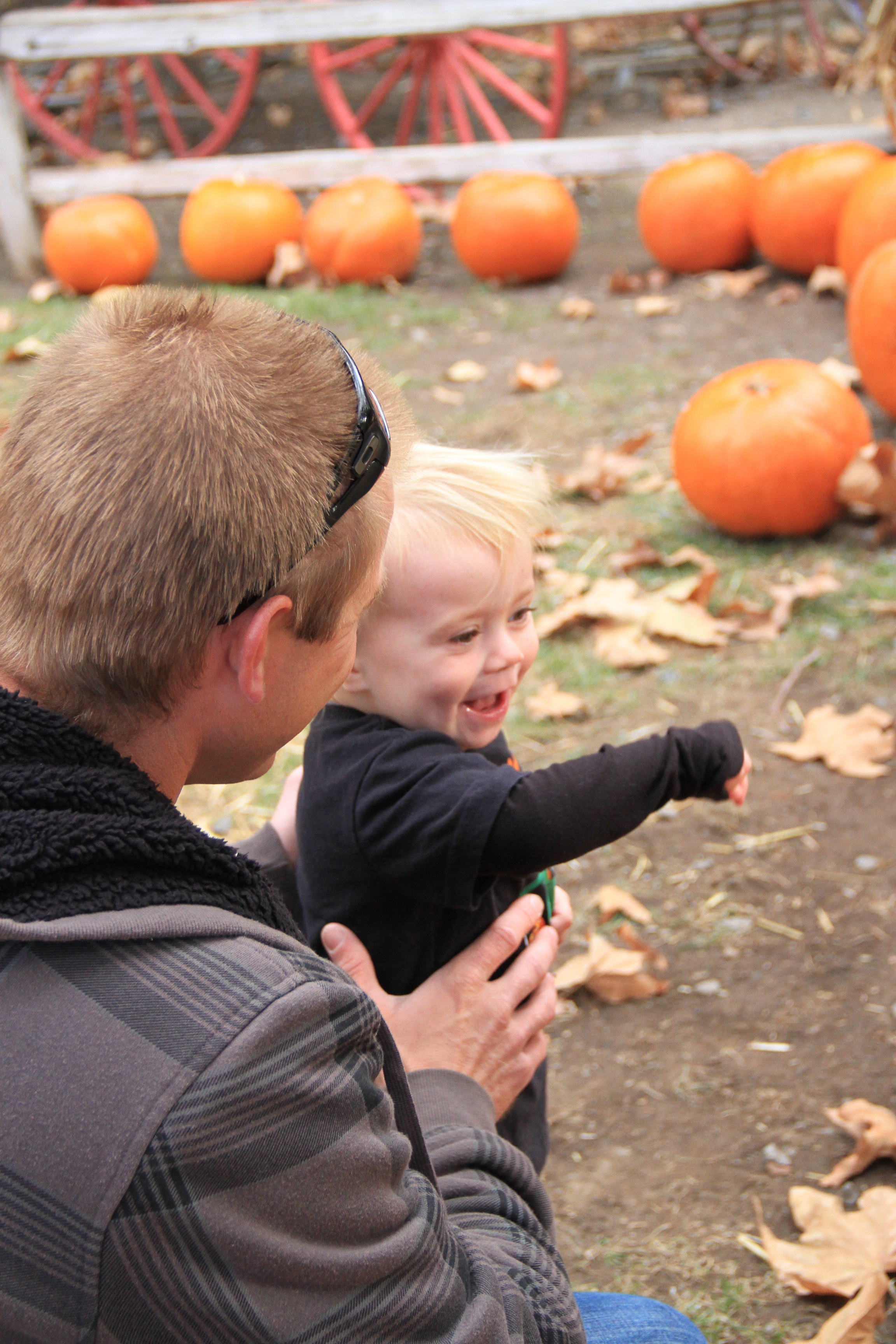 We visited this pumpkin patch last year as well. Click here to see those photos. It was a very different experience this year. Last year our bald baby was crawling, not walking, and was not very interested in the pumpkin patch. This year, Jacob was running and yelling “pumkys!” He liked picking them up and moving them together (naturally, as he is Josh’s child, he would organize them). He LOVED putting his face in the holes of the wooden picture spots (what are those called?). He would run enthusiastically to them and stick his little face in whichever he could reach. He climbed on hay stacks, he yelled enthusiastically for the train, even saying “alllll aboard!”
