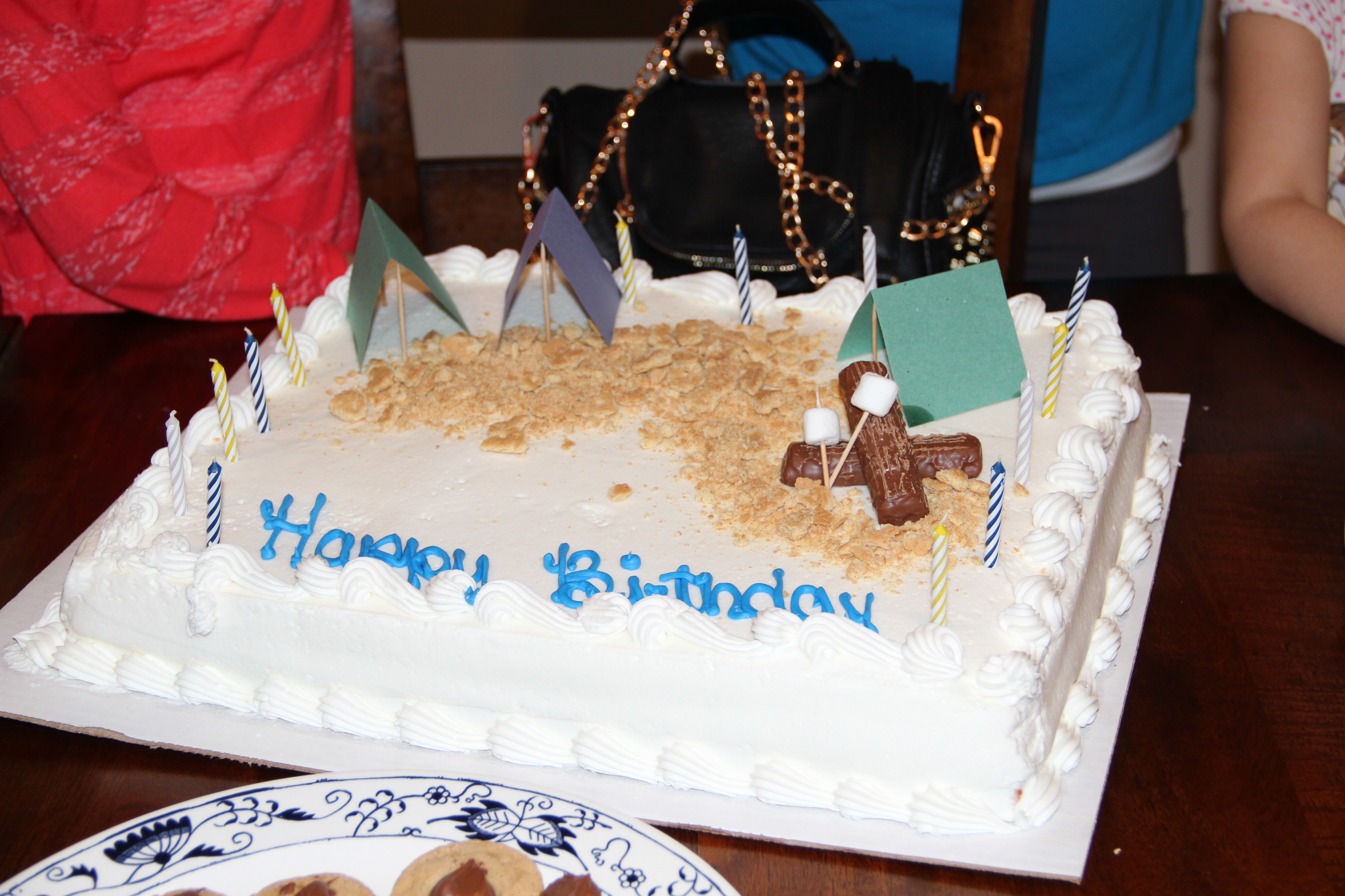 A sheet cake decorated with a camping scene.