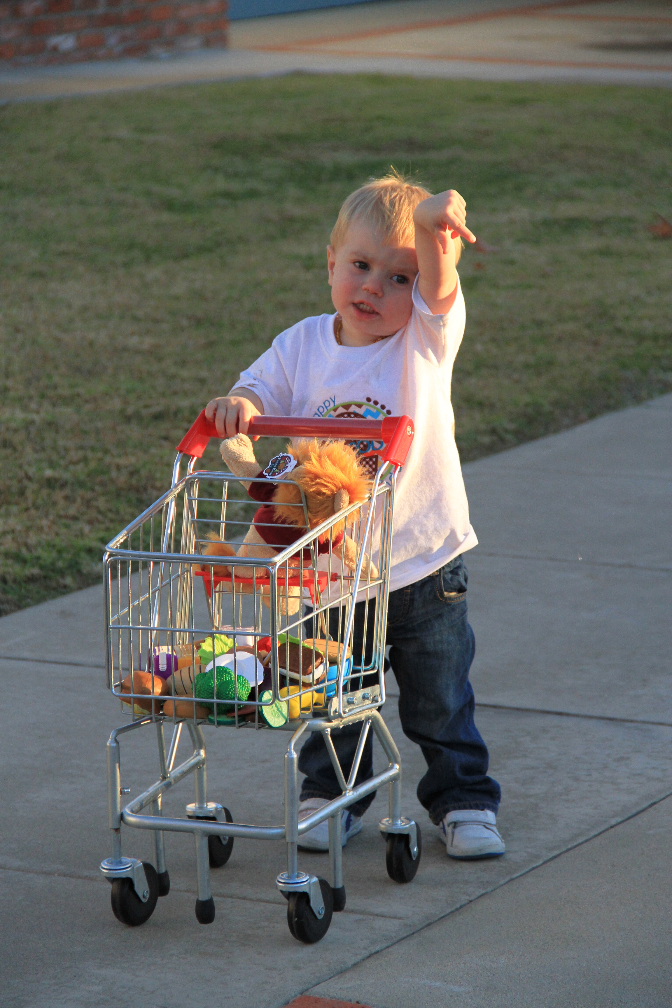 Jacob pushing his shopping cart with his LMU lion riding in the baby seat!