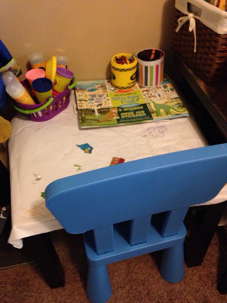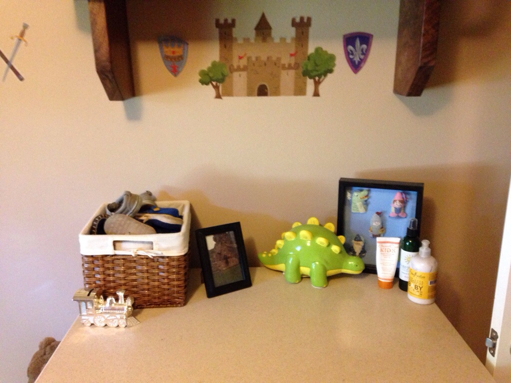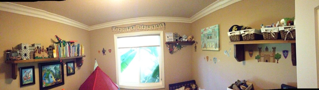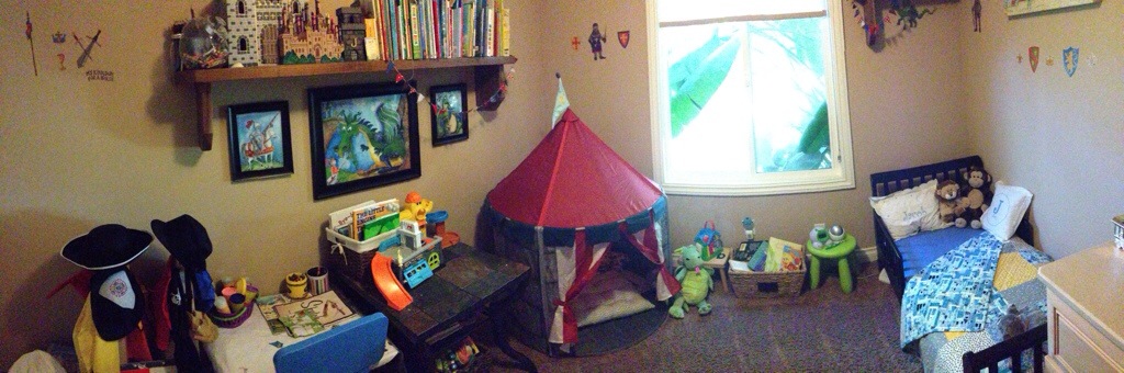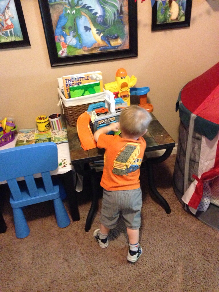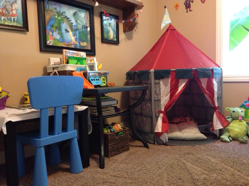 He has his toddler bed with the beautiful quilt from my friend Emily and her mom, Patti (hi!) with his Build-a-bear monkey that has Josh’s and my voice in it telling him we love him. He has tons of books, most of which I’ve tried to make accessible for him since he loves them. He has a little table and chair covered in recycled plan paper so he can color or sticker to his heart’s content. He can hide in his castle tent. Josh and Jacob made the rack (like a coat tree) this weekend that is holding his fun boy dress-up clothes (construction vest and tool belt, pirate hat, glasses, fedora, fireman suit…)