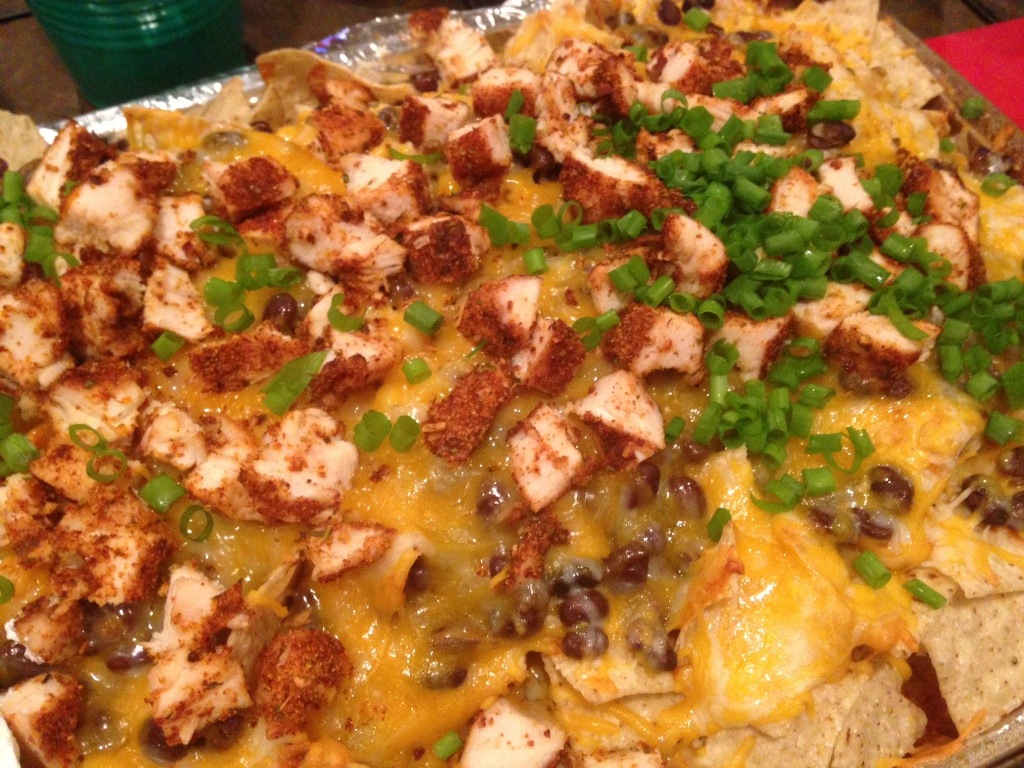 Layers of chips, Trader Joe’s enchilada sauce, Mexican rice, black beans, and cheese topped with chicken covered in taco seasoning and also cooked on the Traeger. Lastly, home-grown green onion from my garden and sour cream top them off. Smoky goodness!