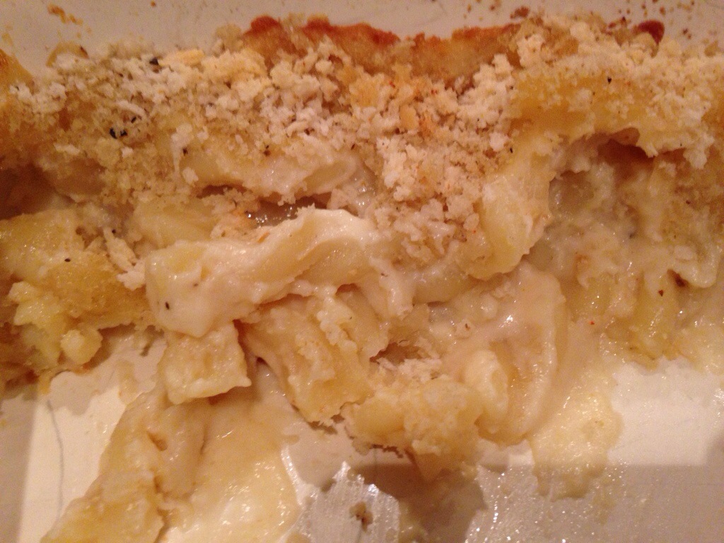 The finished plate with steamed veggies and baguette, along with smoked Mac and cheese: