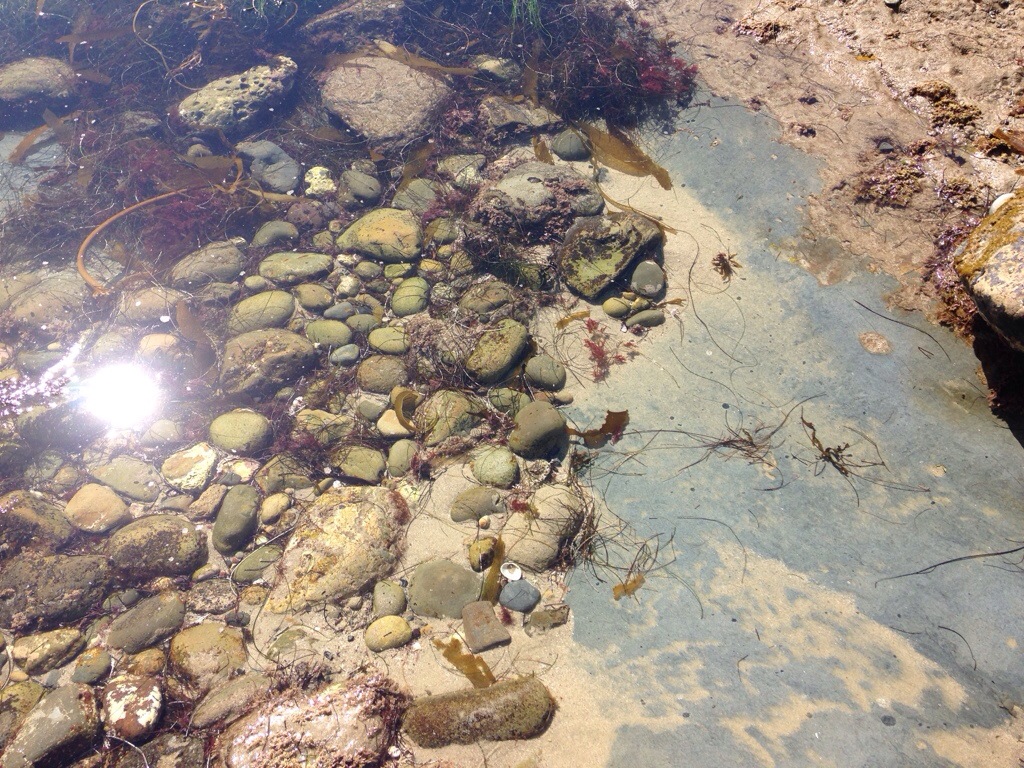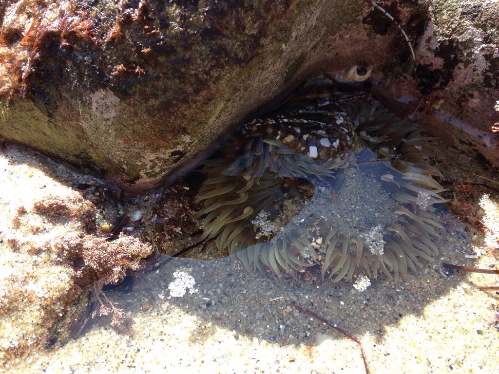 Tuesdays in Laguna are pretty mellow, so off we went. We snagged a parking spot easily, but since when is it $2.25 an hour?!? Your quarter doesn’t get you far. And the meters take credit cards…that’s when you know you are in trouble. Anyway, we went to Heisler beach, just because it’s pretty and the rocks make great tide pools. We saw a lot of sea anemones, some tiny fish, a crab, and a lot of barnacles and mussels.