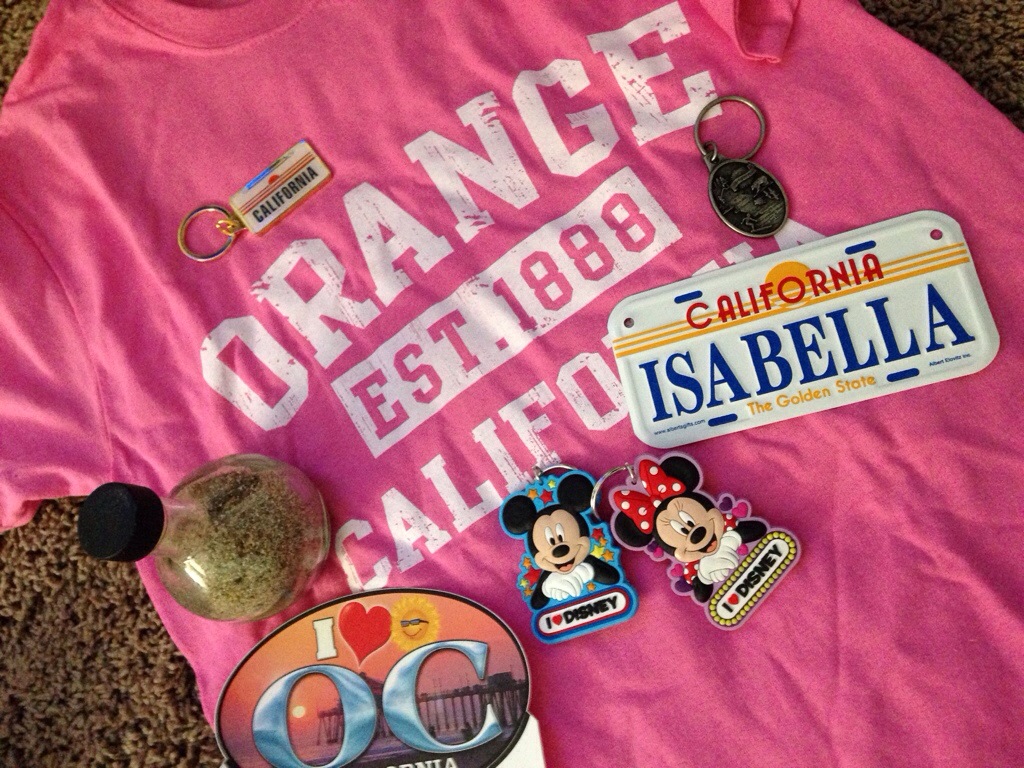 Souvenirs include a t-shirt from Orange (my city), sticker and keychains from the area, keychains from Disneyland, a bottle of beach sand, and California license plate with her name on it.