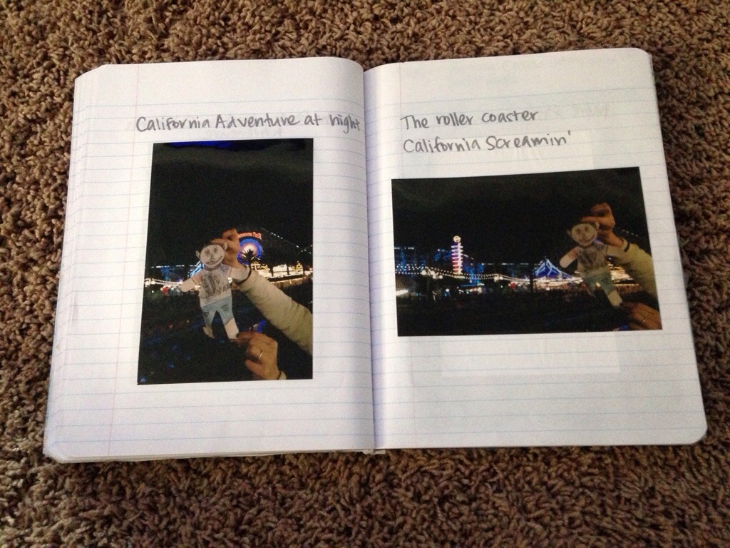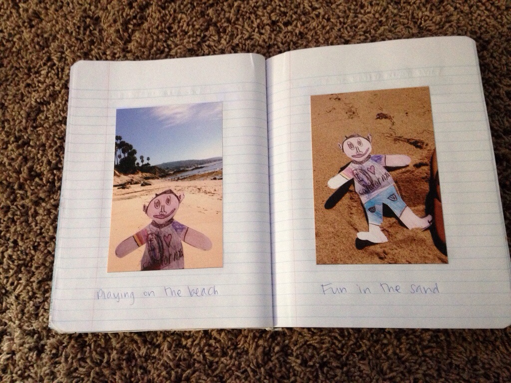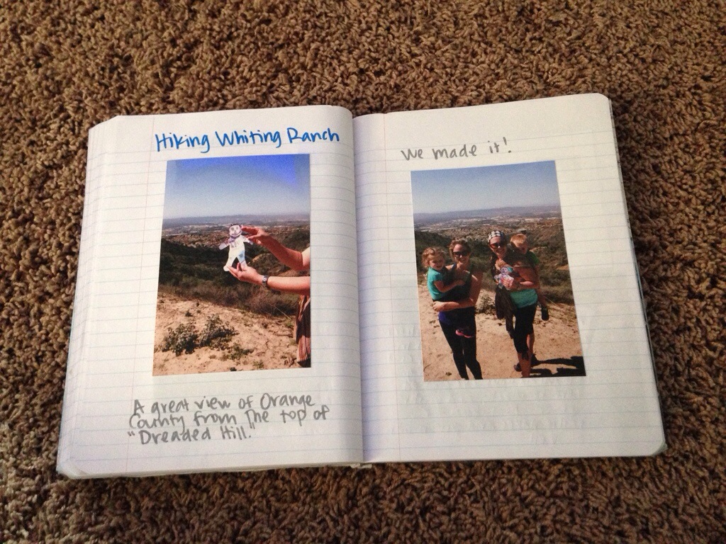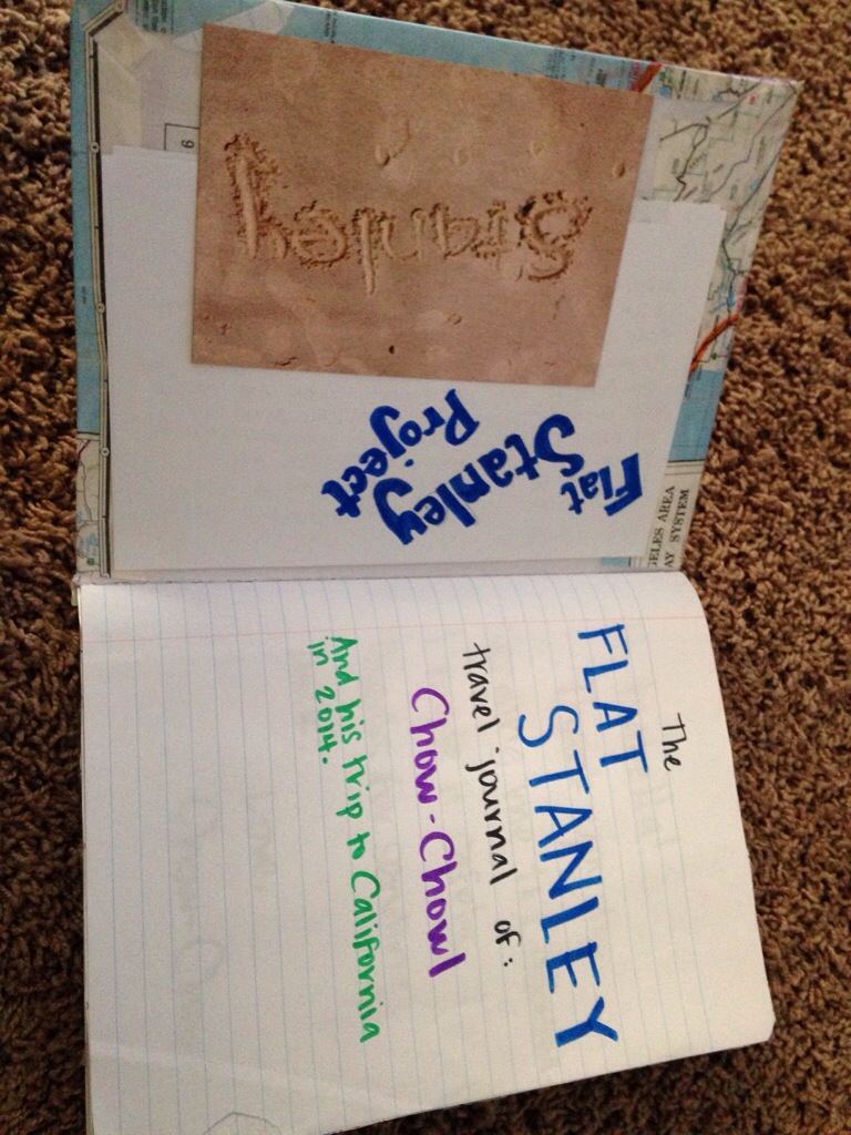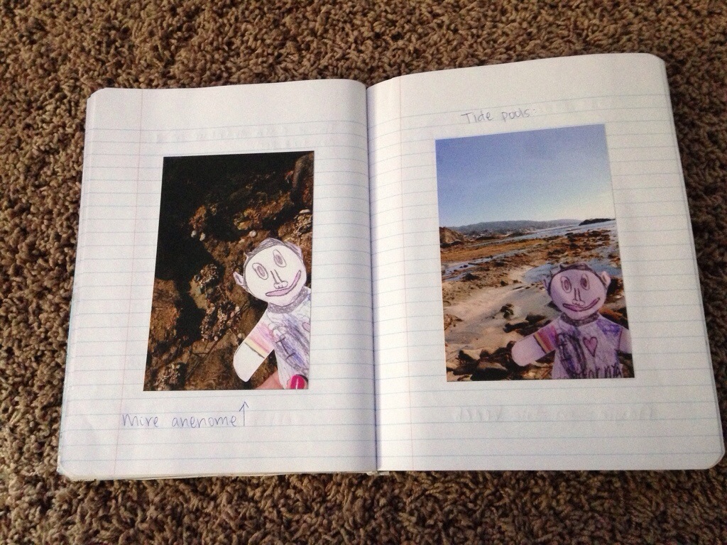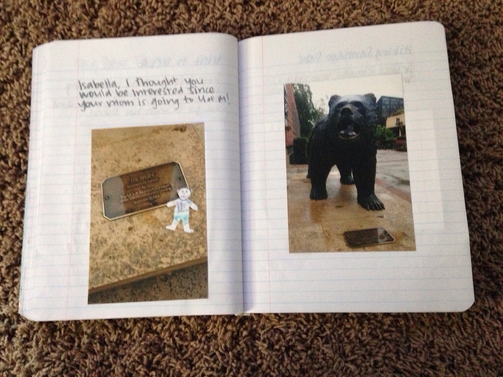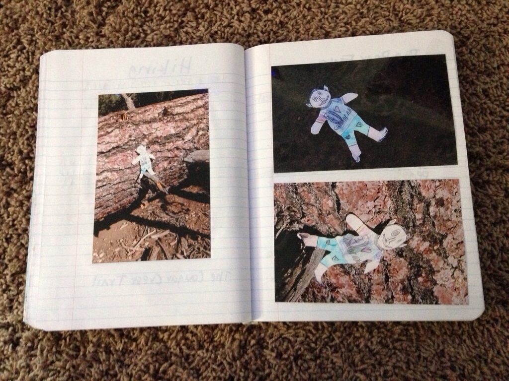 My advice: make several copies of Stanley as he gets pretty abused along the way. I had four Stanleys. 🙂 Buy a composition book to make the journal. I wrapped mine with a “recycled” map of California. Make yourself a kit for Stanley: place him in a sandwich bag along with a roll of scotch tape. That way he can be stuck to things. He will move quite a bit in the wind, so tape can help him stick to your hand also.