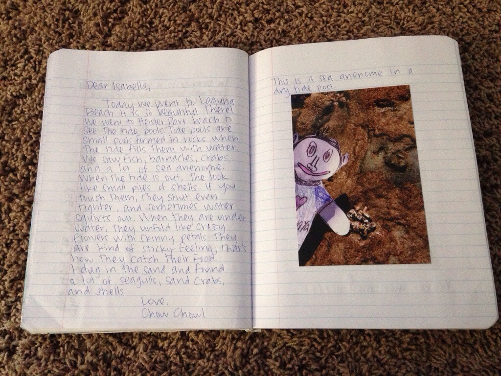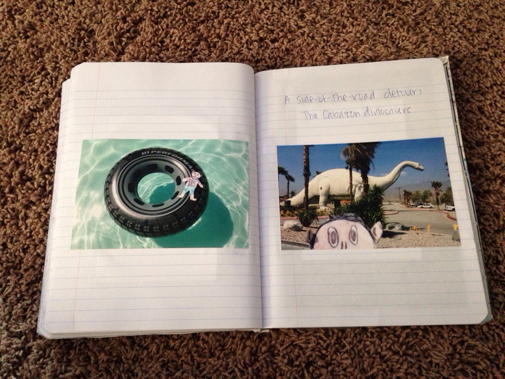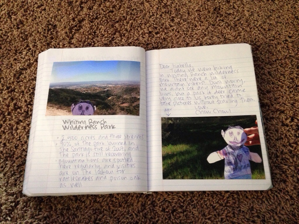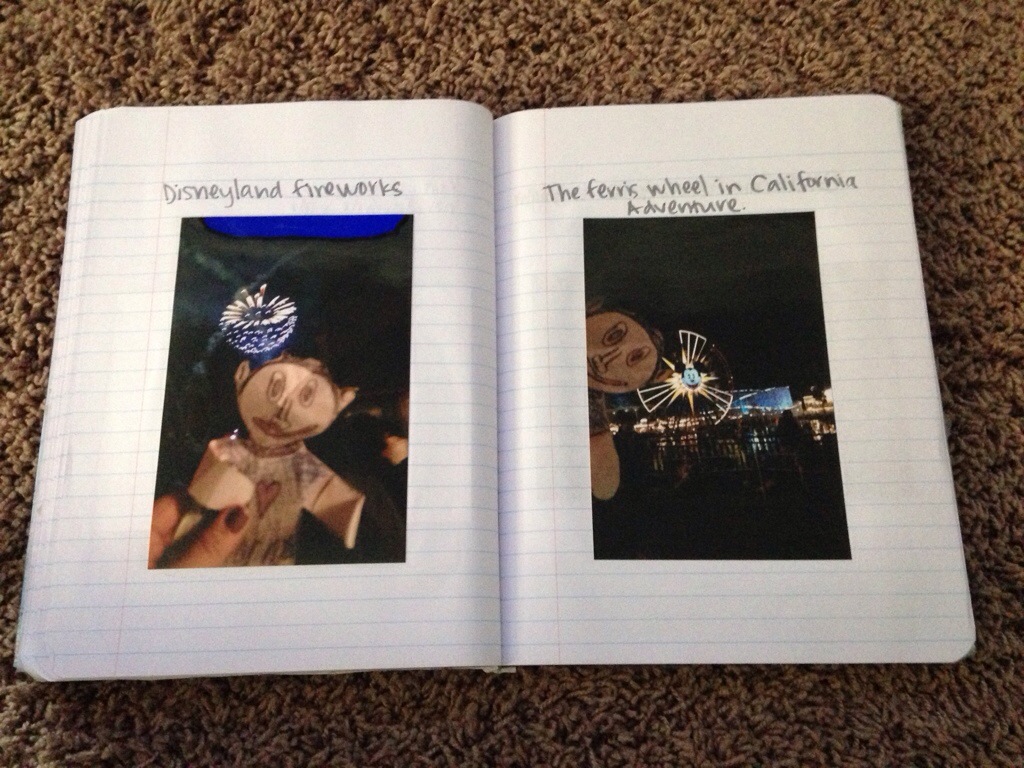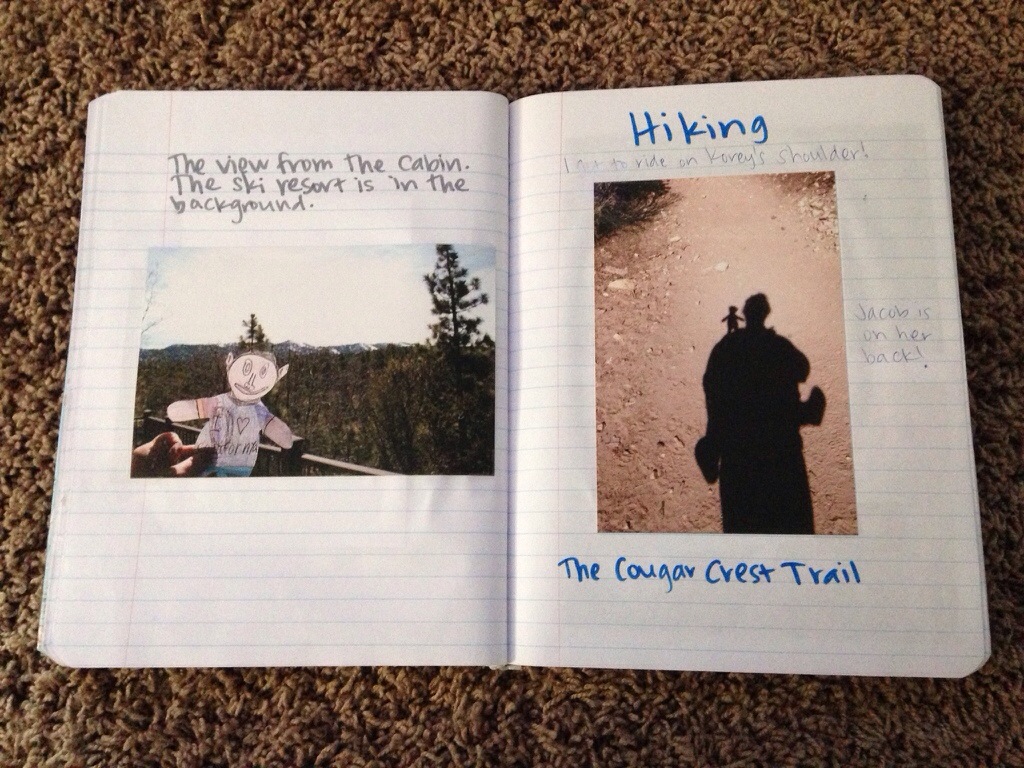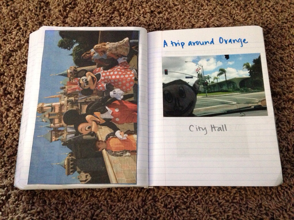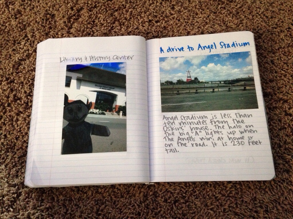 My advice: make several copies of Stanley as he gets pretty abused along the way. I had four Stanleys. 🙂 Buy a composition book to make the journal. I wrapped mine with a “recycled” map of California. Make yourself a kit for Stanley: place him in a sandwich bag along with a roll of scotch tape. That way he can be stuck to things. He will move quite a bit in the wind, so tape can help him stick to your hand also.