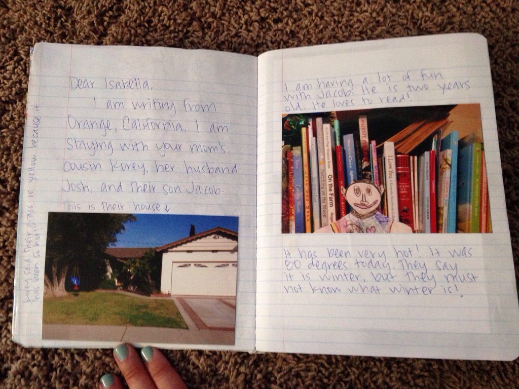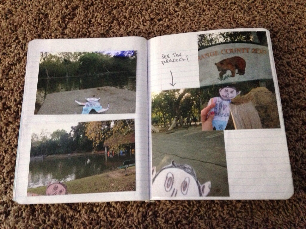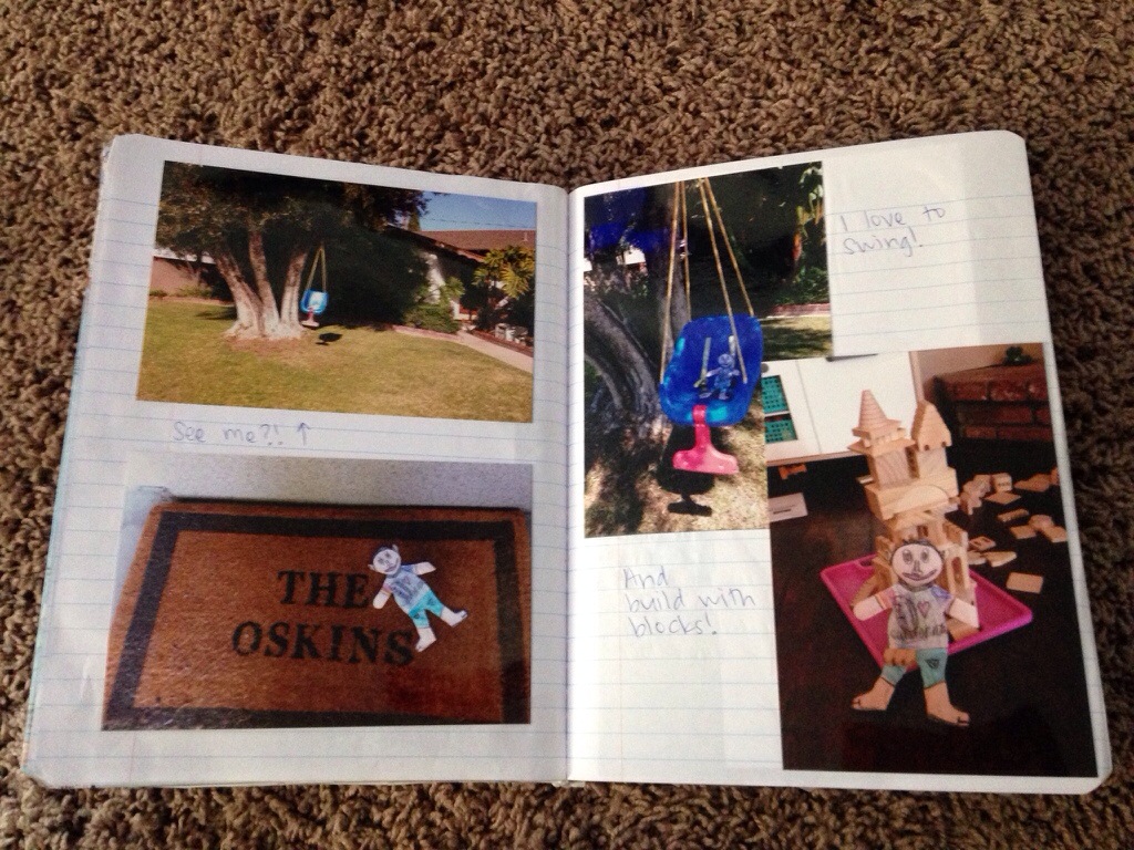 My cousin Jennie’s daughter sent me Flat Stanley, a project for her second-grade class. There is a book of the same name in which a boy is flattened under a bulletin board and then, because he is flat, sent all around the world in an envelope to explore it. I was really excited to “host” him! I went online and couldn’t find a lot of examples, so I’m going to post the whole book in hopes that it will help other Flay Stanley foster families. 🙂 I took him around with me for almost two months.