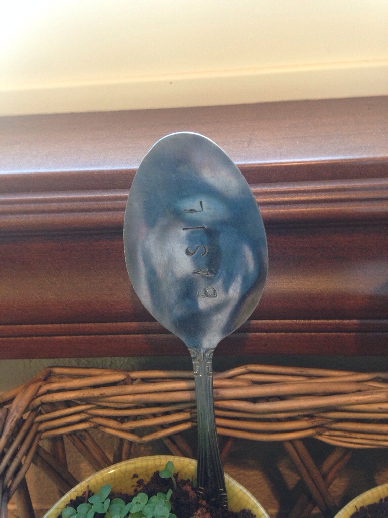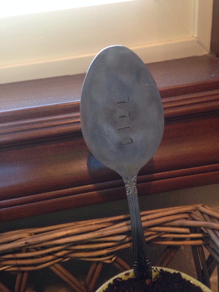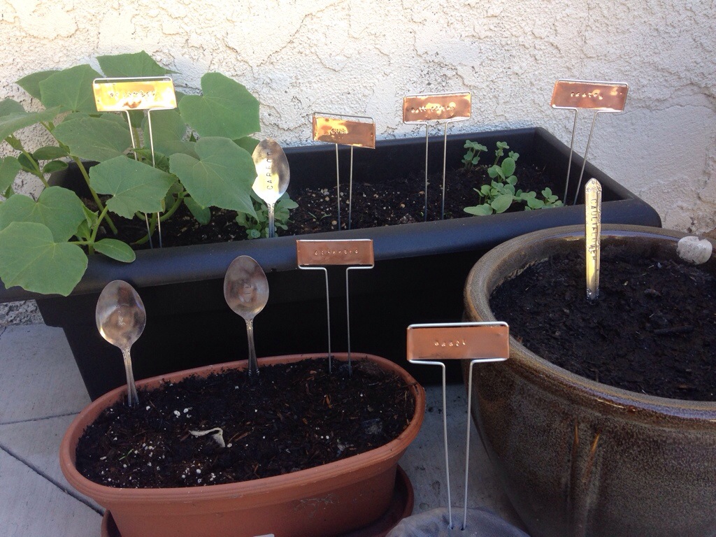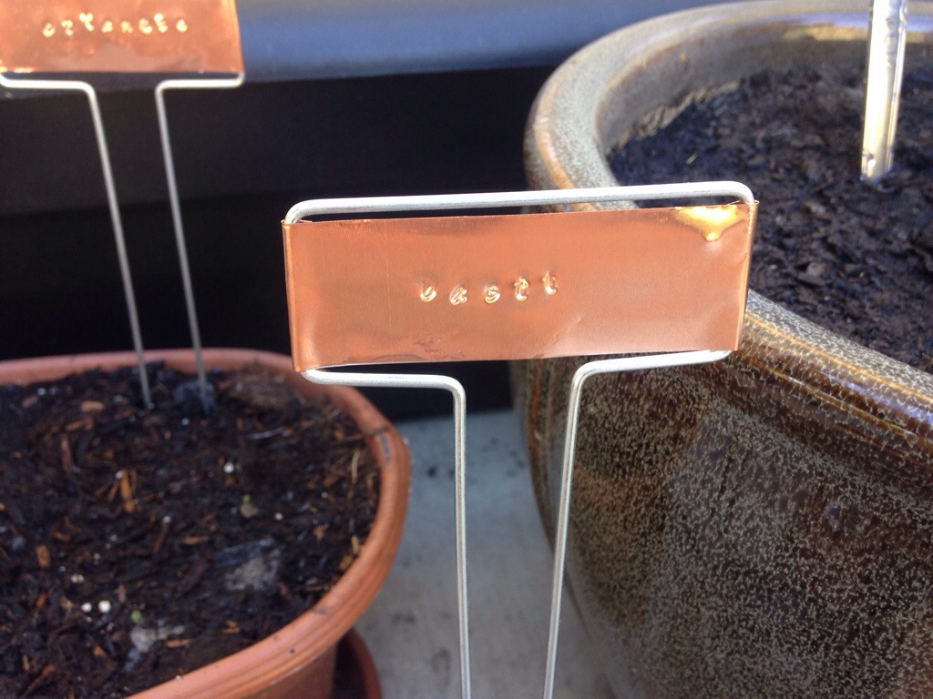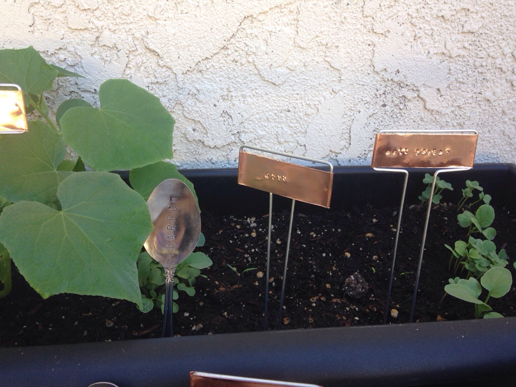 Then I took out my metal stamps and went to town. It was very difficult to stamp on the flattened spoon portion. I had much more luck, on my last try, stamping the handle of a knife (all the other handle styles were too narrow). As with my other metal stamping projects, I colored the letters in with a sharpie and removed the excess with rubbing alcohol. I also metal stamped these pretty copper plant markers from my mother in law. They barely needed any pressure to stamp.