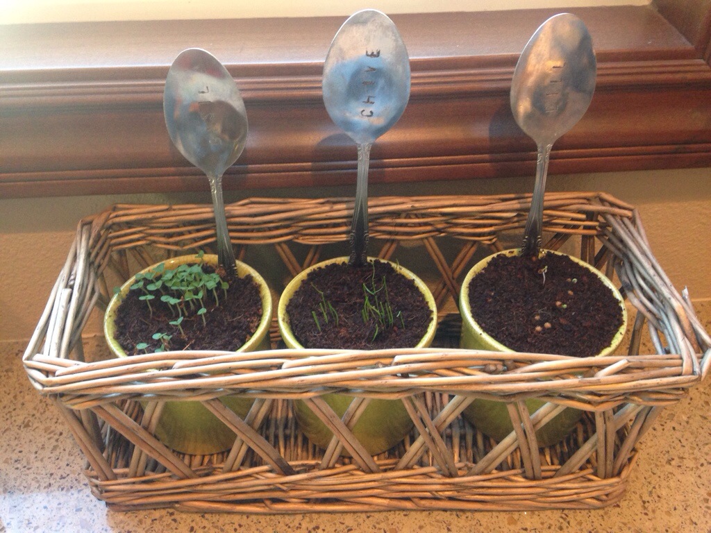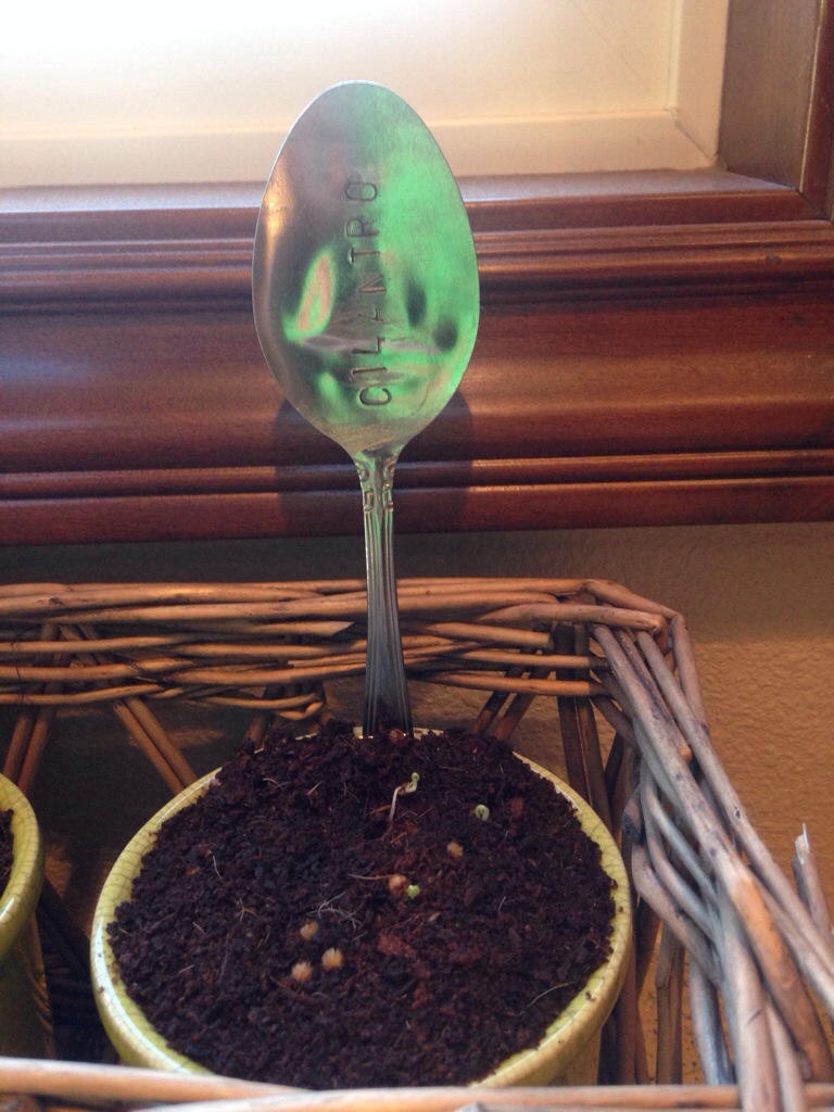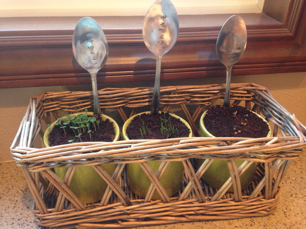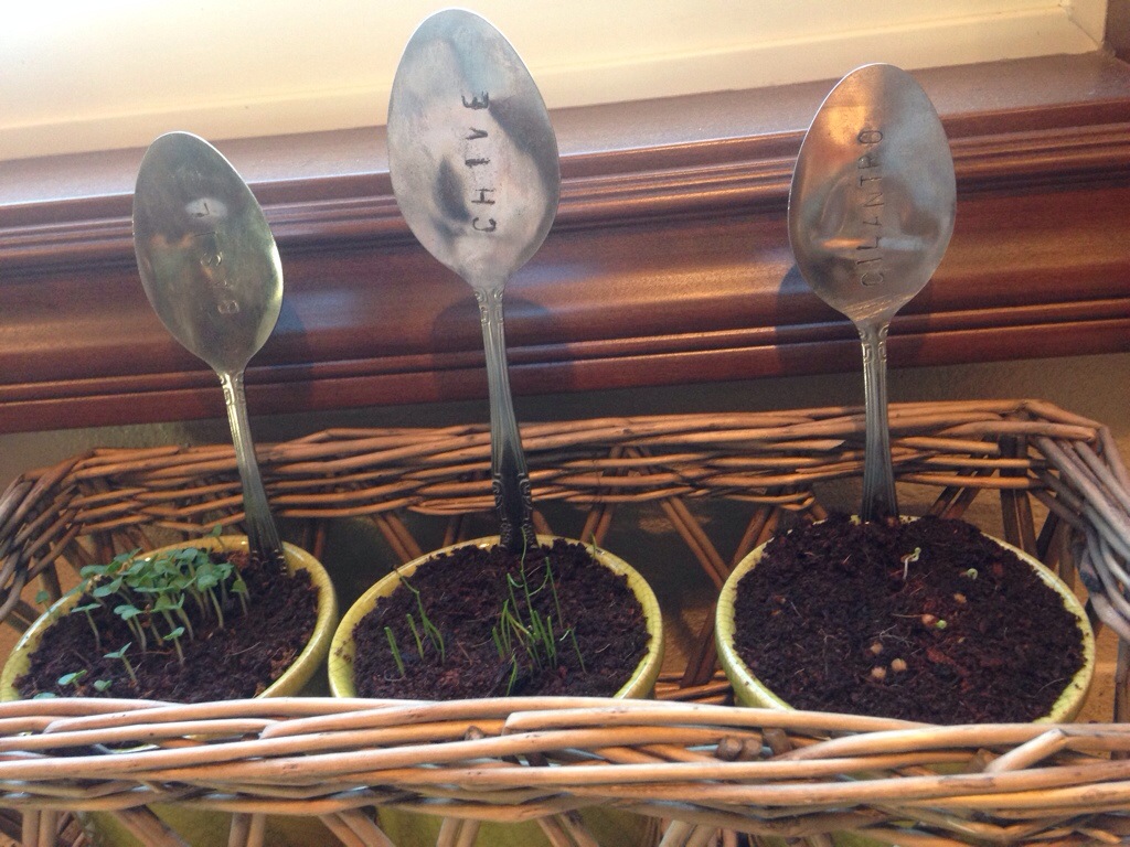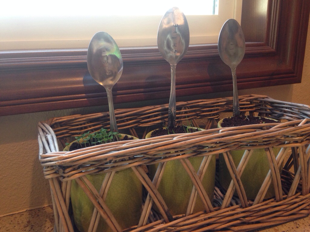 Then I took out my metal stamps and went to town. It was very difficult to stamp on the flattened spoon portion. I had much more luck, on my last try, stamping the handle of a knife (all the other handle styles were too narrow). As with my other metal stamping projects, I colored the letters in with a sharpie and removed the excess with rubbing alcohol. I also metal stamped these pretty copper plant markers from my mother in law. They barely needed any pressure to stamp.