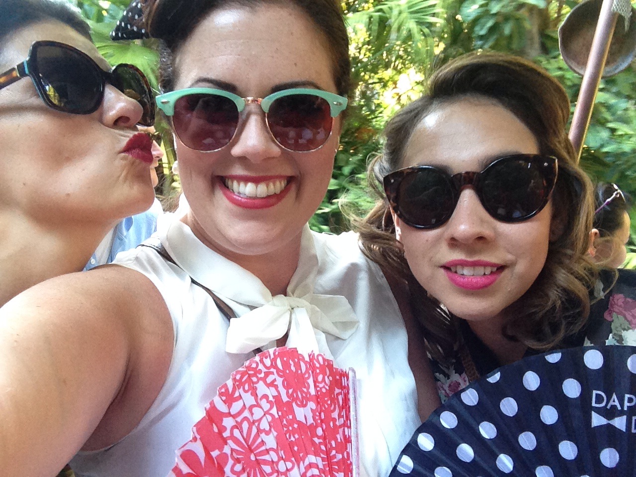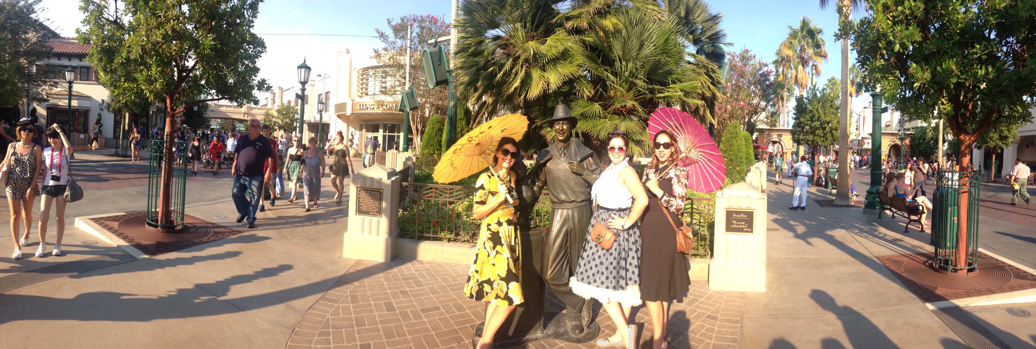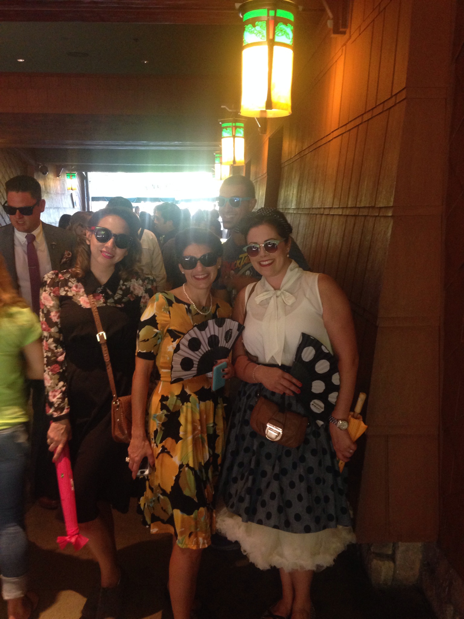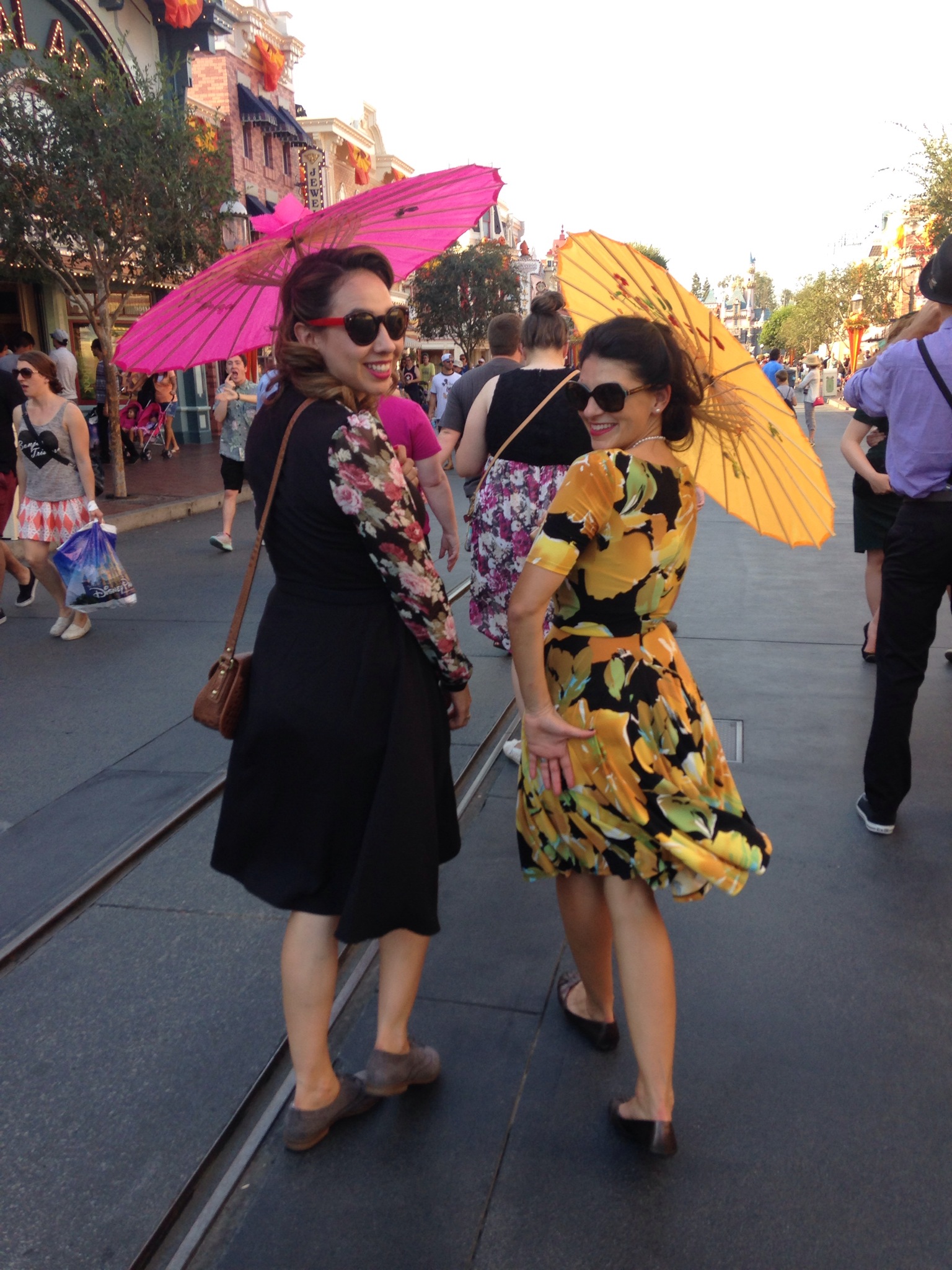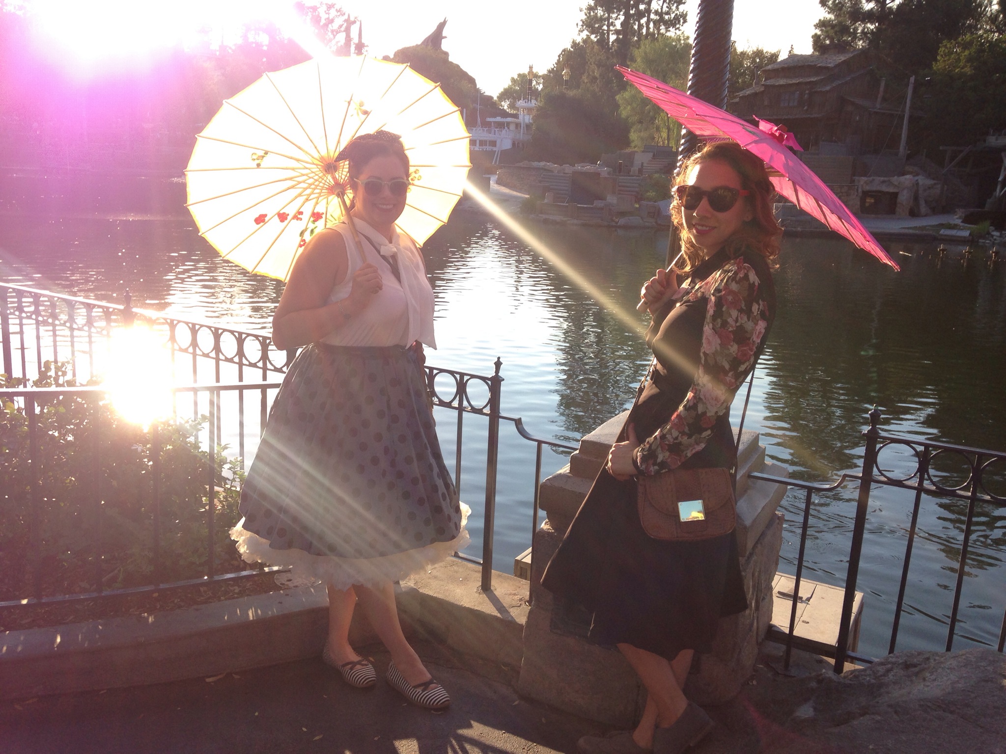 Dapper Day is an unofficial Disneyland celebration day in which people dress up, usually vintage, and go to the park. It started to honor Walt Disney’s original concept drawings of Disneyland and how he imagined guests dressing. It has expanded into anything dressy/and era of vintage/Disneybounding. Disneybounding is where you dress in something inspired by a character, but more of an homage, not the costume per say. So maybe you wear a blue skirt and white top that any contemporary store would sell with white knee socks and a black headband as a sort of tribute to Alice in Wonderland. Anyway, last year was my first foray into the wonderful holiday and I loved it. (It’s twice a year at Disneyland, but my pass is only valid Monday through Friday, so I cannot attend the spring event which is on a Sunday.) The September event is an evening one, and it is so fun and cute! I went with buddies Samantha and Kasi and we stayed at the Grand Californian hotel. The hotel had fun Dapper events like a vintage pop-up shop and artists making beautiful fashion sketches of you in your attire. It seemed like half the park was dressed up this year! It was really fun. We were stopped a few times by people asking what in the world was going on with the clothes. 🙂