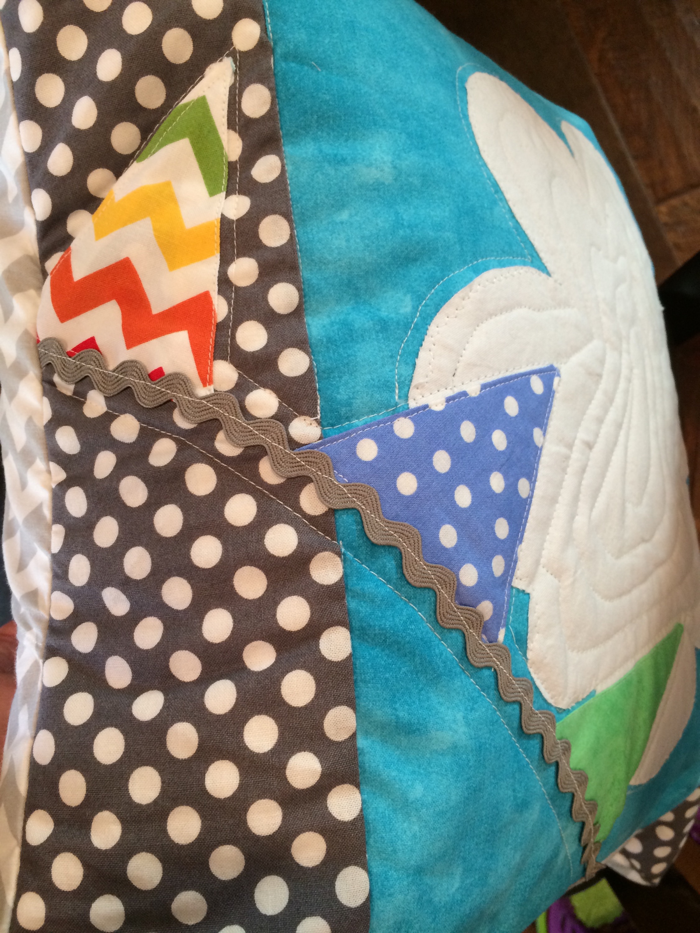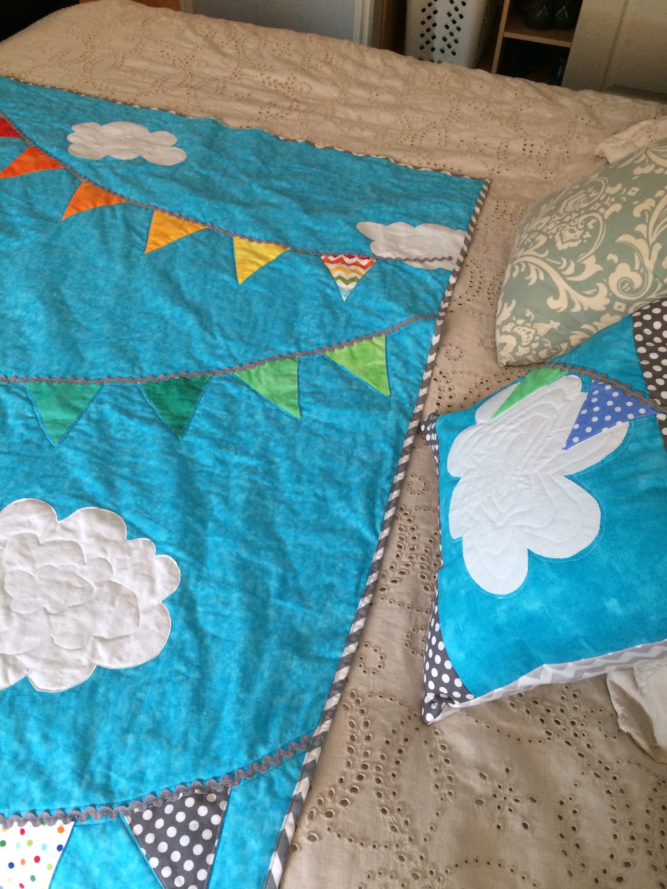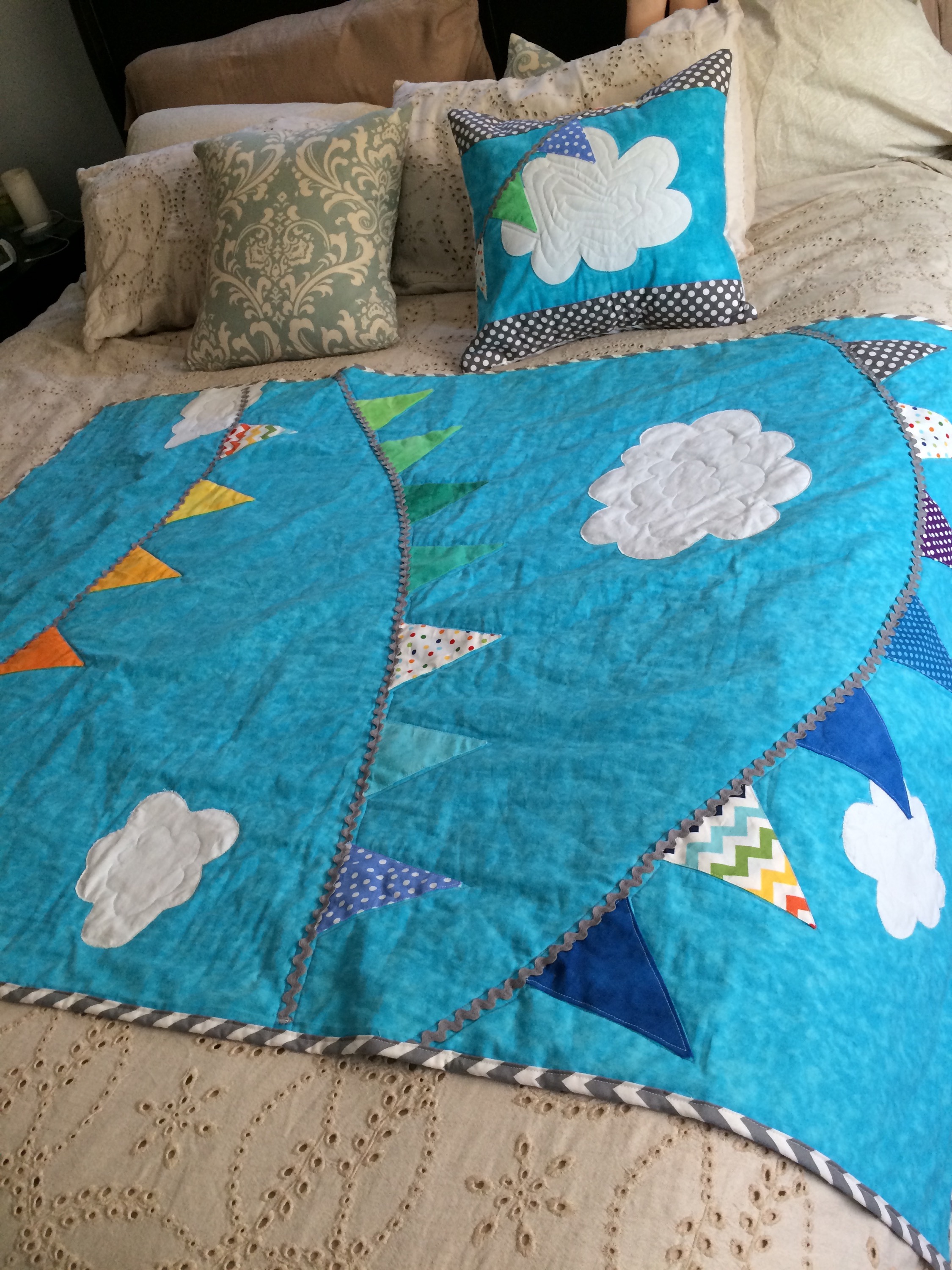 Baby O2’s quilt and matching pillow are done! I’ll try to take some nicer pictures, but here’s what I have for now.