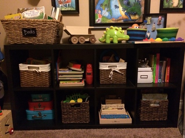 I had the woven crates already, and while they could be bigger, the price was right! I think it will be easier to keep things clean, but also for Jacob to play with what he has in his room. This will be especially important when baby O2 comes.