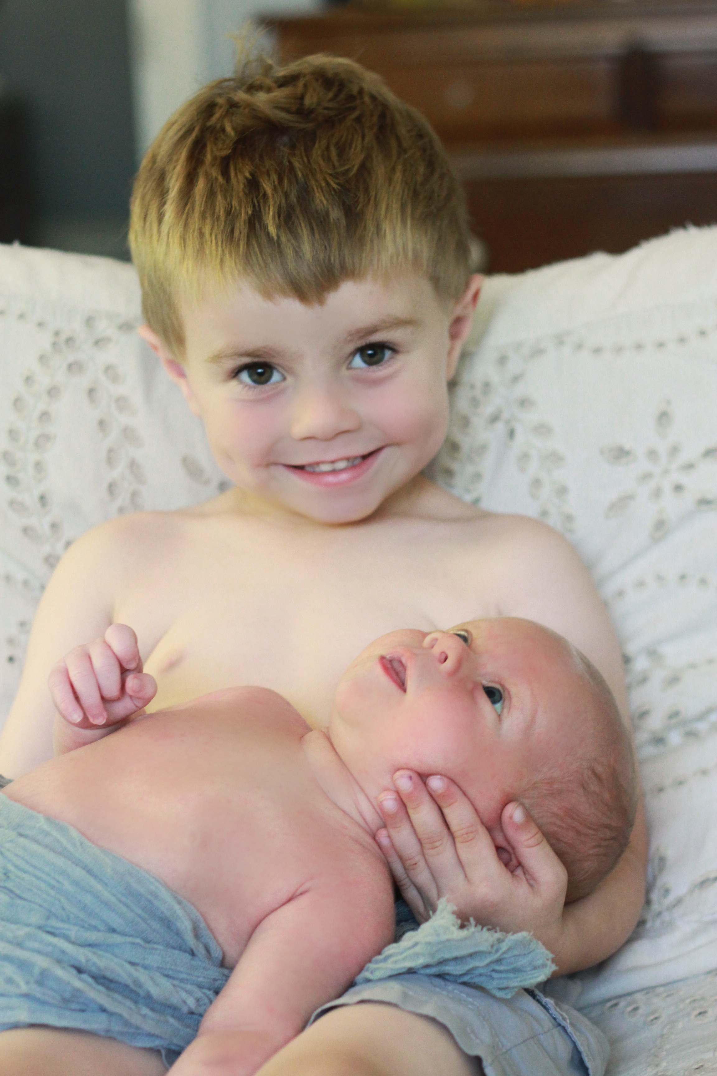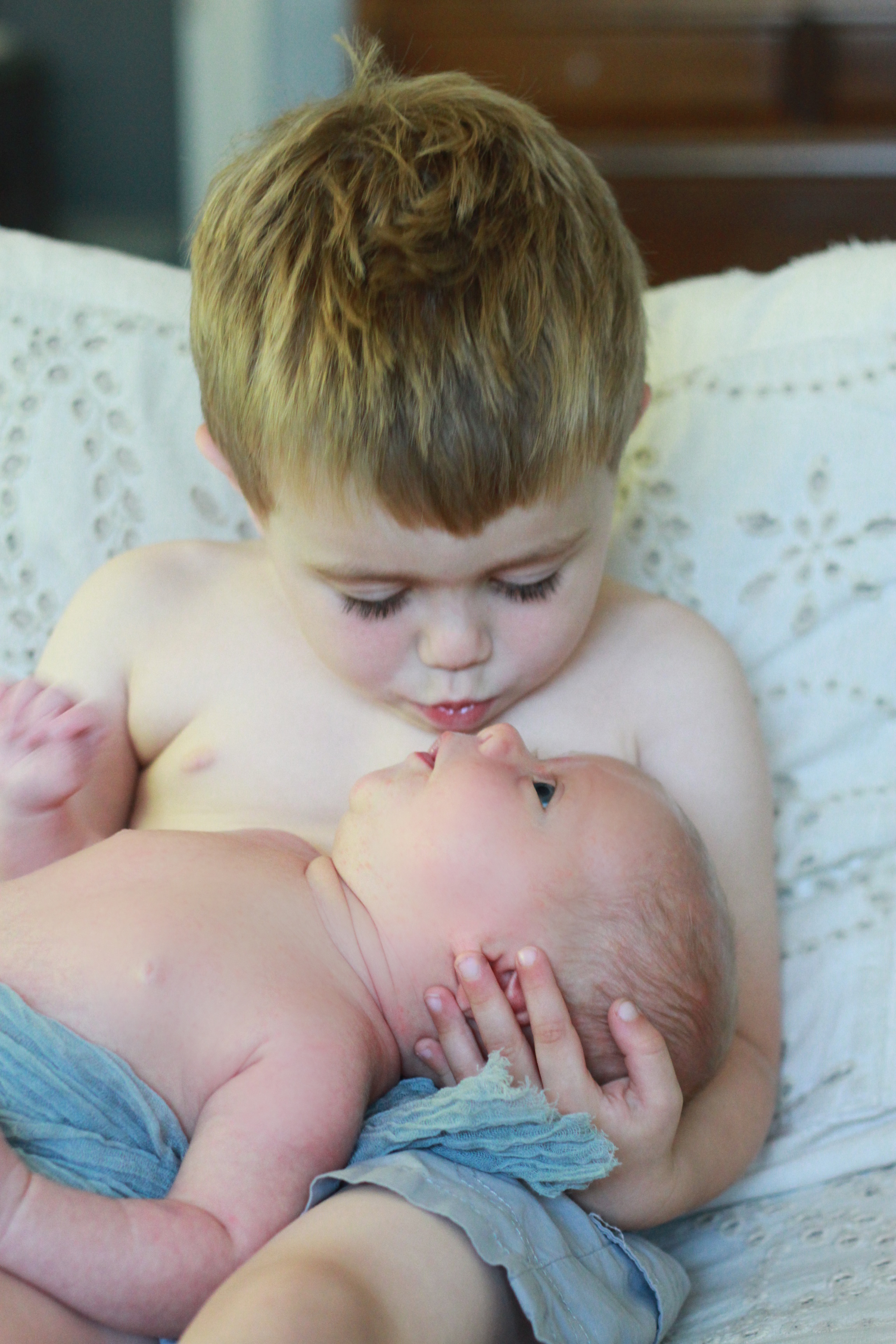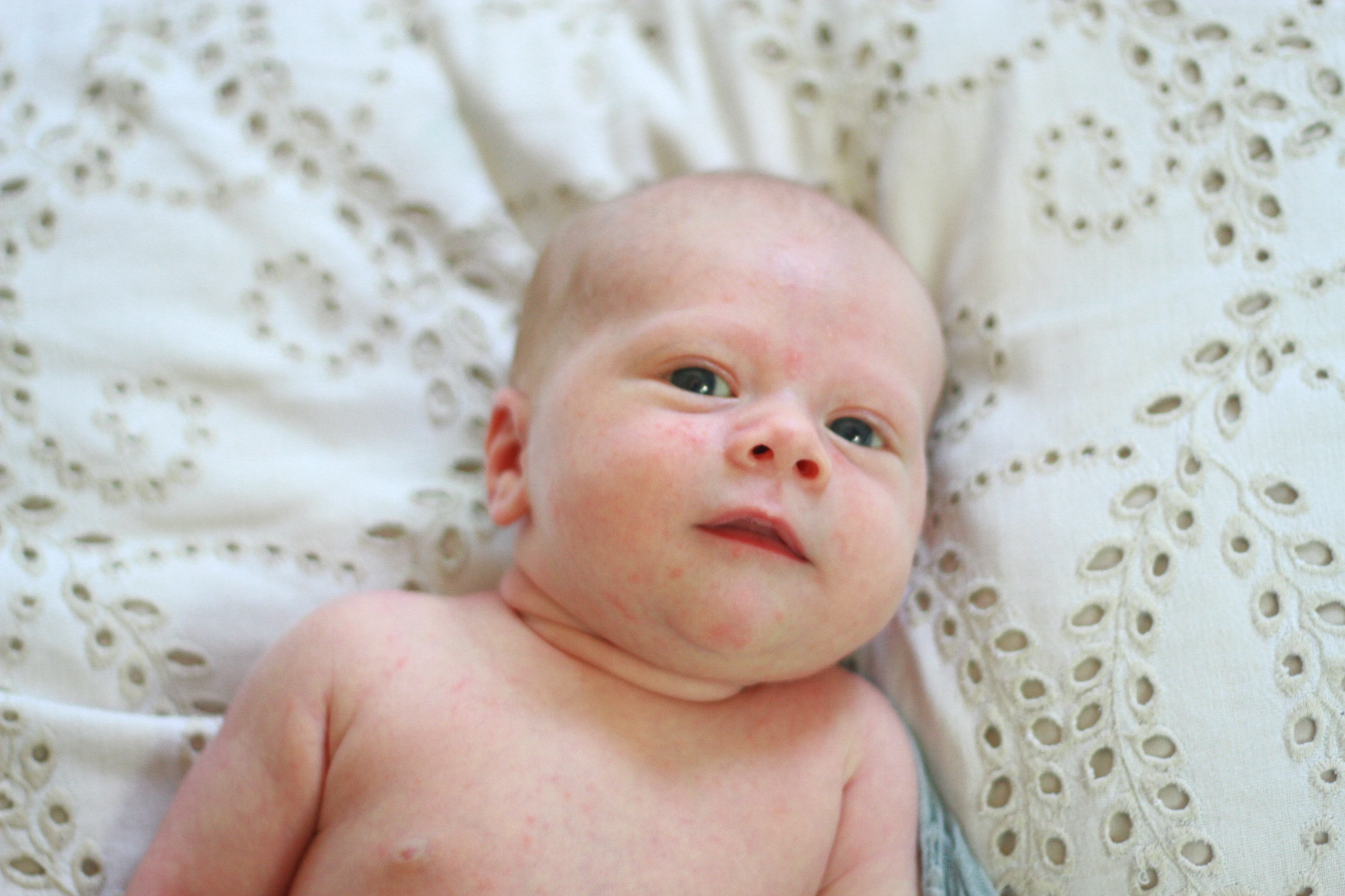 At one month old, we have still hardly heard this baby cry. He has cried out, sure, but to actually cry the way most babies do–to make more than an occasional sound–he doesn’t really do that. I’m not sure if it’s all his personality, or the fact that, as a second-time-arond mom, I don’t leave him much of a reason to. When he does cry out, Jacob will exclaim “oh mommy! Did you know he could get that mad!?” because he’s just such a calm little baby. He has smiled at me twice, which of course is fantastic. He is growing and filling out each day. I can start to see that his limbs and face have become rounder. Born at 7 lb, 7 oz, he now weighs 11 pounds! He has the softest, fluffiest, downy hair, and it comes to a swirl on the back of his head. He still likes to be folded tightly with his knees close to his belly, and lays on my chest like a little frog. When I pick him up from the carseat or pull him from my ring sling he comes all folded up and scrunchy in that delectable way that newborns do. He makes the sweetest noises: squeaks that sound fake in their cuteness, skittery little noises I can’t describe, and contented sighs. He smells like milk and heaven. Oh how I adore staring into his sweet eyes and touching his soft skin. If this is my time capsule of this stage, I hope as I read this one day I can remember those sounds, that smell, the weight of his tiny body, the way his little hands grasp at my neck when I bring him up to my shoulder. I hope as I read this I hear his squeaks and sighs. I hope I never forget.