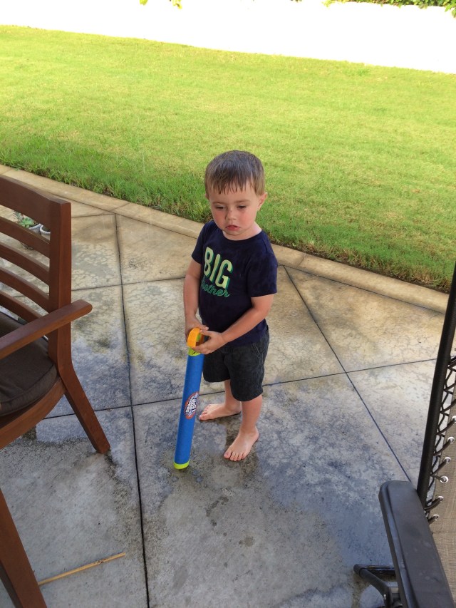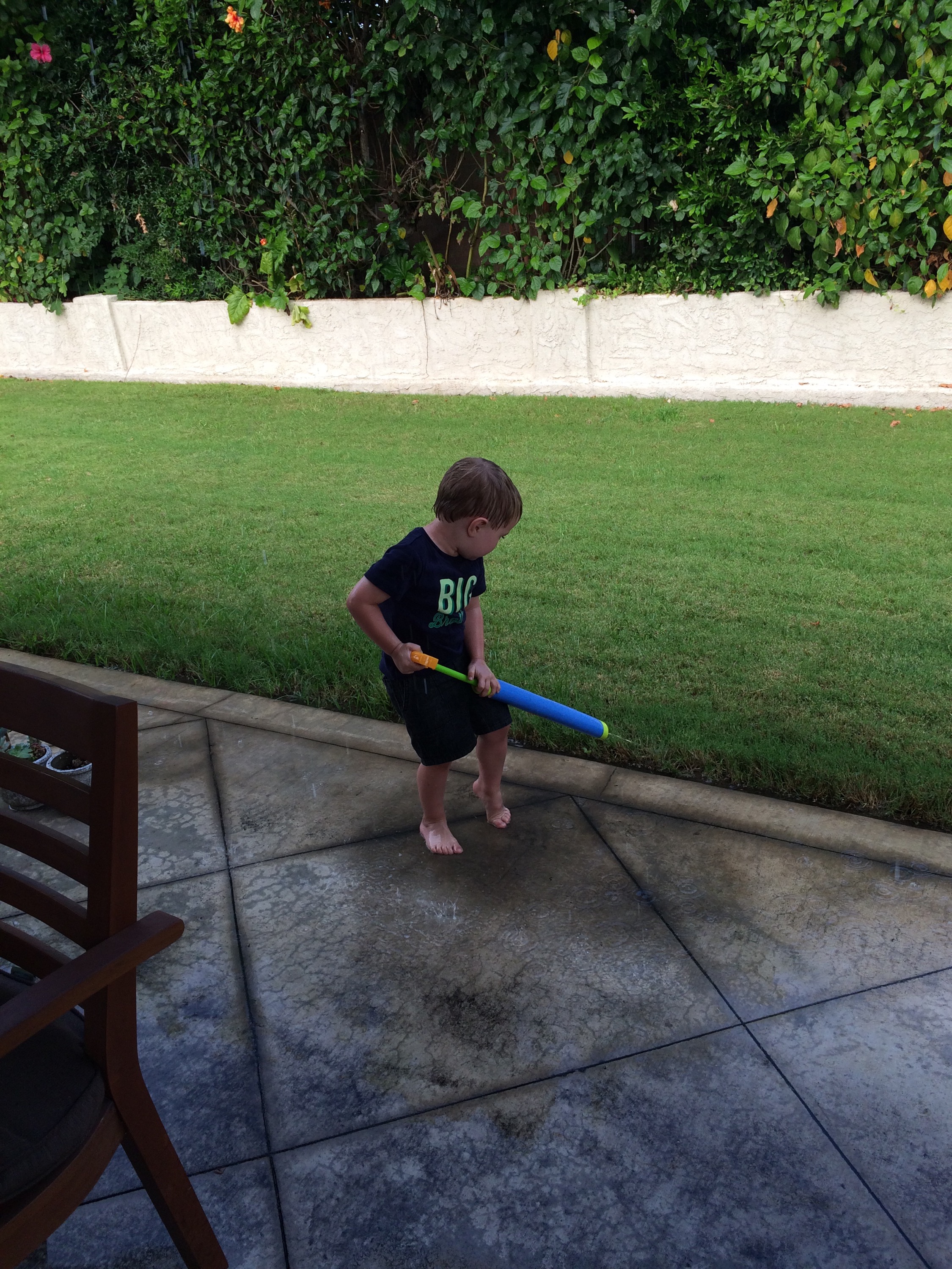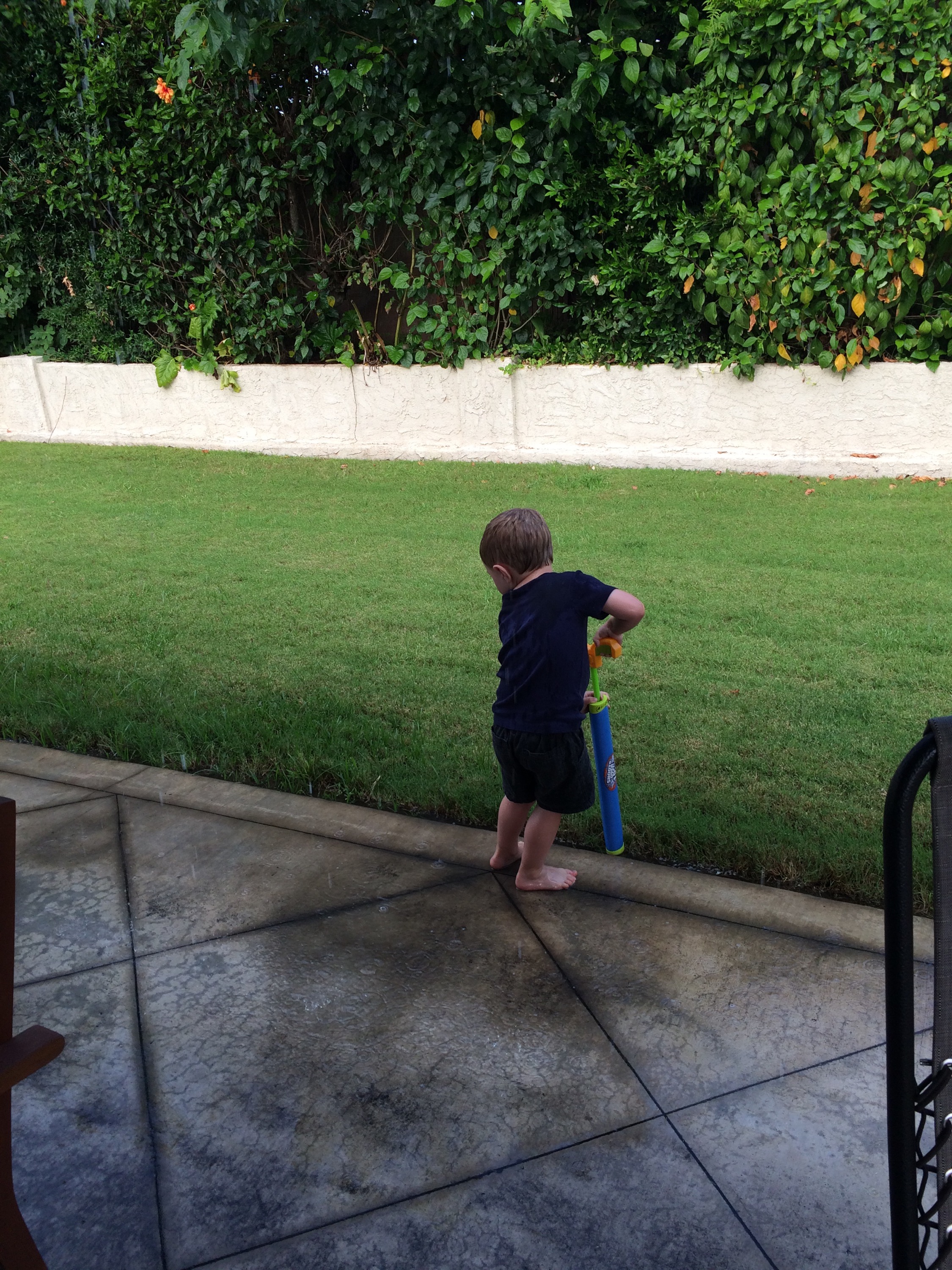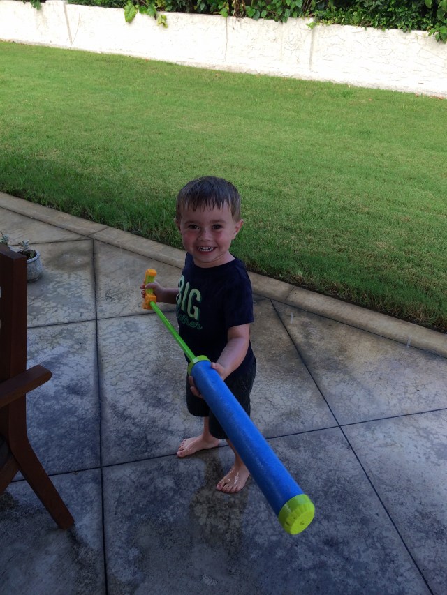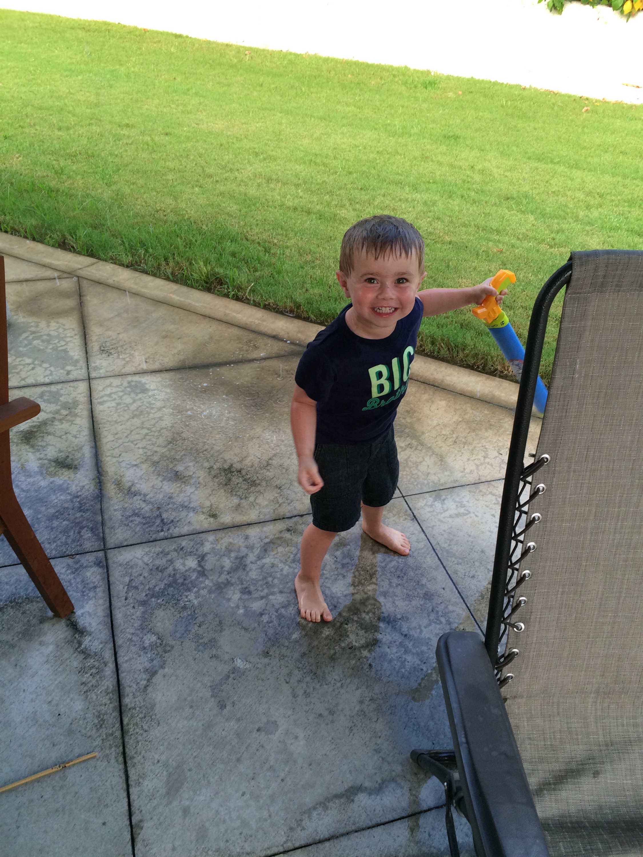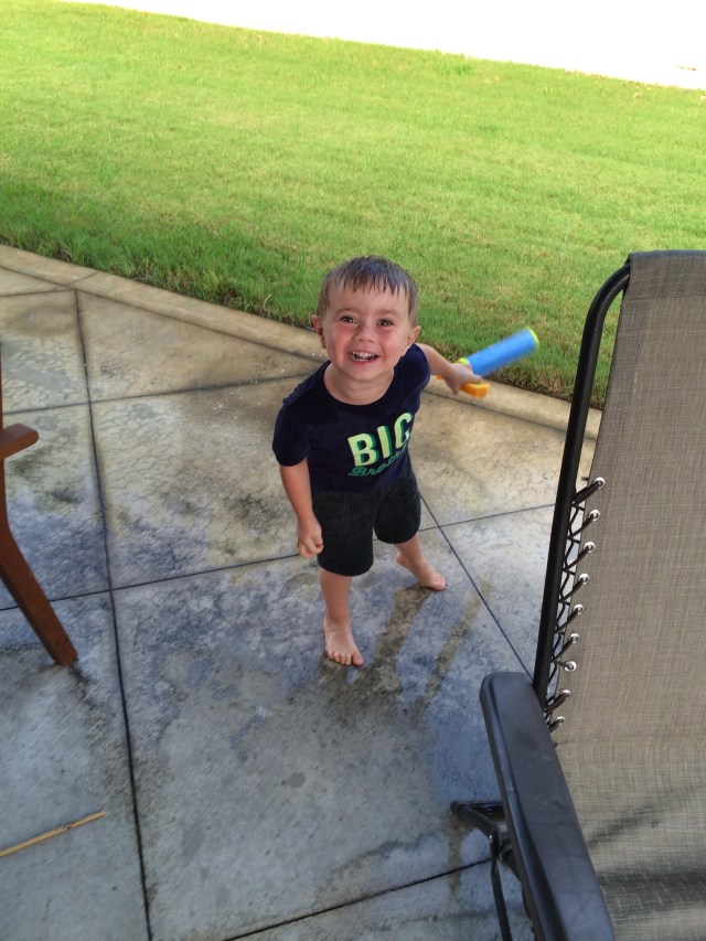 Out of nowhere last weekend, in the midst of some high temperatures, it started to rain. It was the tropical storm type, where the air is thick with moisture and the rain falls in hot drops on your shoulders. It was magic. Jacob made good use of it by filling his squirt gun in a puddle. He danced in the rain and got completely soaked. When was theasg time some rogue weather made you that happy?