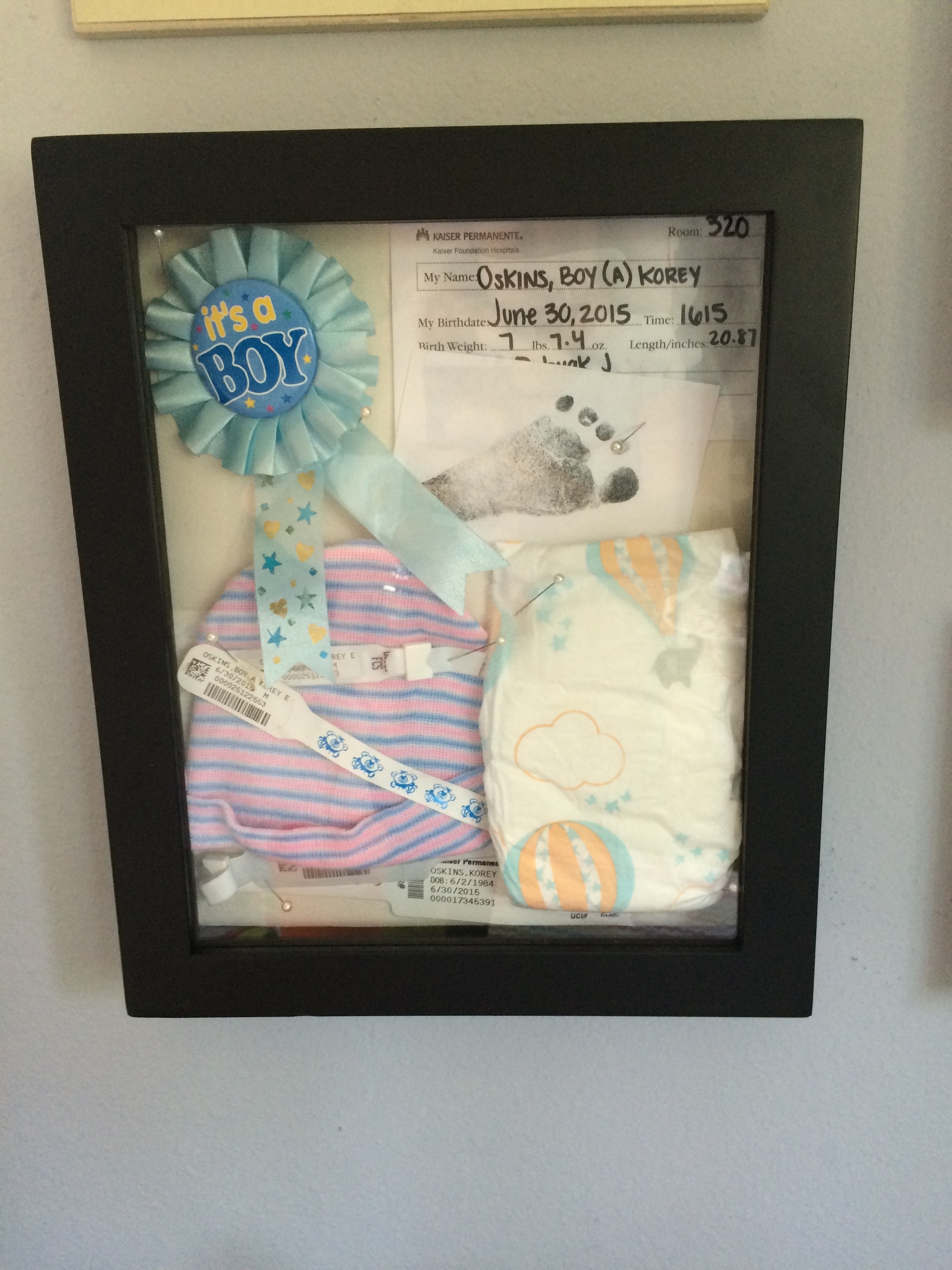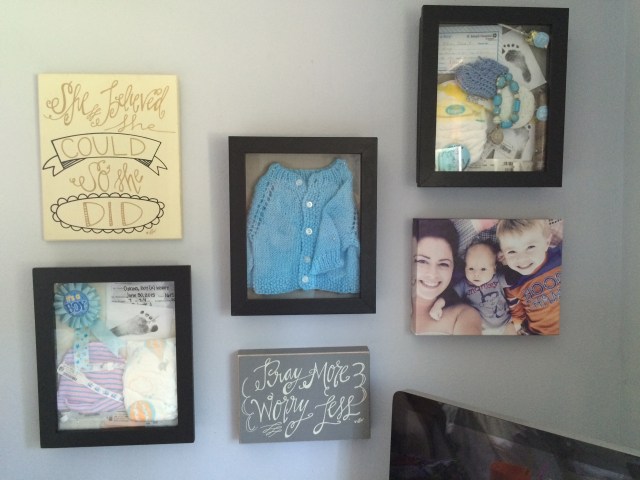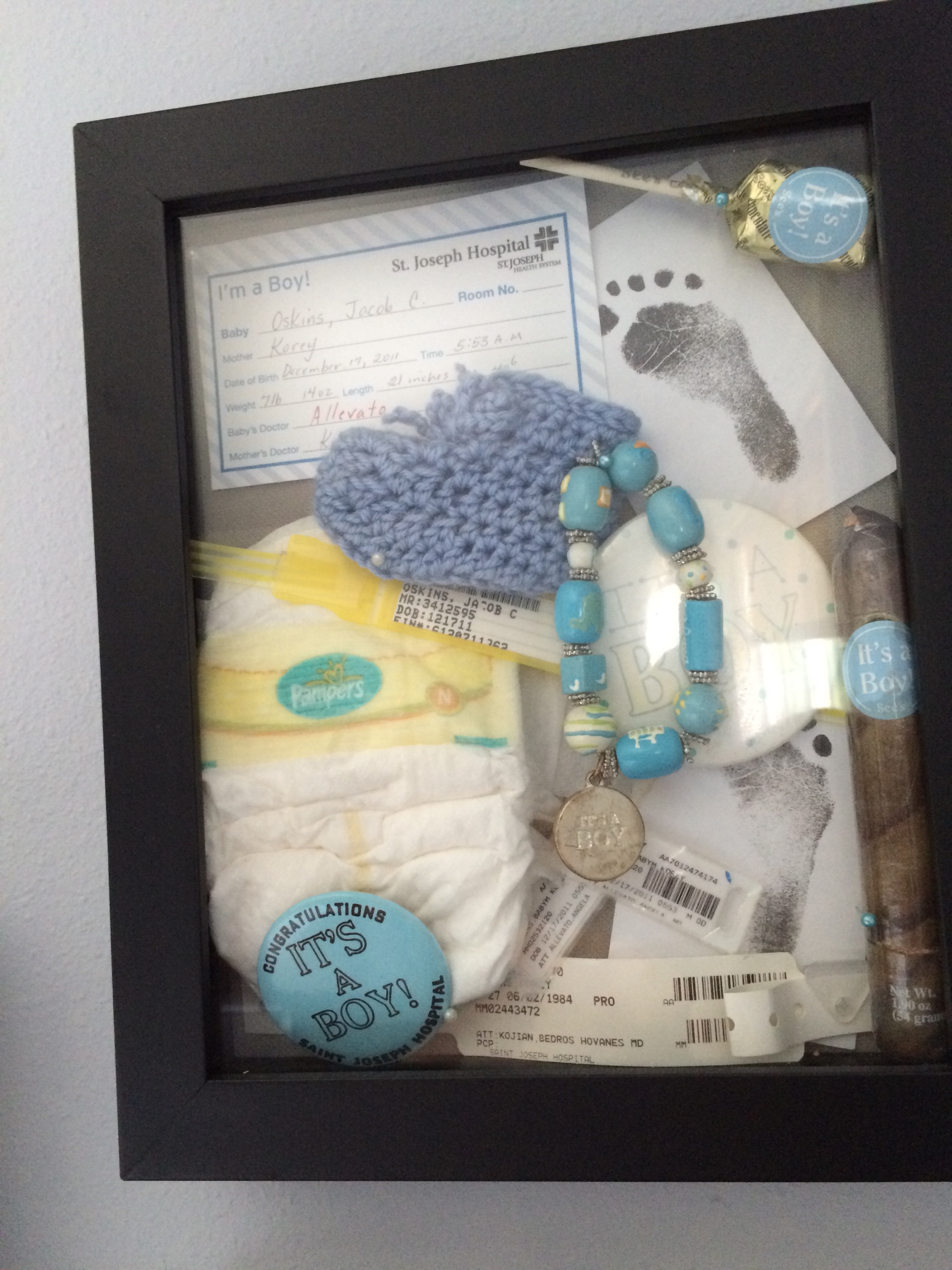 i had made a shadow box frame of Jacob’s newborn mementos, so I made another for Jackson. I also framed a beautiful sweater that my grandmother’s best childhood friend made for Jacob. She has since passed away, but is not forgotten!