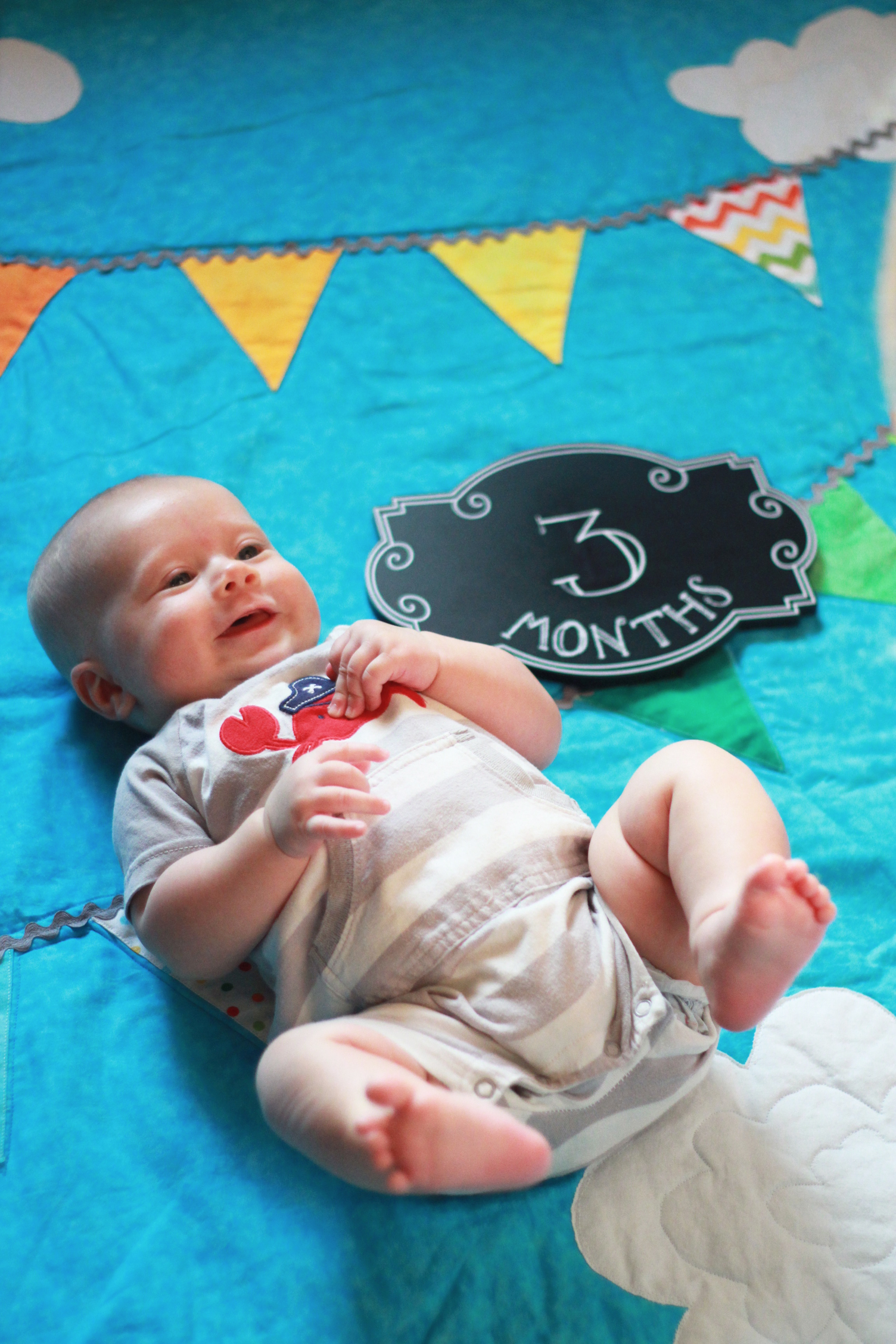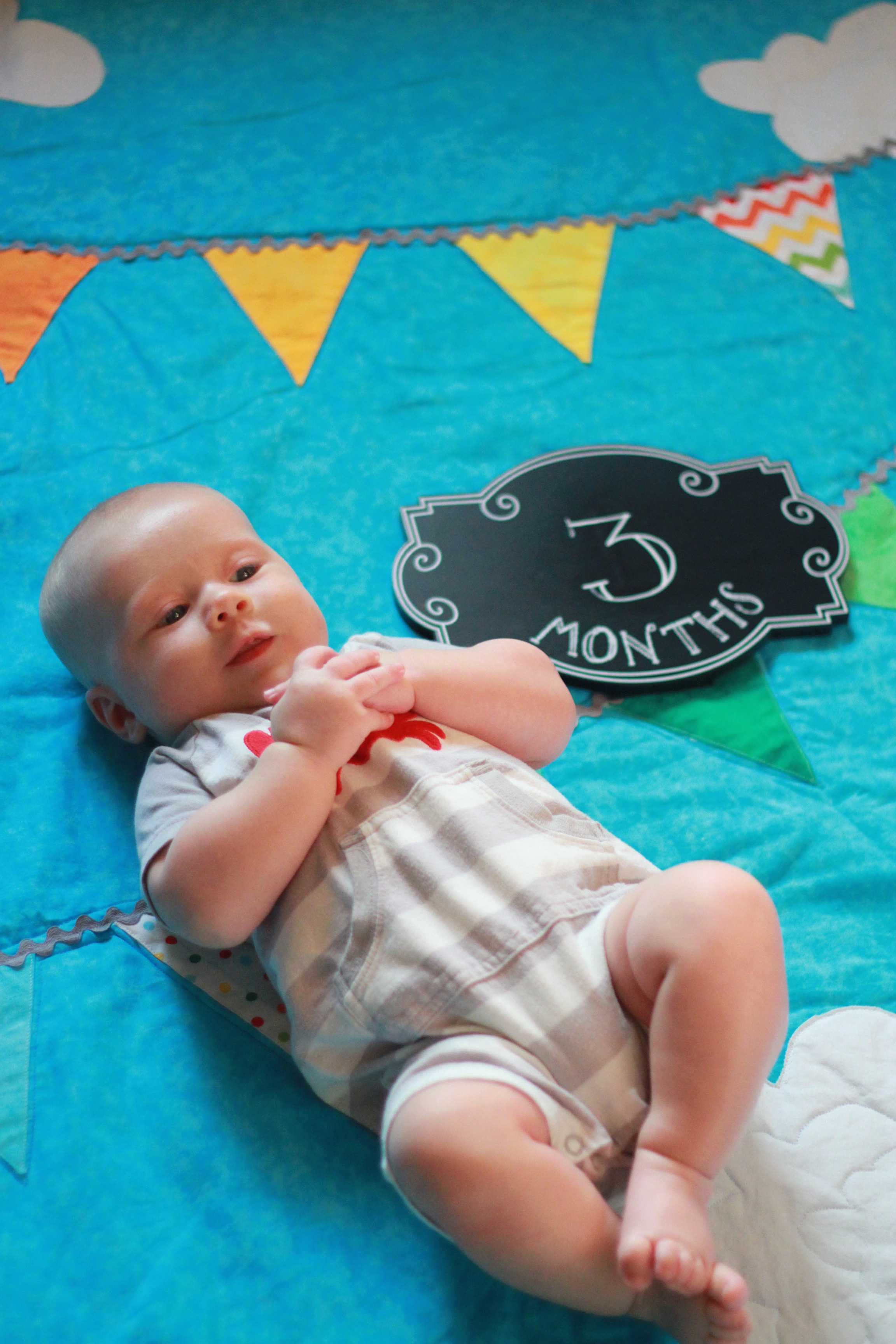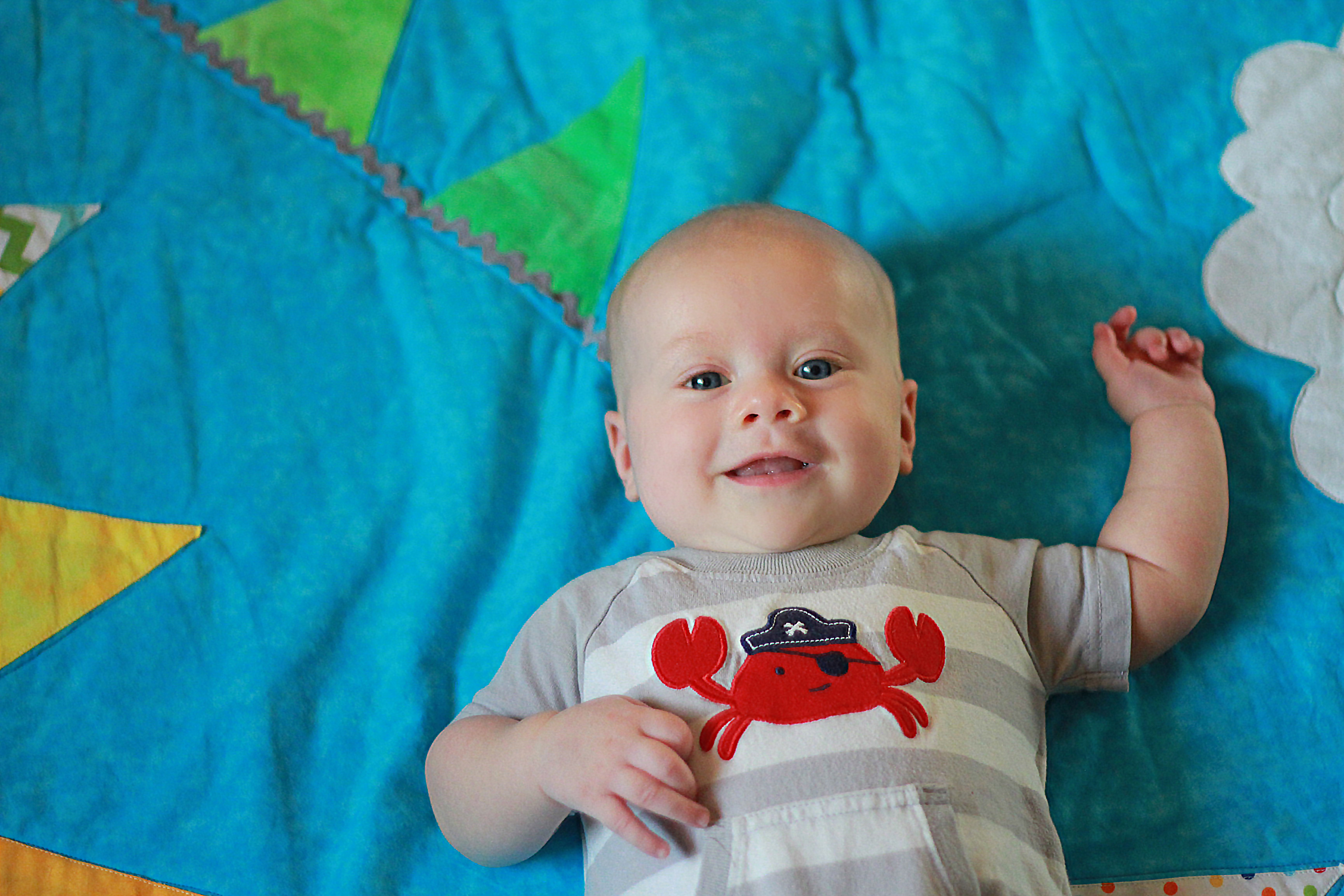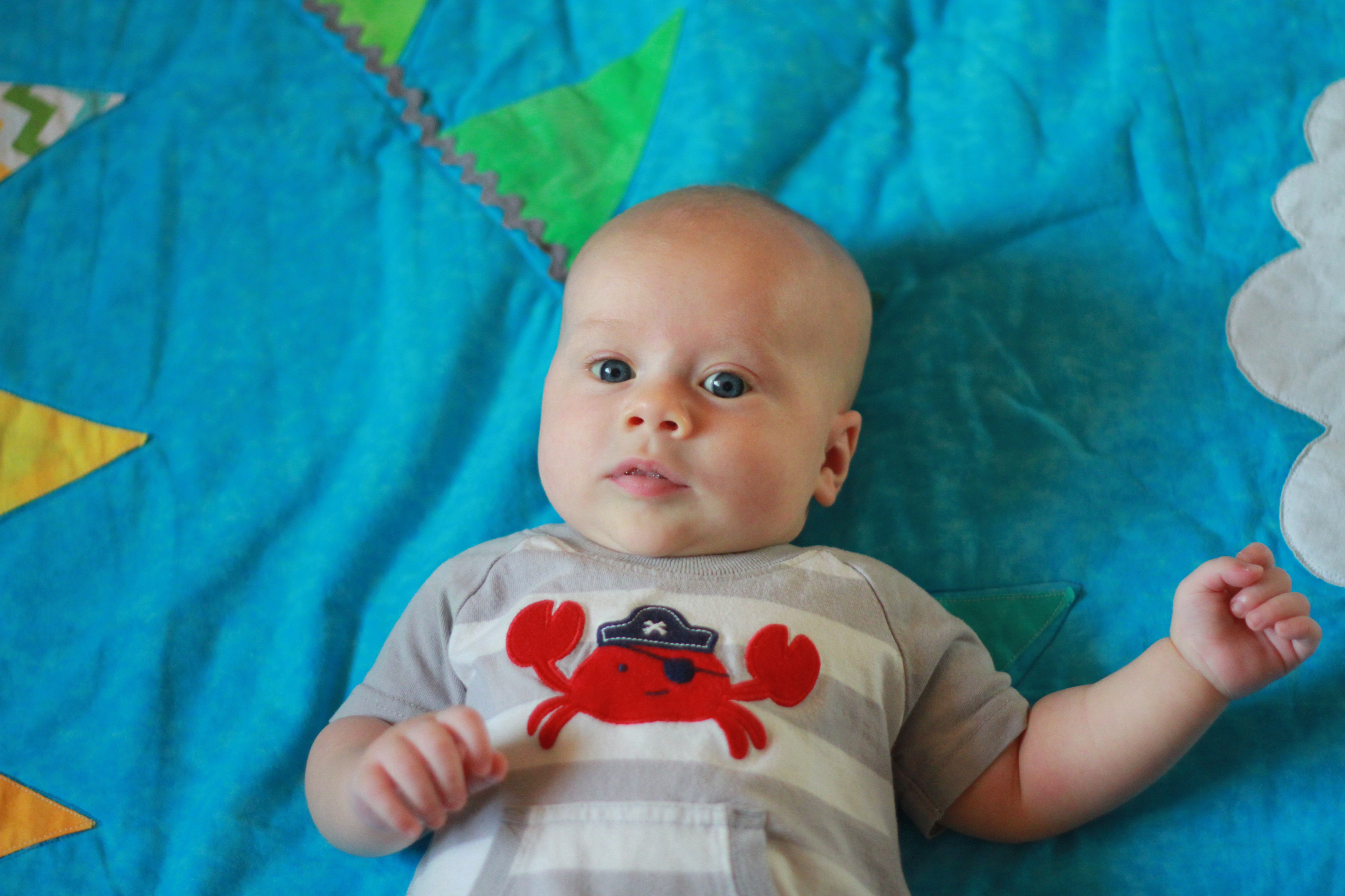 My big boy weighs over 15 pounds (so he has more than doubled), and no longer fits in most of the 3 month clothes we have, much to my chagrin. It’s all going too fast! (Said every mom, ever). He is strong, and his kicking legs hurt if they make contact. He will whip his head away from your shoulder to look around. He can roll from his stomach to his back and his back to his stomach, although that one is hard for him, and on hard surfaces he only makes it to his side.