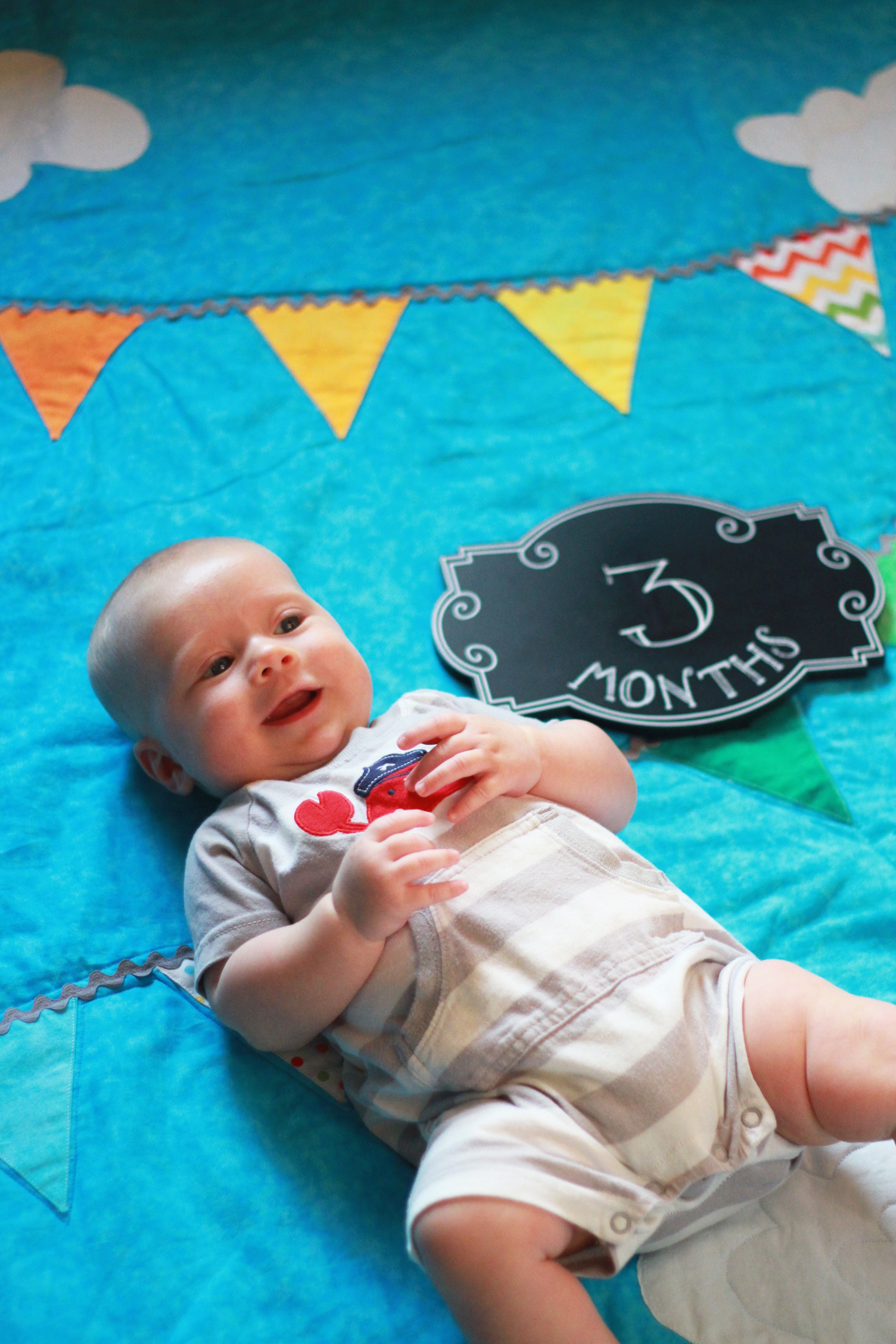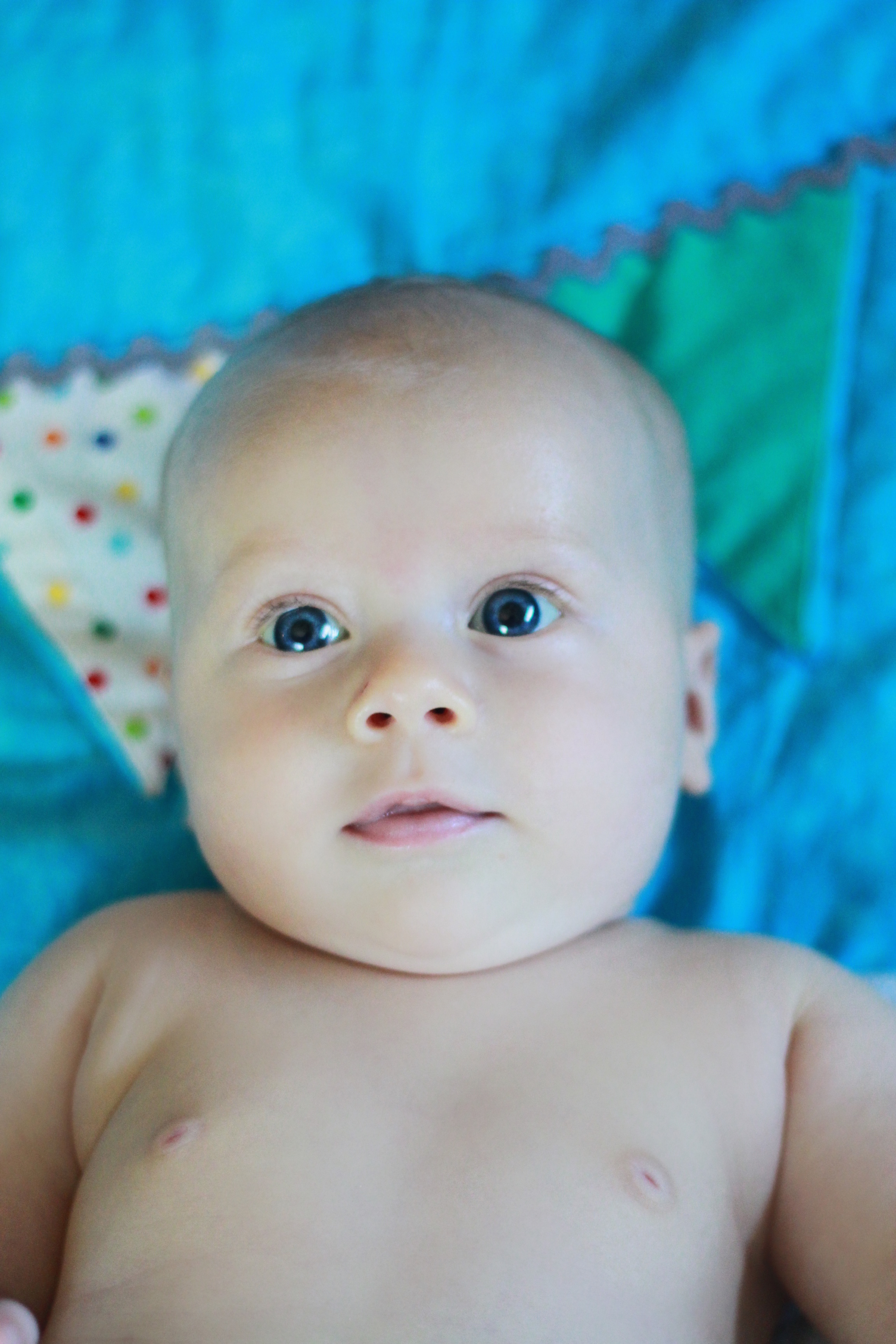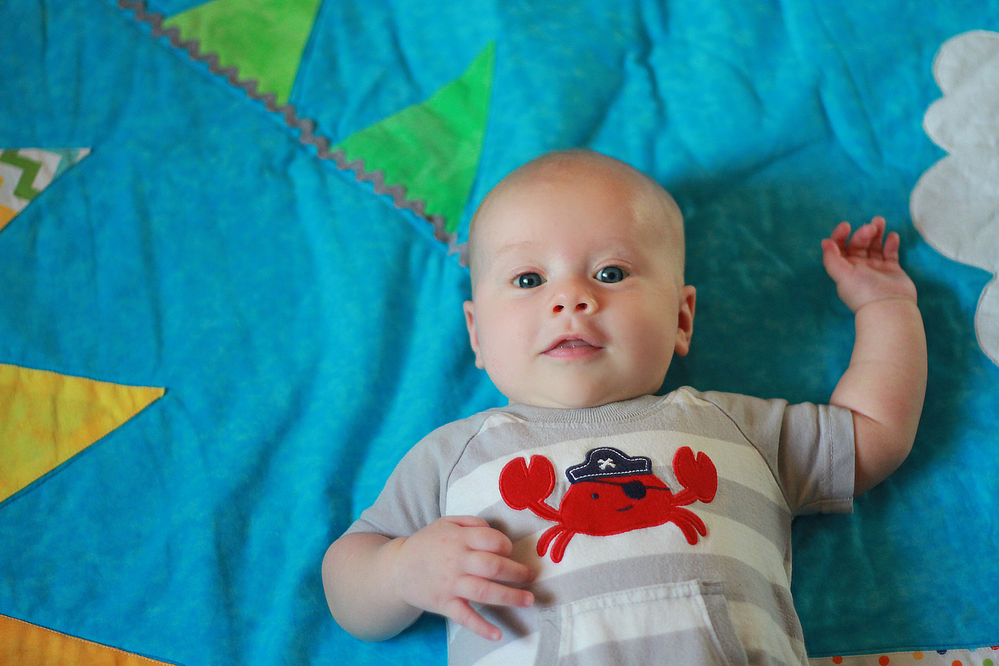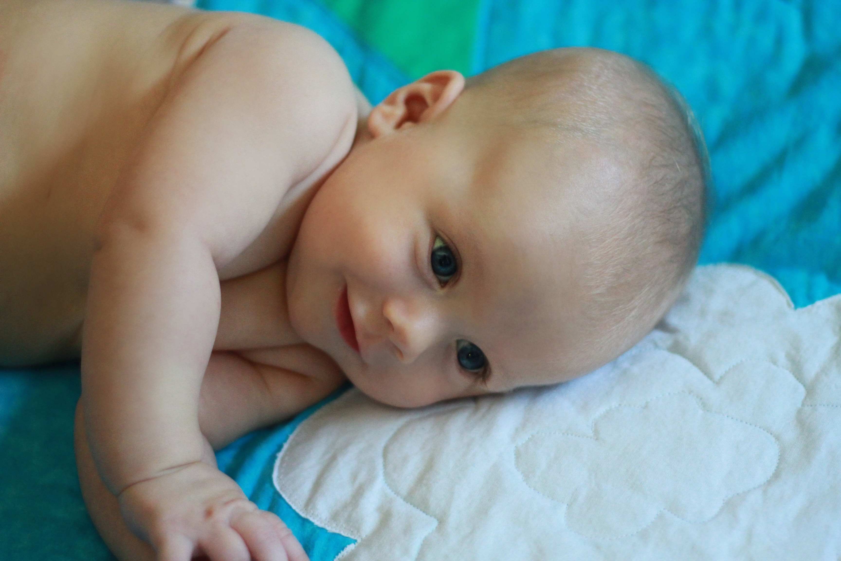 My big boy weighs over 15 pounds (so he has more than doubled), and no longer fits in most of the 3 month clothes we have, much to my chagrin. It’s all going too fast! (Said every mom, ever). He is strong, and his kicking legs hurt if they make contact. He will whip his head away from your shoulder to look around. He can roll from his stomach to his back and his back to his stomach, although that one is hard for him, and on hard surfaces he only makes it to his side.