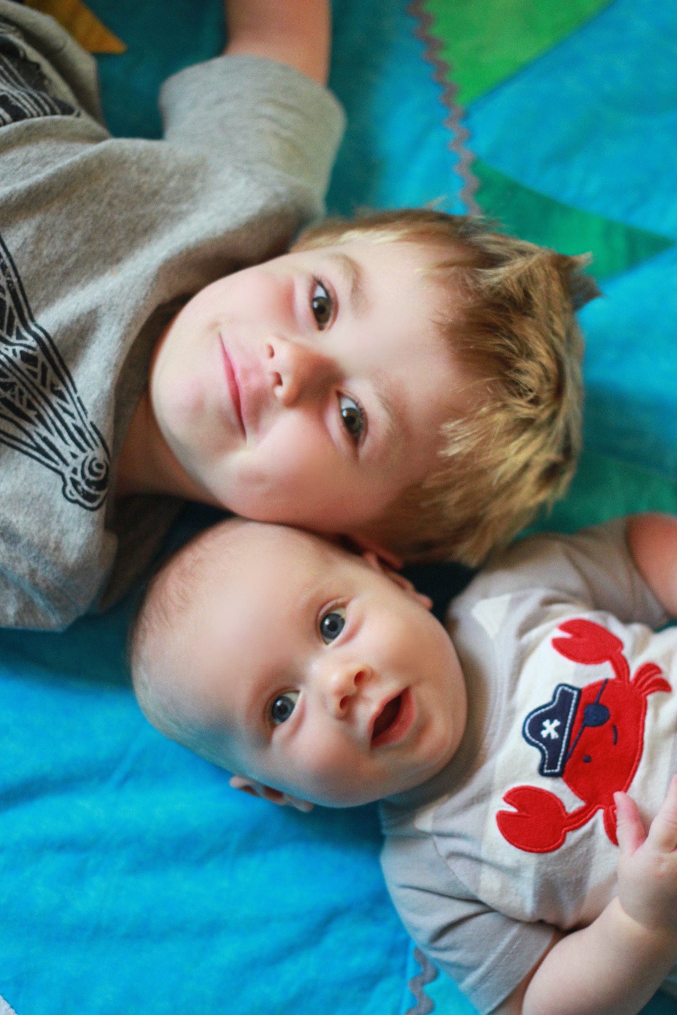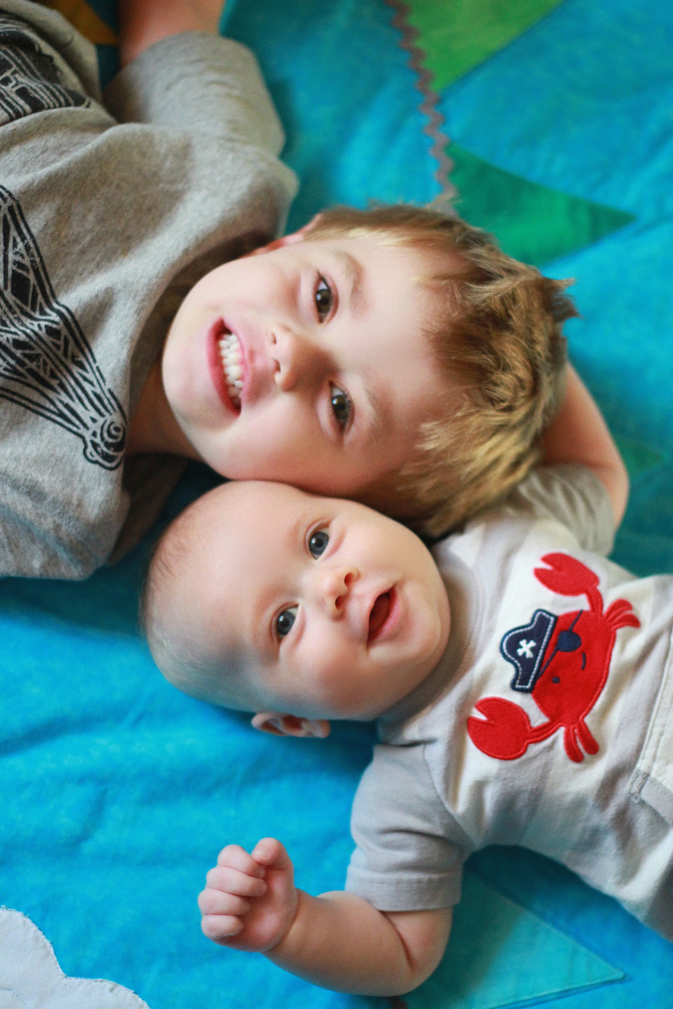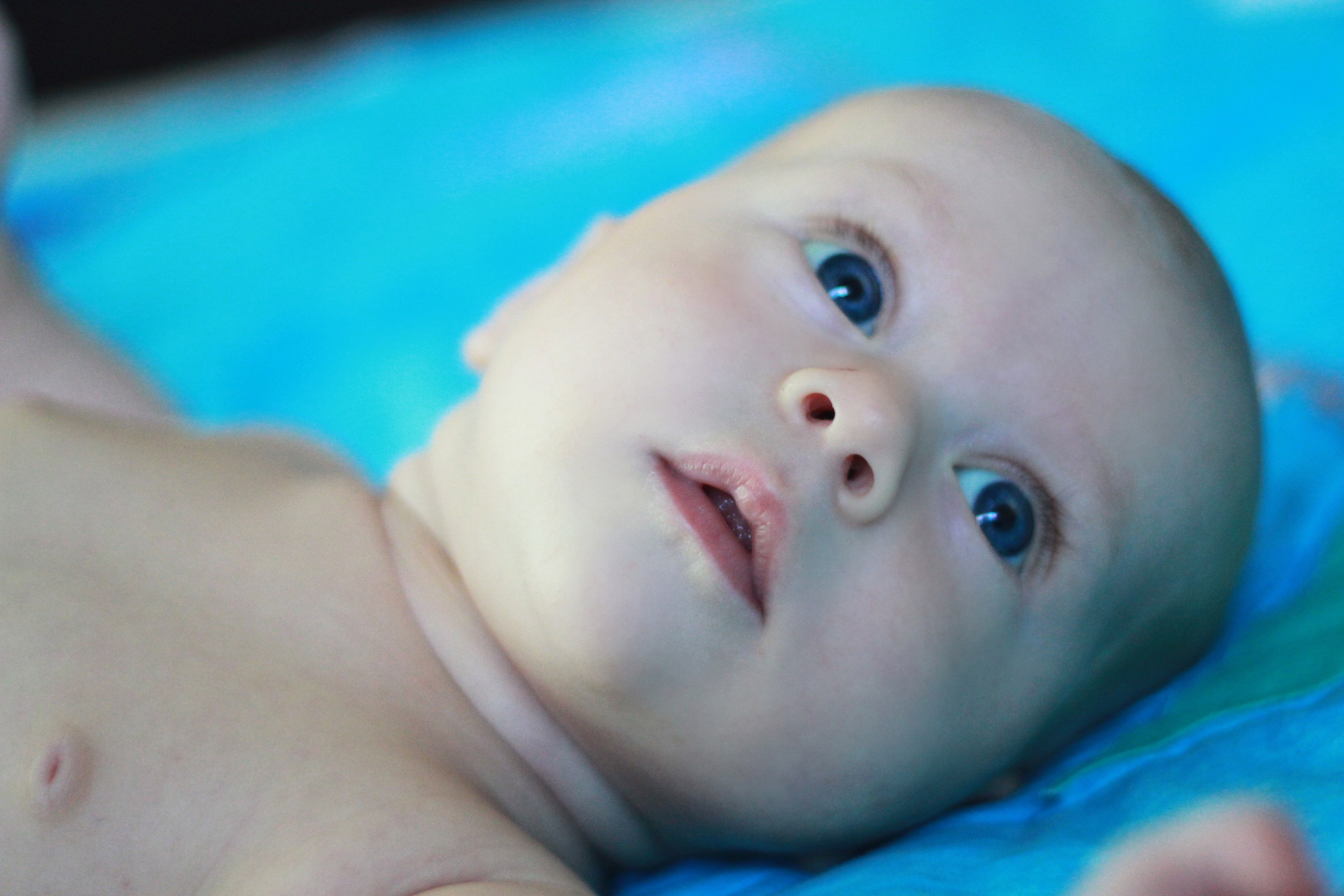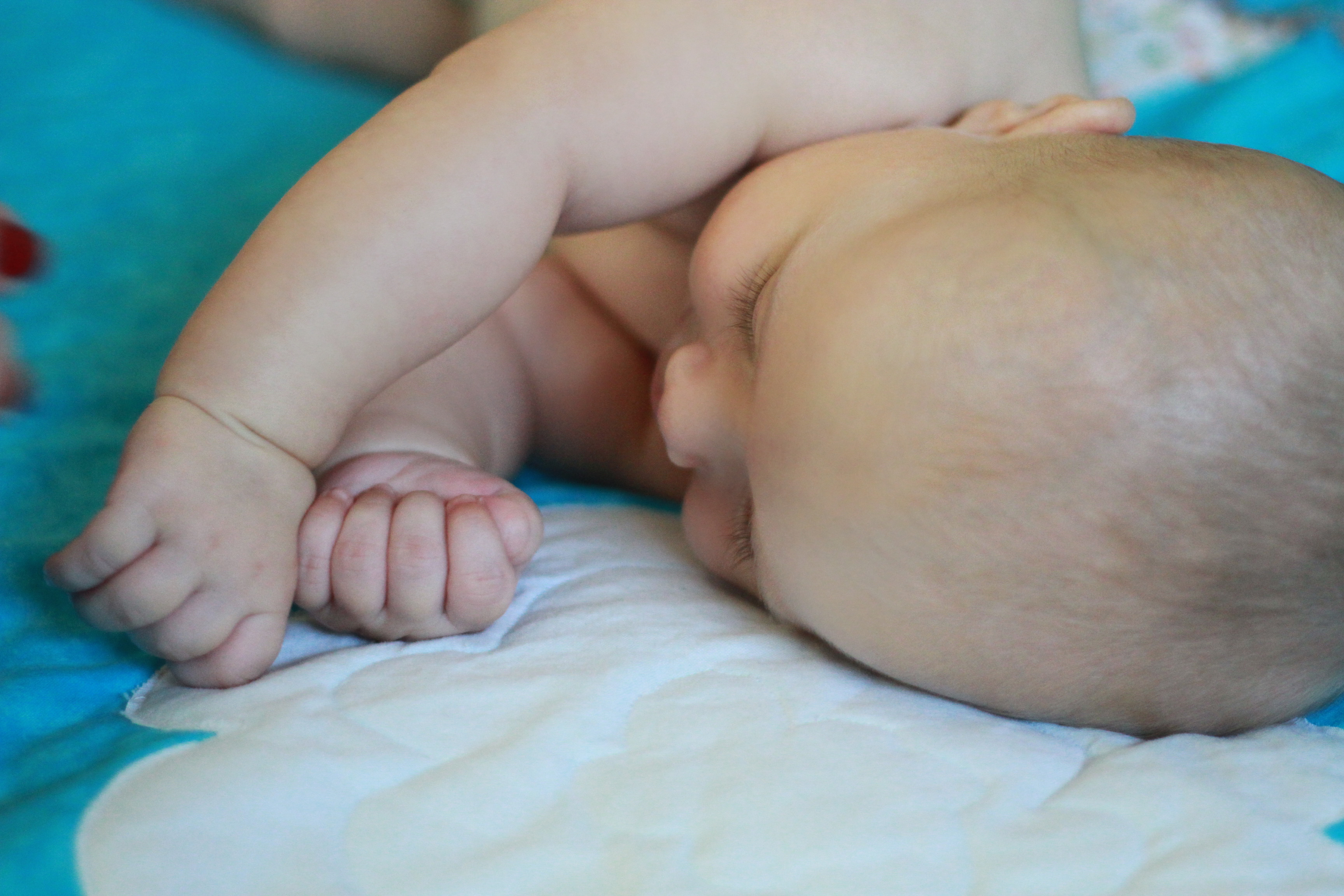 My big boy weighs over 15 pounds (so he has more than doubled), and no longer fits in most of the 3 month clothes we have, much to my chagrin. It’s all going too fast! (Said every mom, ever). He is strong, and his kicking legs hurt if they make contact. He will whip his head away from your shoulder to look around. He can roll from his stomach to his back and his back to his stomach, although that one is hard for him, and on hard surfaces he only makes it to his side.