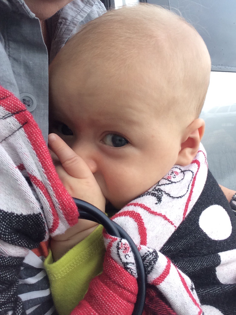 My darling baby loves to be in a wrap on my chest. I love the health benefits and how easily he falls asleep there, so it is fine with me (besides, we all know I’m in it for the snuggles!). He is such a sweet and mellow guy. He just looks around, taking it all in, until his eyes get heavy and he falls, very quickly and without difficulty, to sleep. 😇