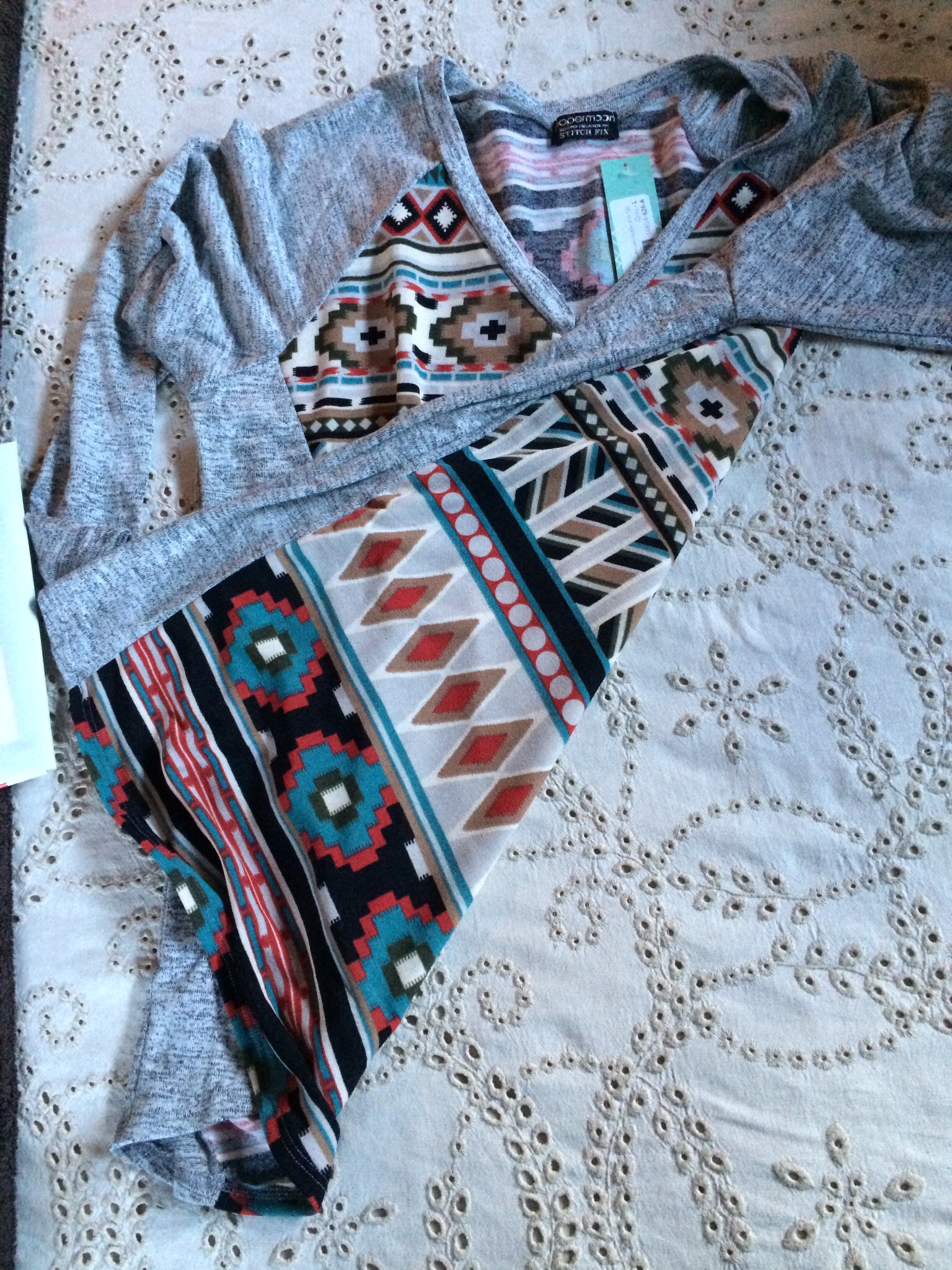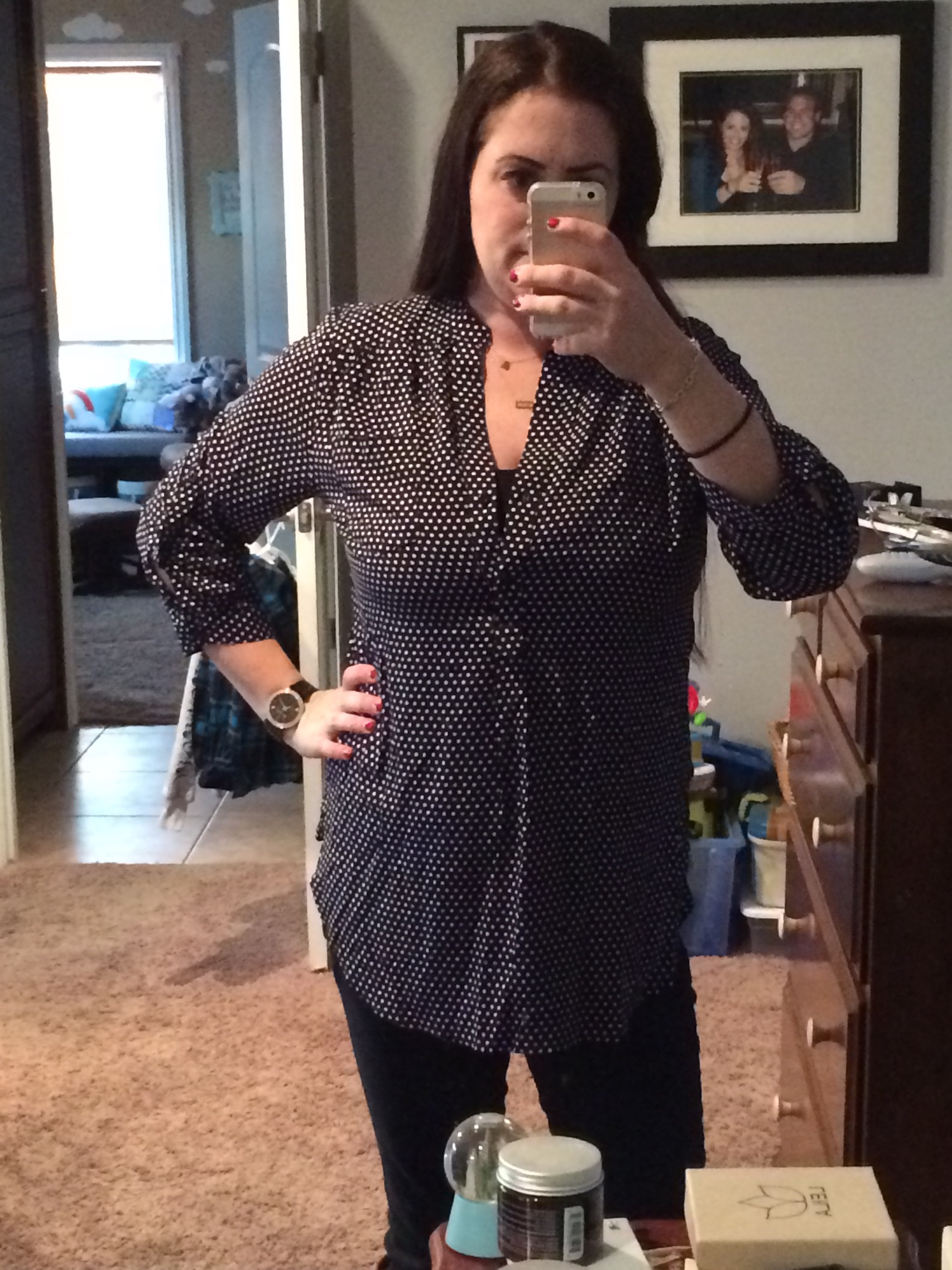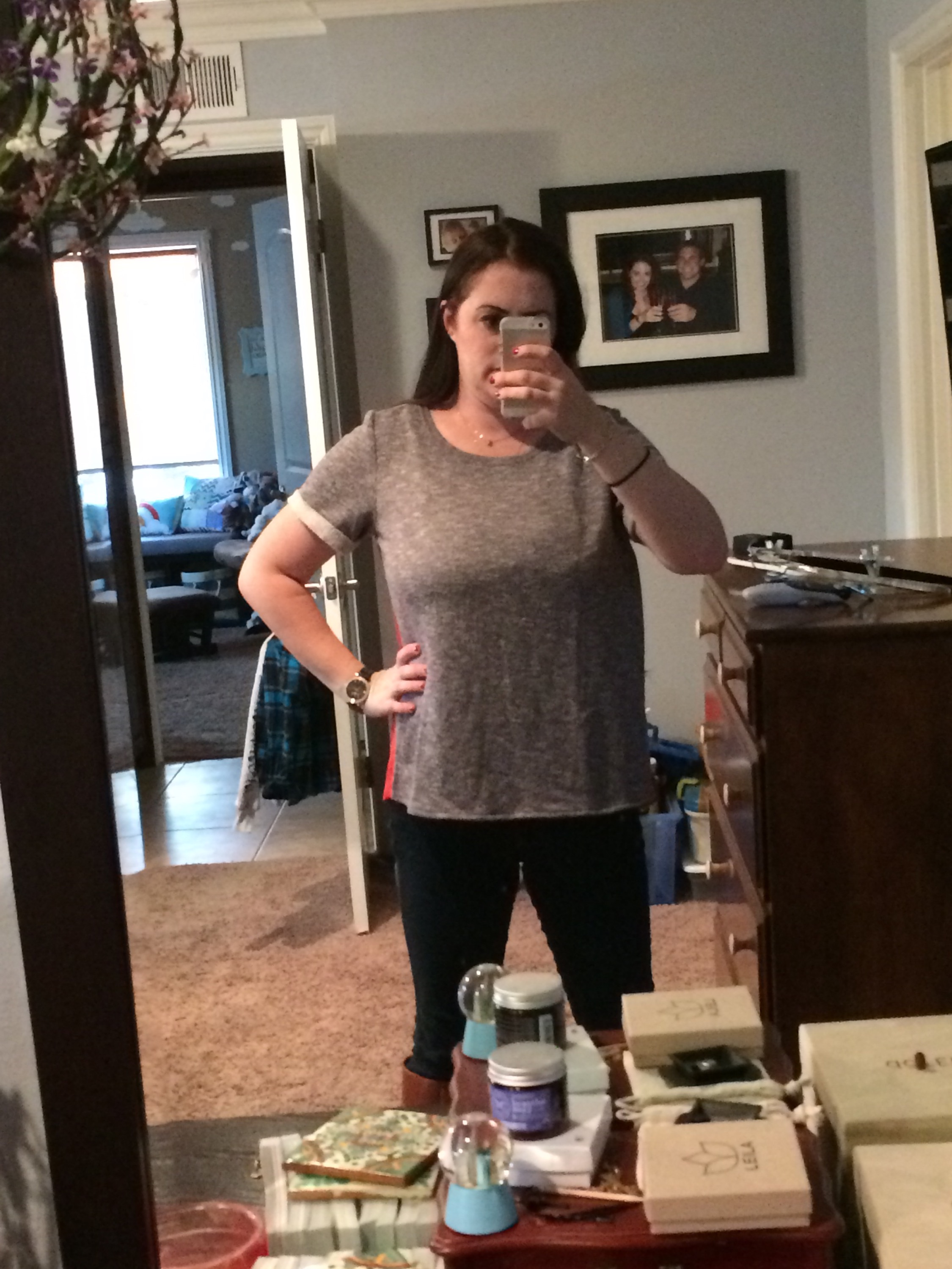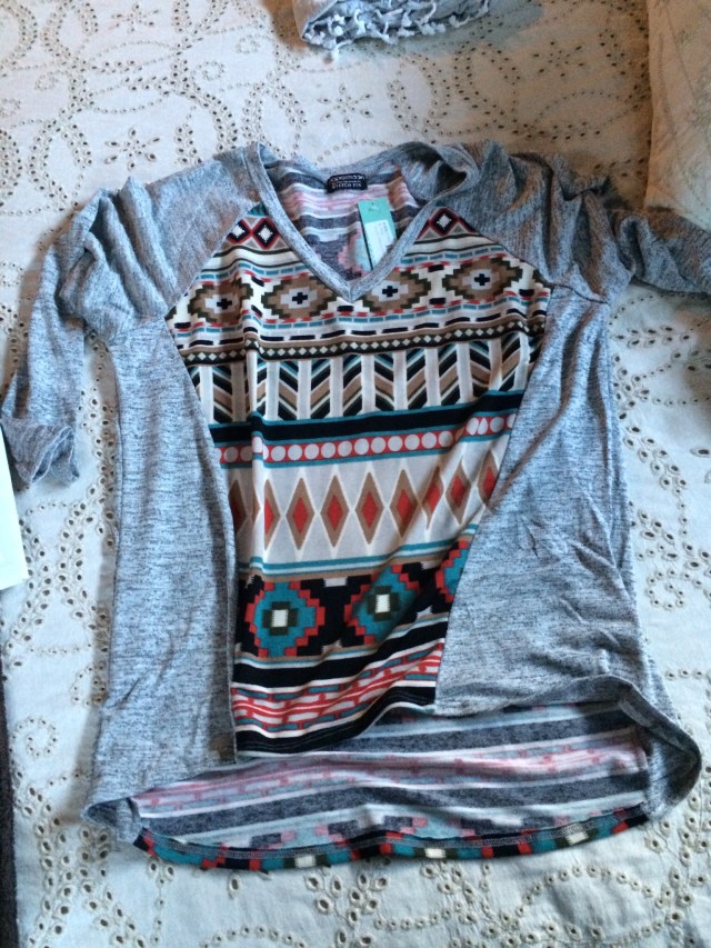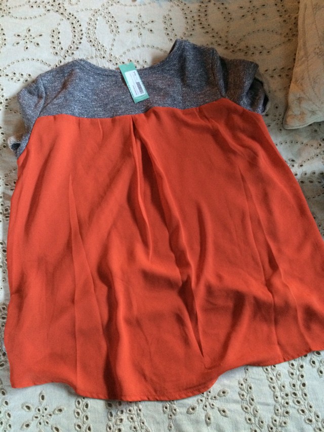 How it works: you take a style quiz, upload photos, and send sizes/preferences/types of clothing you are looking for, and you get a personal stylist. The styling fee is $20. You will get a box with five items shipped to your house on a date you choose. It could be anything from clothes to jewelry or purses. You receive styling cards with two outfit suggestions per item in the box. If you buy anything, the $20 styling fee is credited from your order. If you purchase all five items, you get 25% off the whole box. Whatever you decide against goes into the included prepaid shipping bag and onto your doorstep. It’s that easy! I first tried it maybe two years ago, and I’ve done it on and off since. It’s especially helpful when I need specific items, like jeans. I have zero time to shlep myself and my two little ones all over a mall trying on jeans. I’ve gotten three pairs of jeans and they have all been a perfect fit. You can tell the stylist your price preference, but be prepared that it’s not Target prices. That being said, they have some cute stuff and some great prices, and the discount for buying everything is really great. The best part, though, is getting things picked for you and sent right to your door. My last fix was awesome. My preferences were: tops, specifically things I can nurse in, that hide my belly. Here’s what I got.