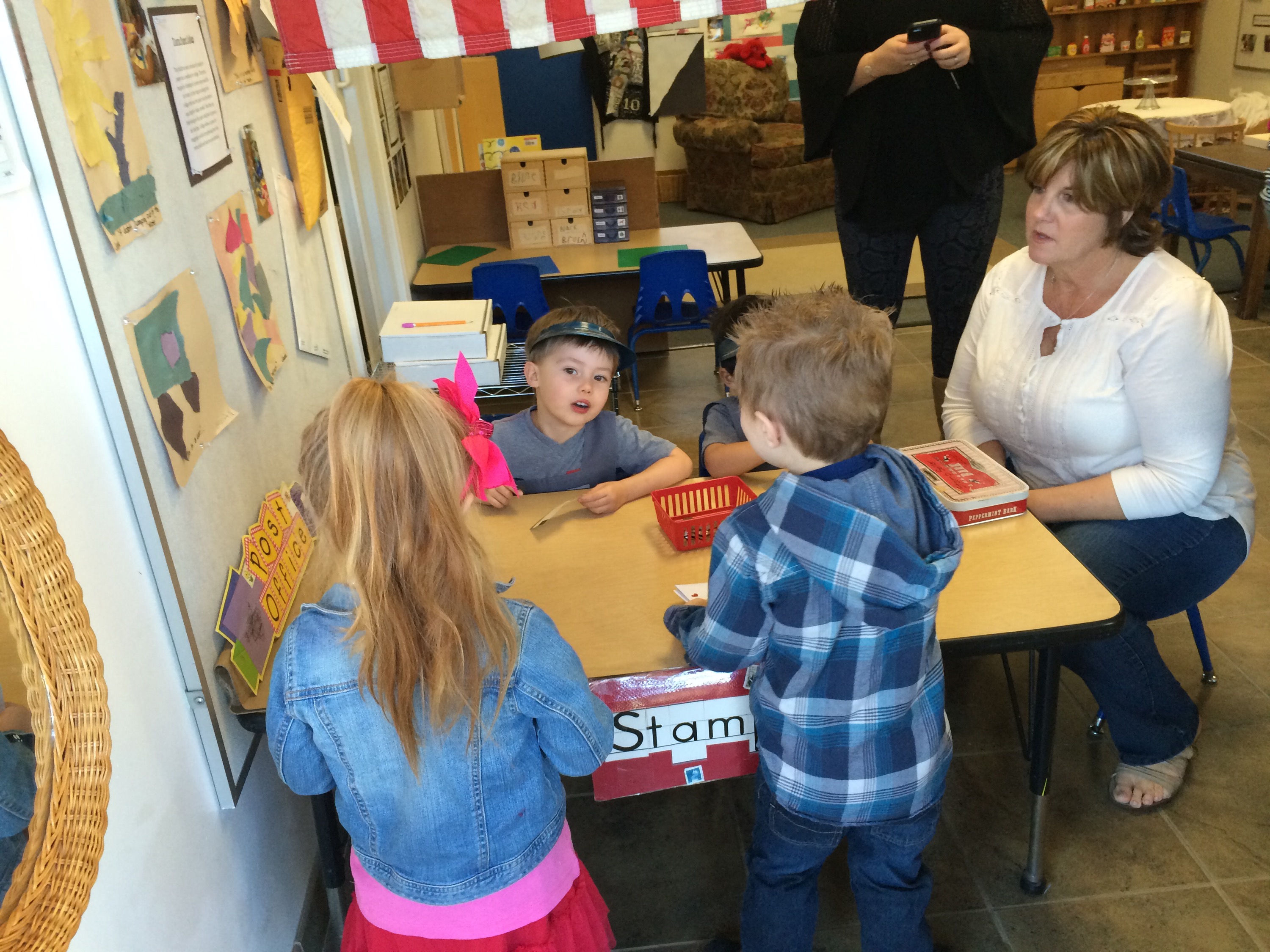Jacob’s school is so wonderful. They opened their post office for the Valentine season: each class day until February 18 the kids will bring three Valentines from their list. They are supposed to be in envelopes (no candy) with the recipient’s name on the front. They “buy” a 1 cent stamp at the post office for each letter, and then place their stamped letters in the mailbox. The post office workers for that day will then cancel the stamp and the mail gets delivered. I loved hearing Jacob tell me that his friend Owen (postal worker on the left, below) was in charge of “canceling stamps.” Because he’s four and talking about canceling stamps!