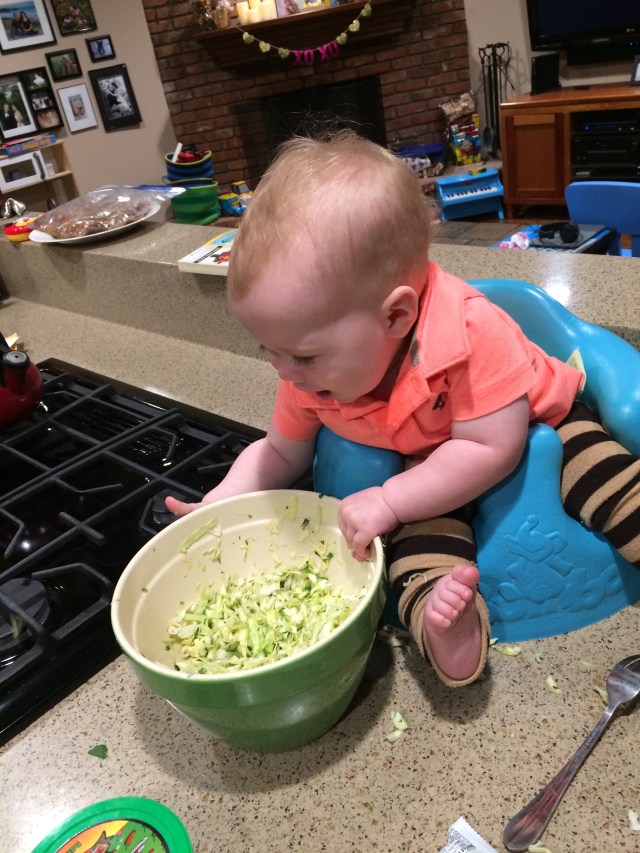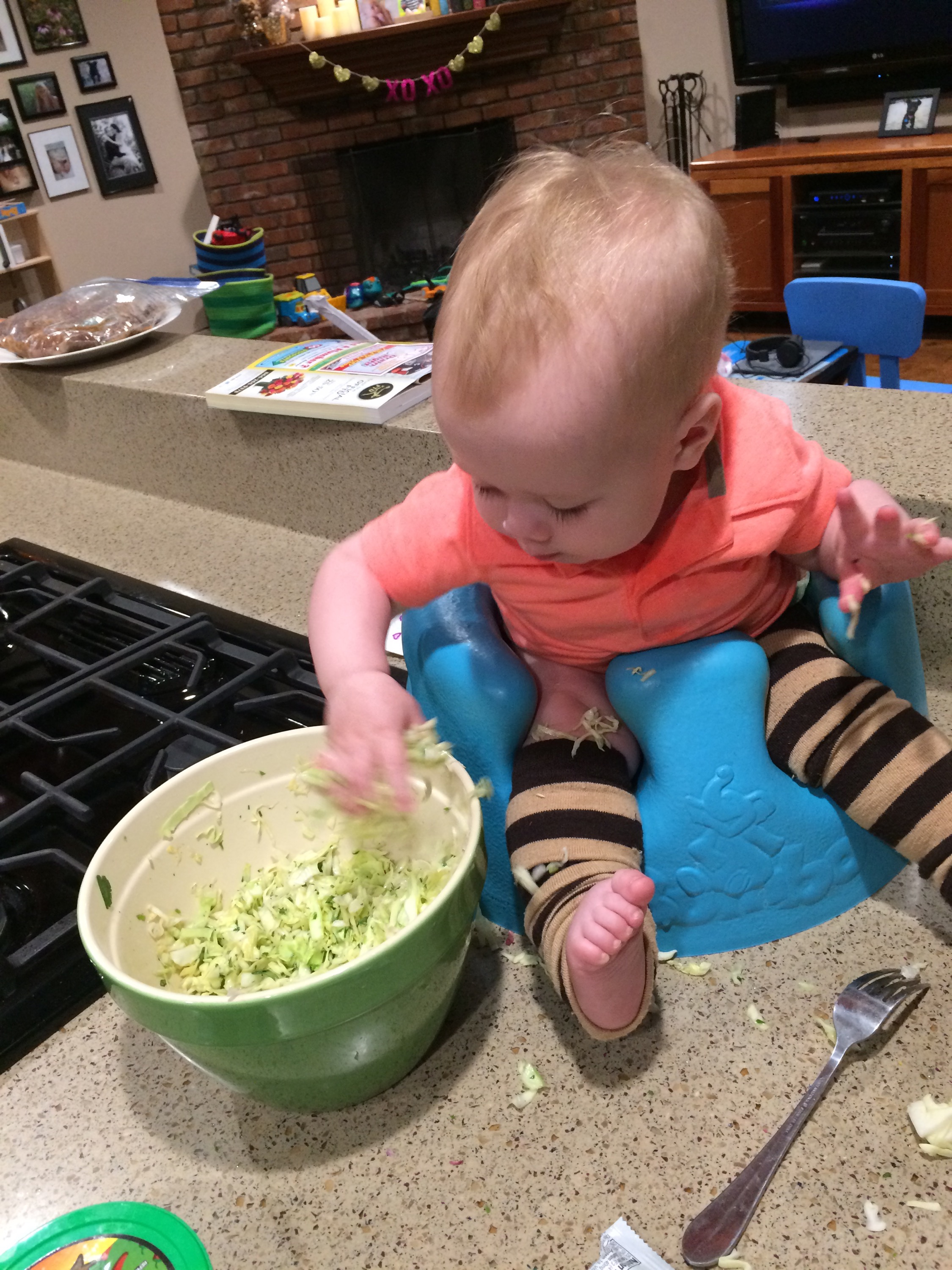 He reached into this bowl of cabbage slaw to find out what it felt like. I gave him some large chunks to chew on, too.