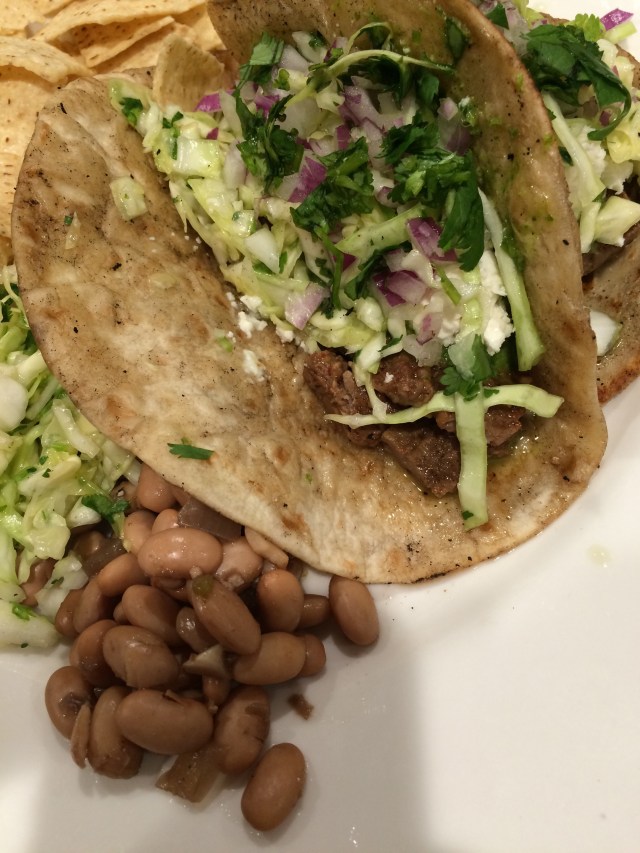 The finished product: homemade pinto beans (bland) and steak tacos with homemade chimichurri sauce, onions, cilantro, my citrus cabbage slaw (soooo good on tacos!) and crumbled feta cheese. These tortillas are really good corn/flour organic hybrids from Sprouts.