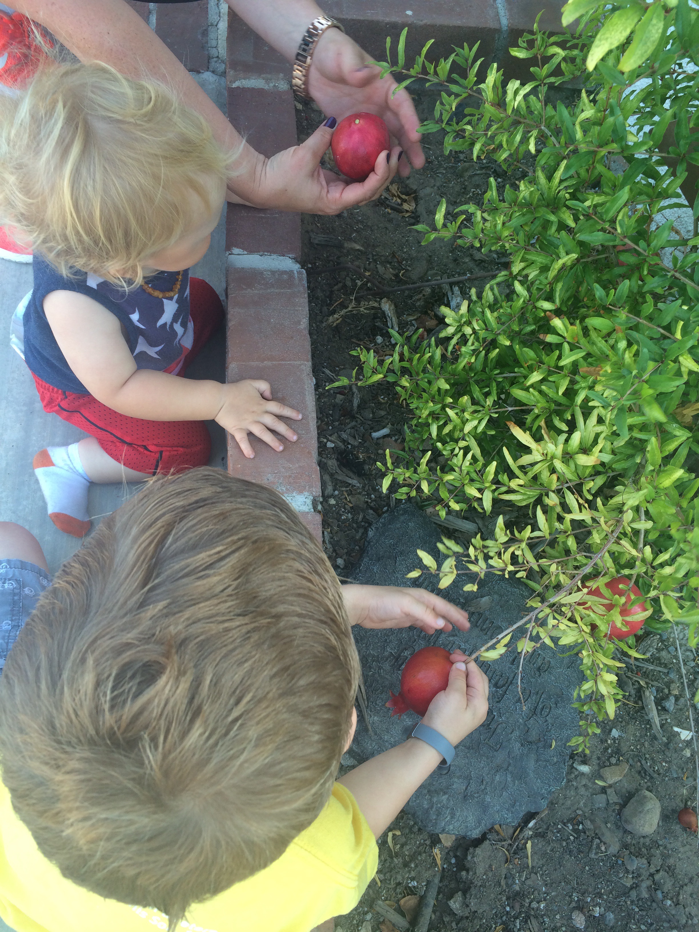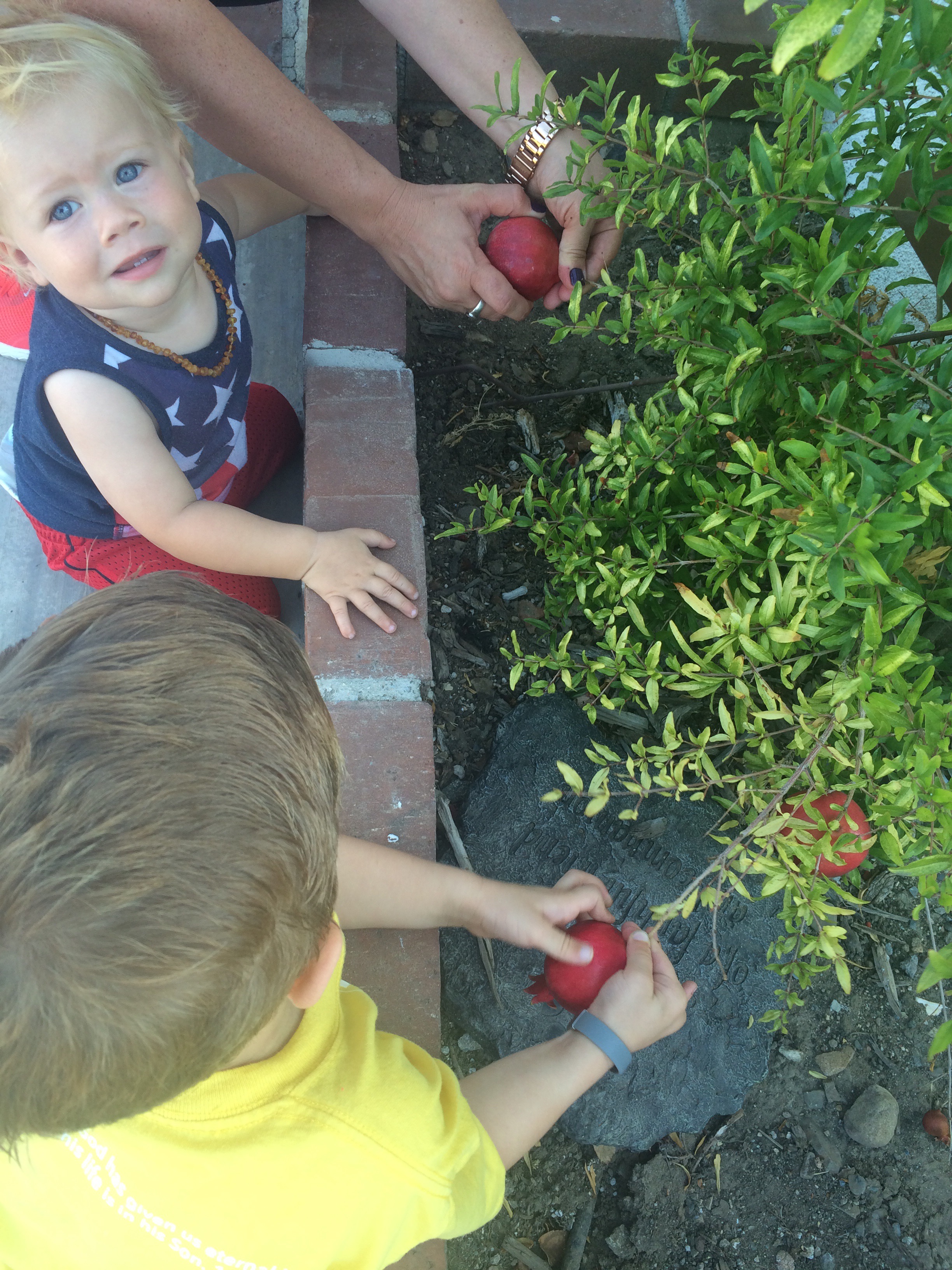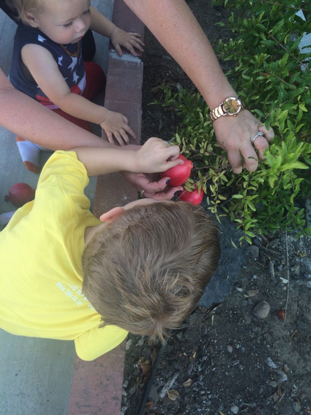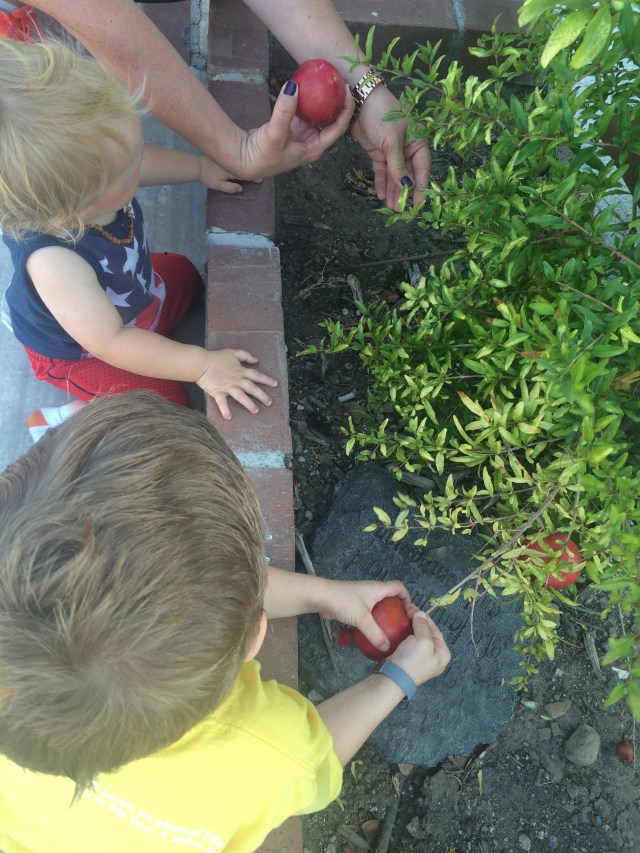 The first pomegranates on our “volunteer” tree. If grew, somehow, in our front planter (which doesn’t get water). At first it was a single branch with one, round fruit on it. My mom thought it was a Christmas ornament!