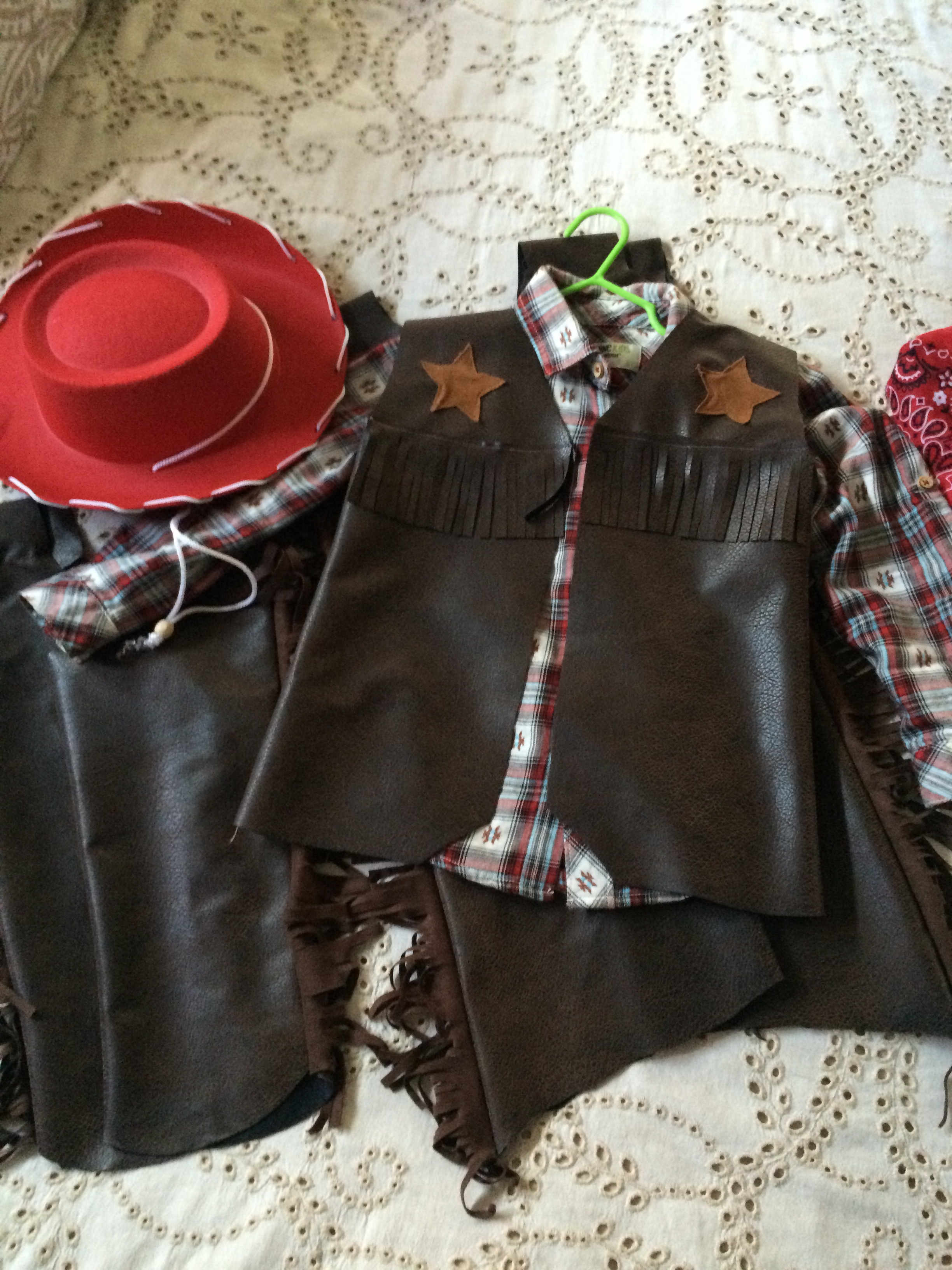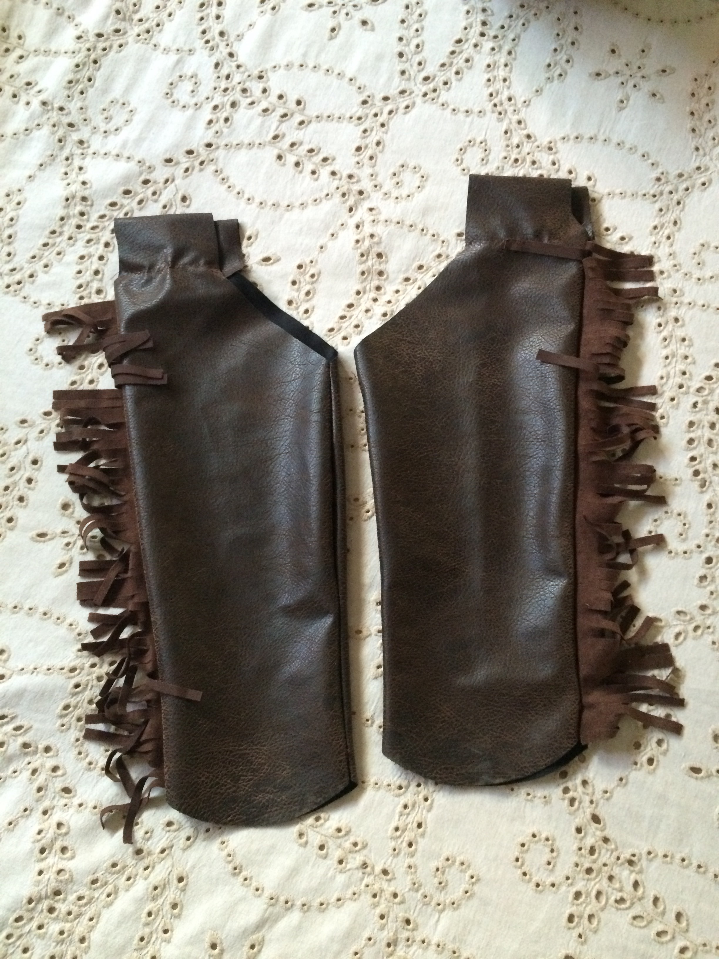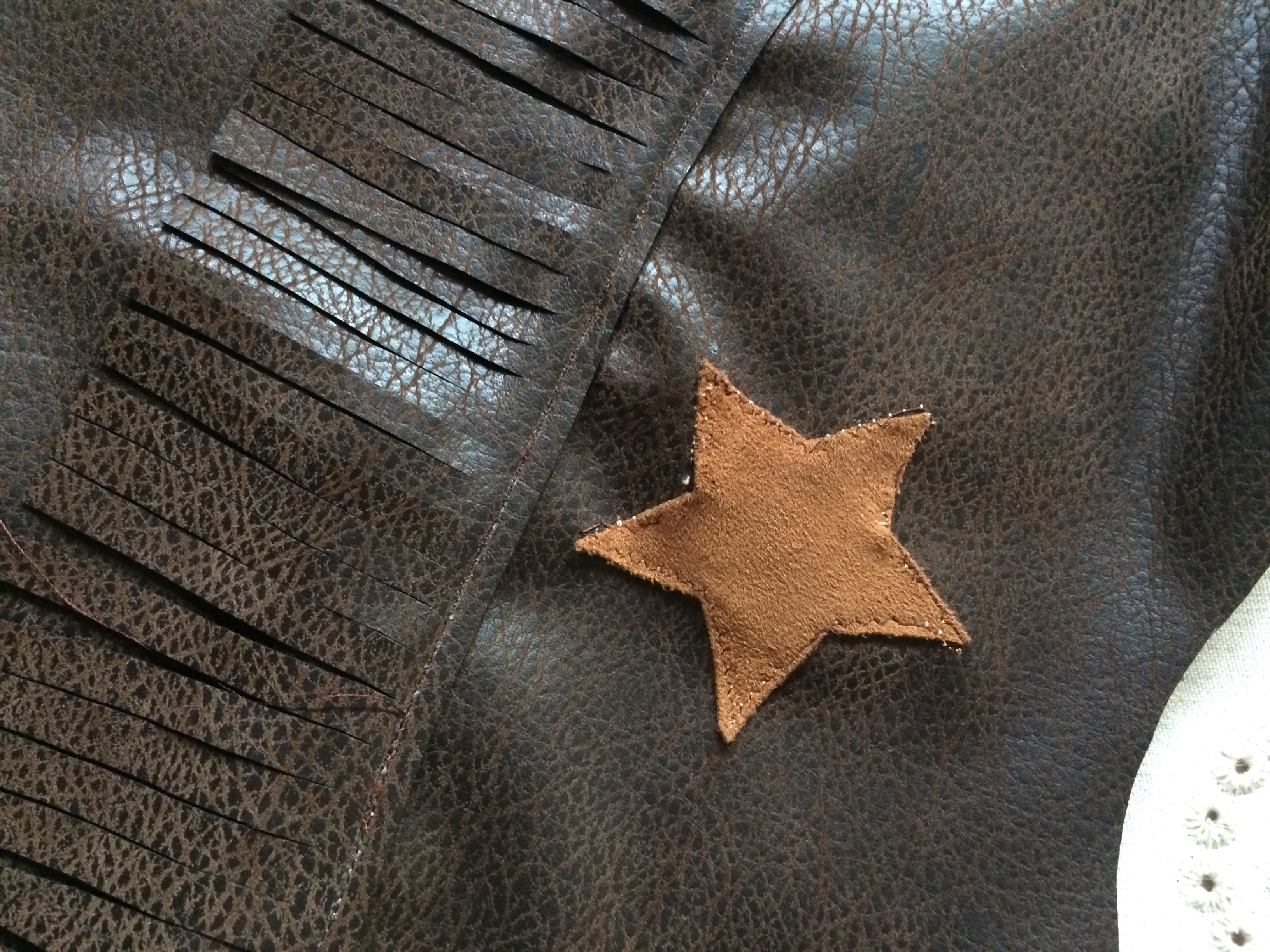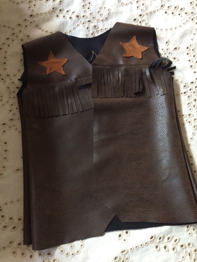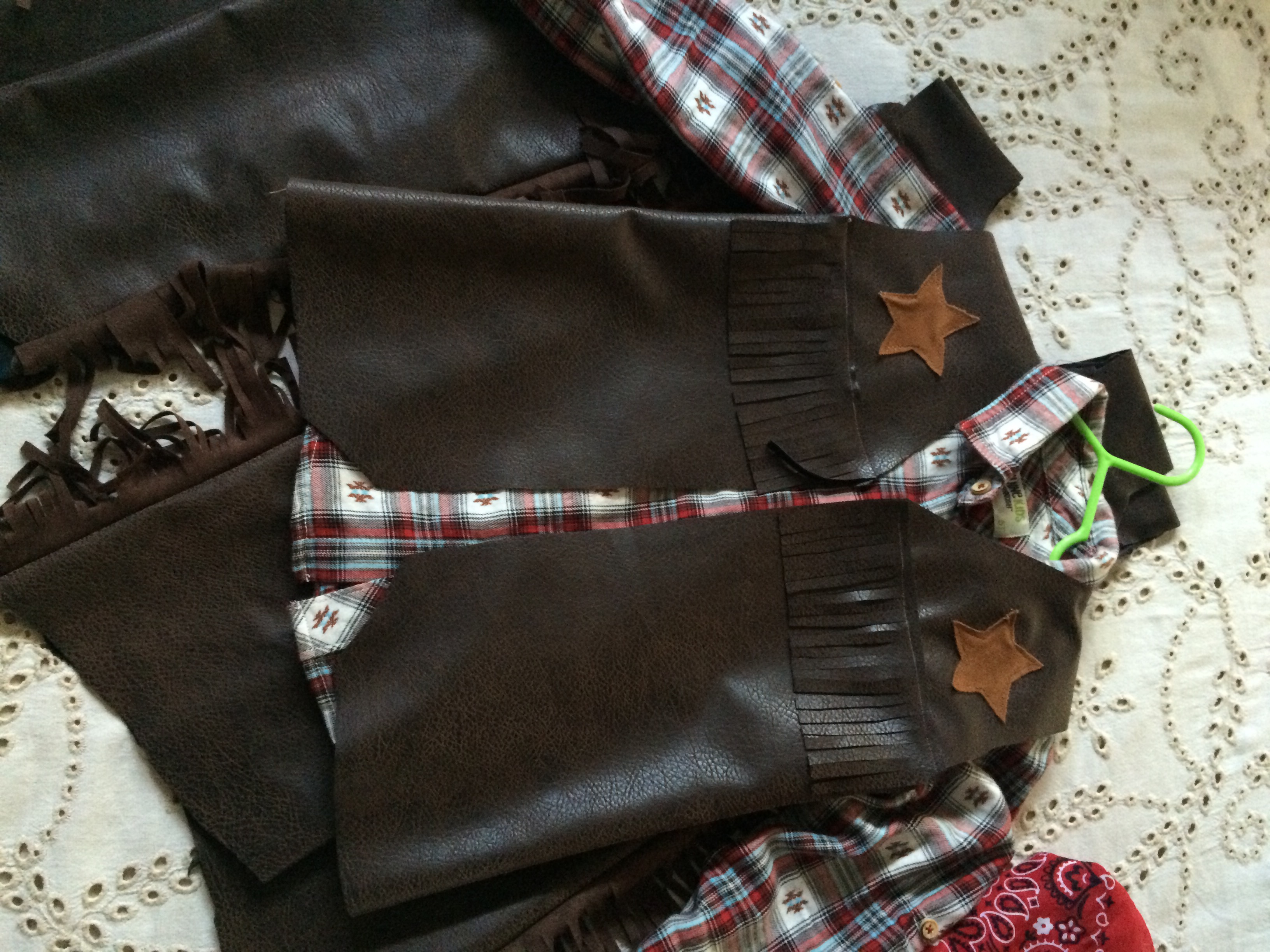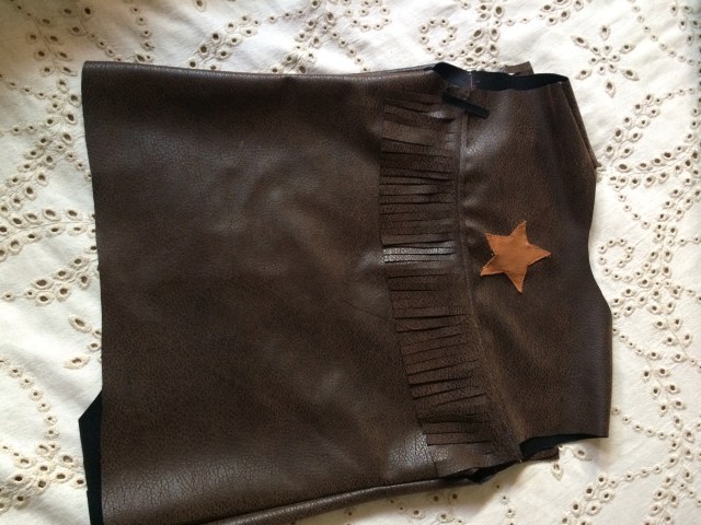 I wanted to share my Cowboys’ costumes up close because I’m so happy with how they turned out! I made them based on a tutorial I found on Pinterest, and it was really fun and easy. I used a thin faux leather and it was great because I didn’t have to hem anything! Yay!! The fringe was made quickly with a ruler and rotary cutter.