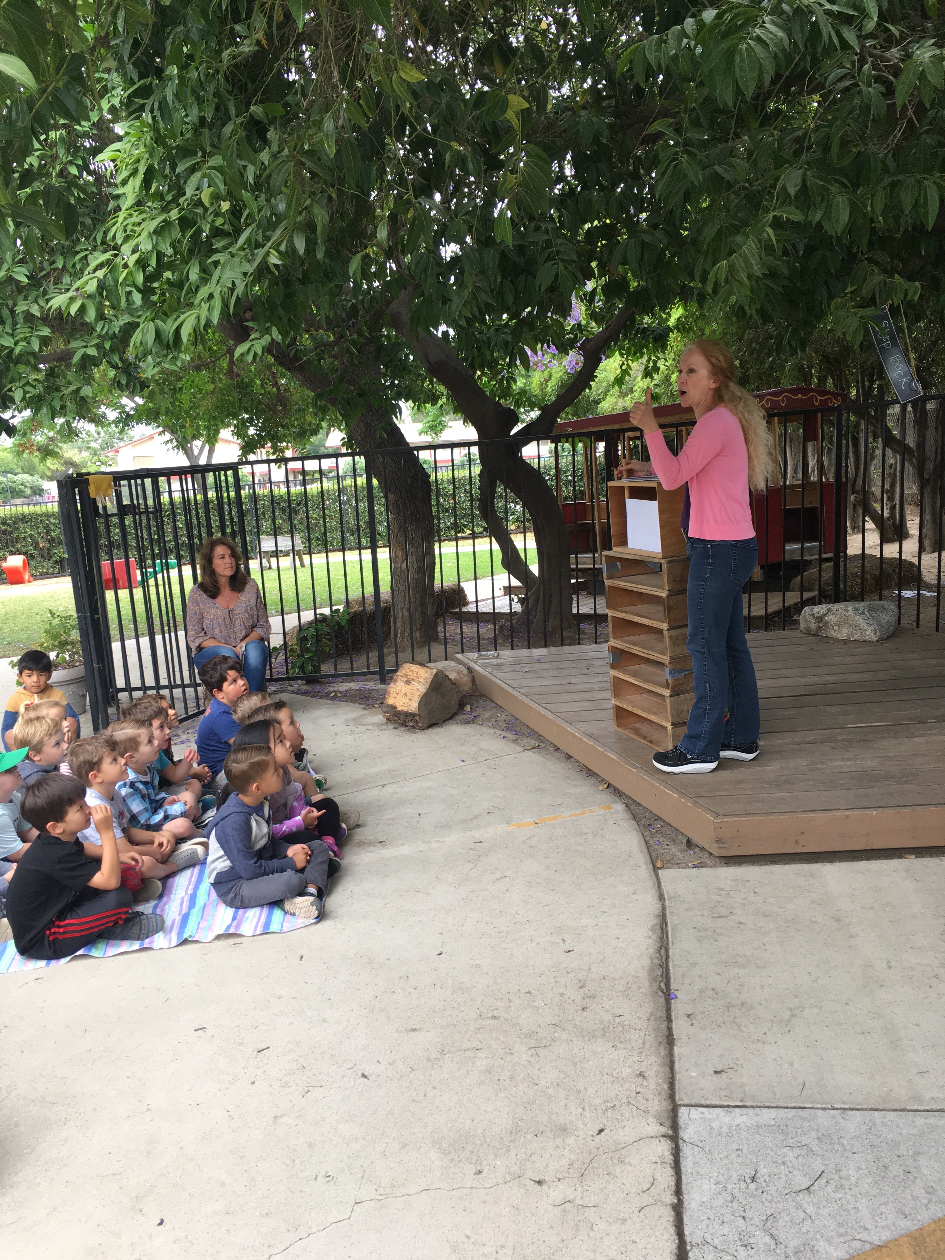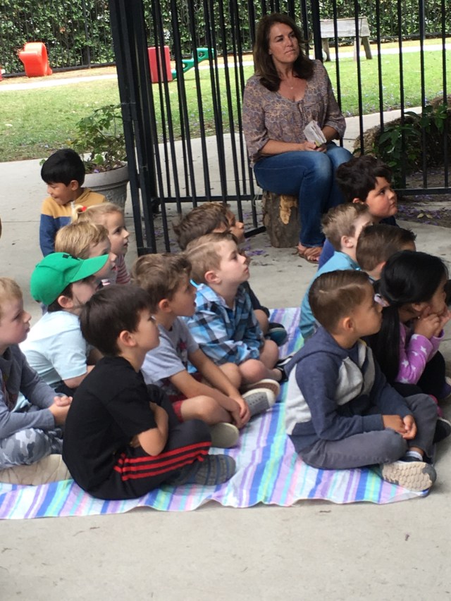 Mrs. Claborne has been working on a special project with the kids where each one writes one page of a story. They have to know where the characters left off and progress the action of the story, but each child puts a special spin on it. They each dictate their text and draw an illustration. Then, all of the illustrations were taped together and rolled around two dowels. When the first dowel was turned, the pages rolled across the front of a box to tell the story.