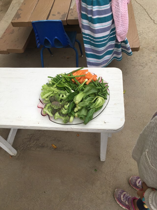 After the story, we were served strawberries and vegetables from the farm tour, cruditê style, and a vegetable soup one of the teachers made, also from veggies from the farm.