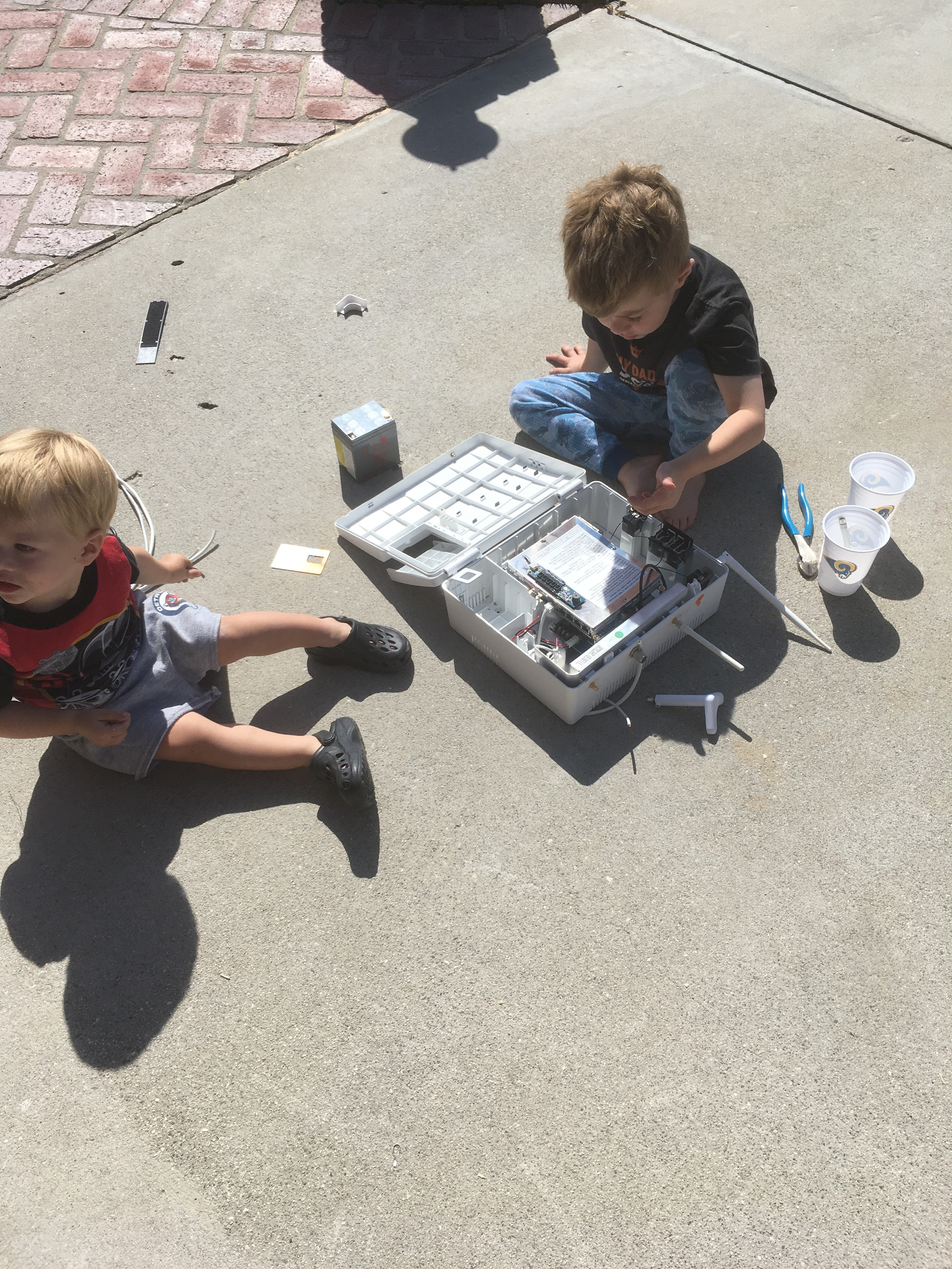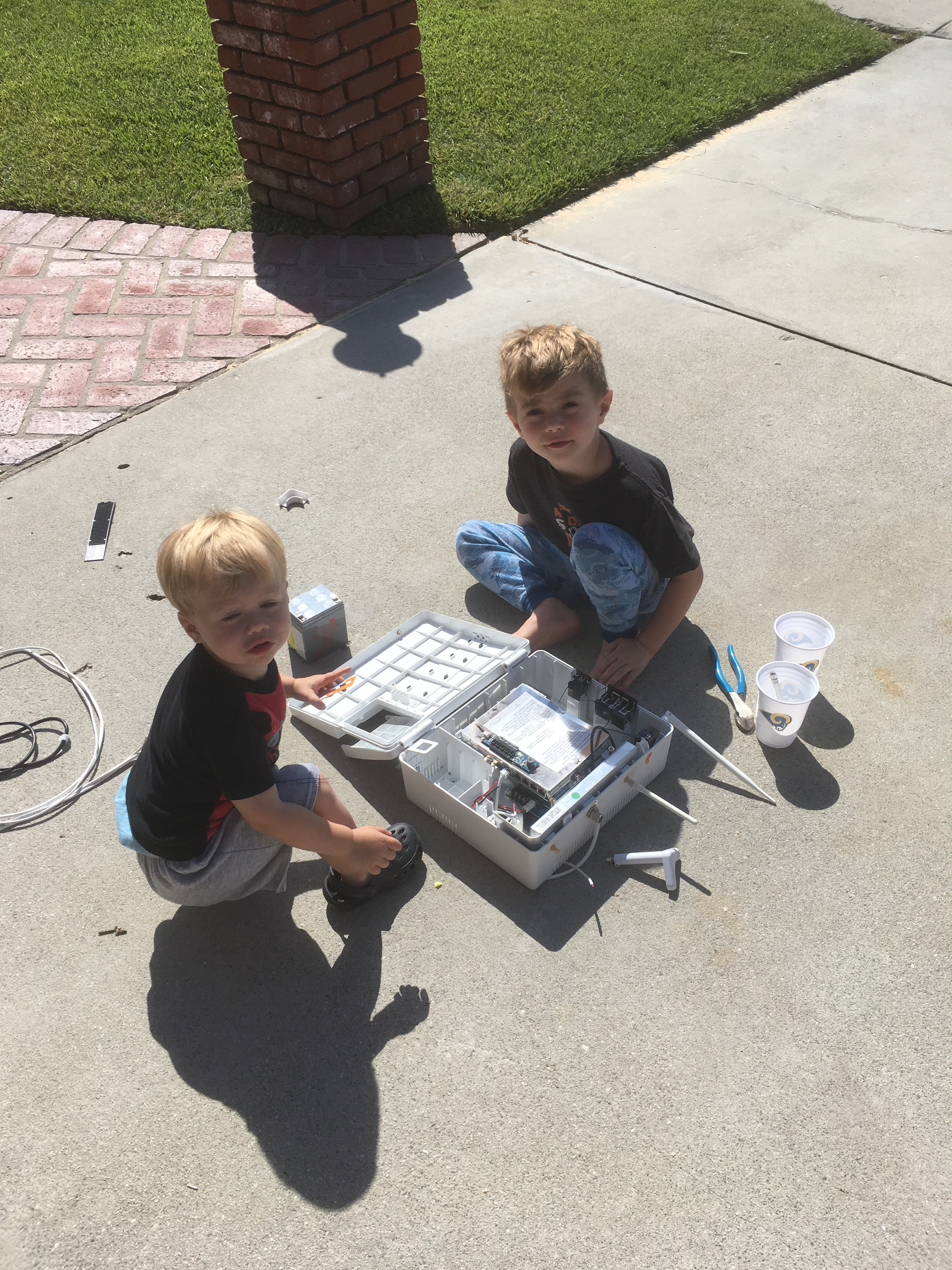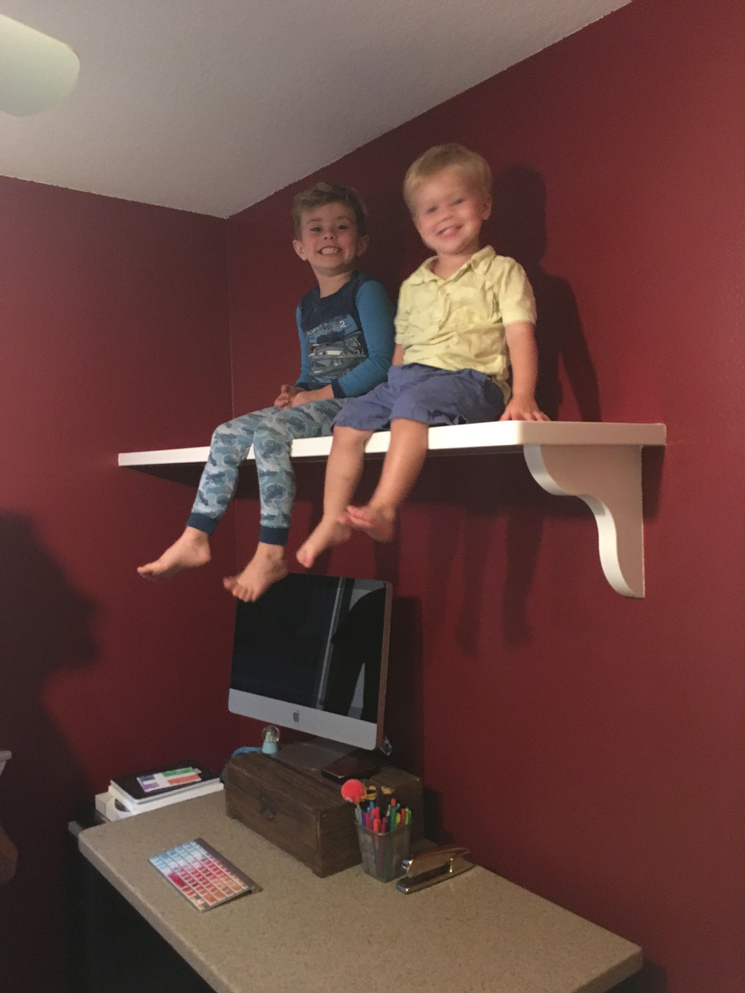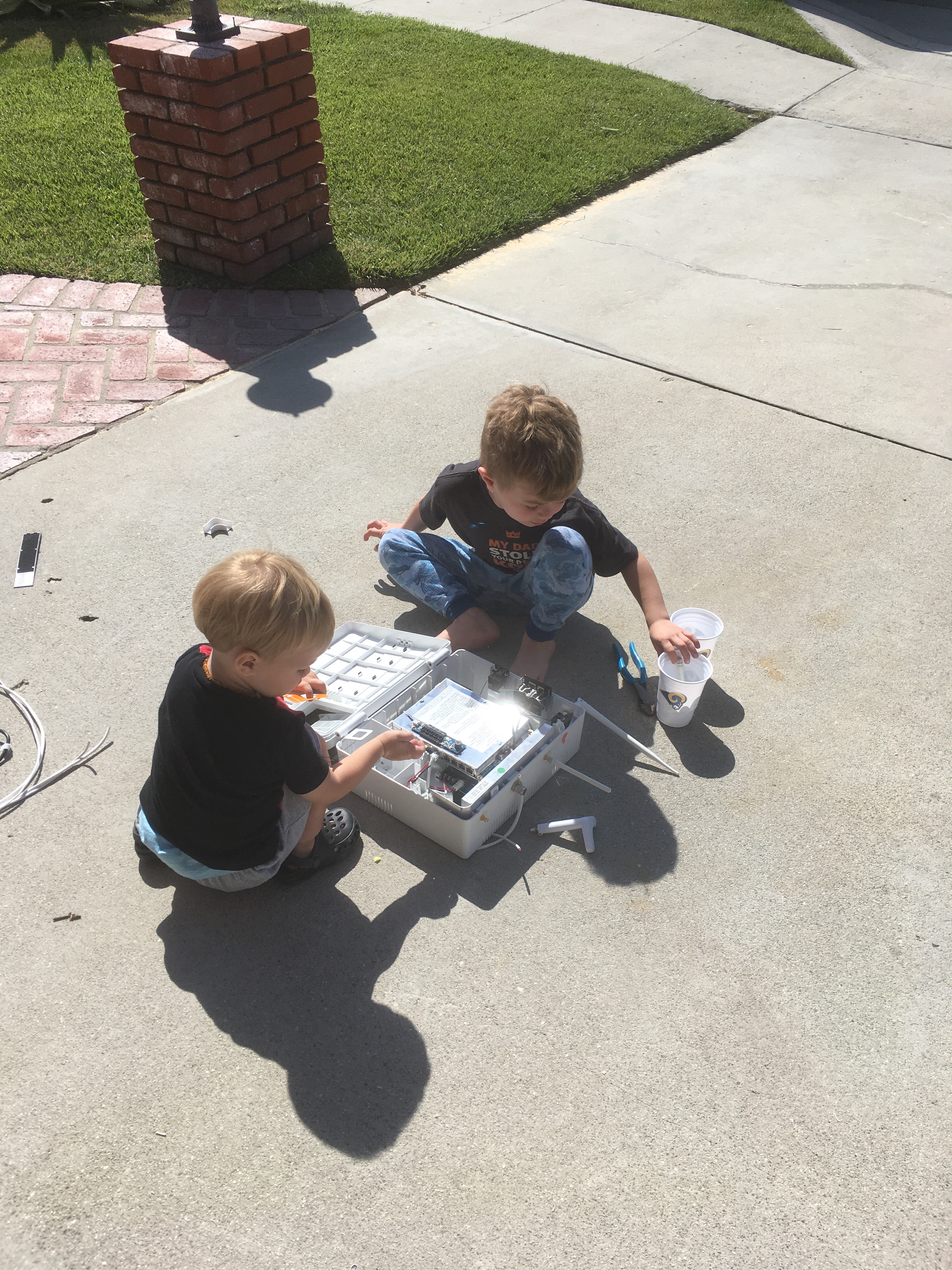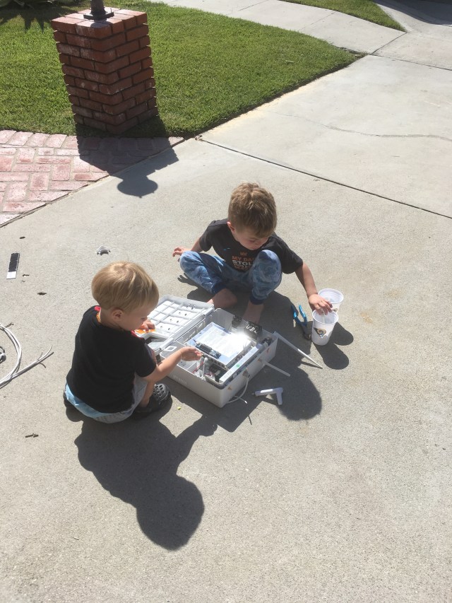 Then it was time for him to mud the closets, and he set the boys up to mud this cardboard box: