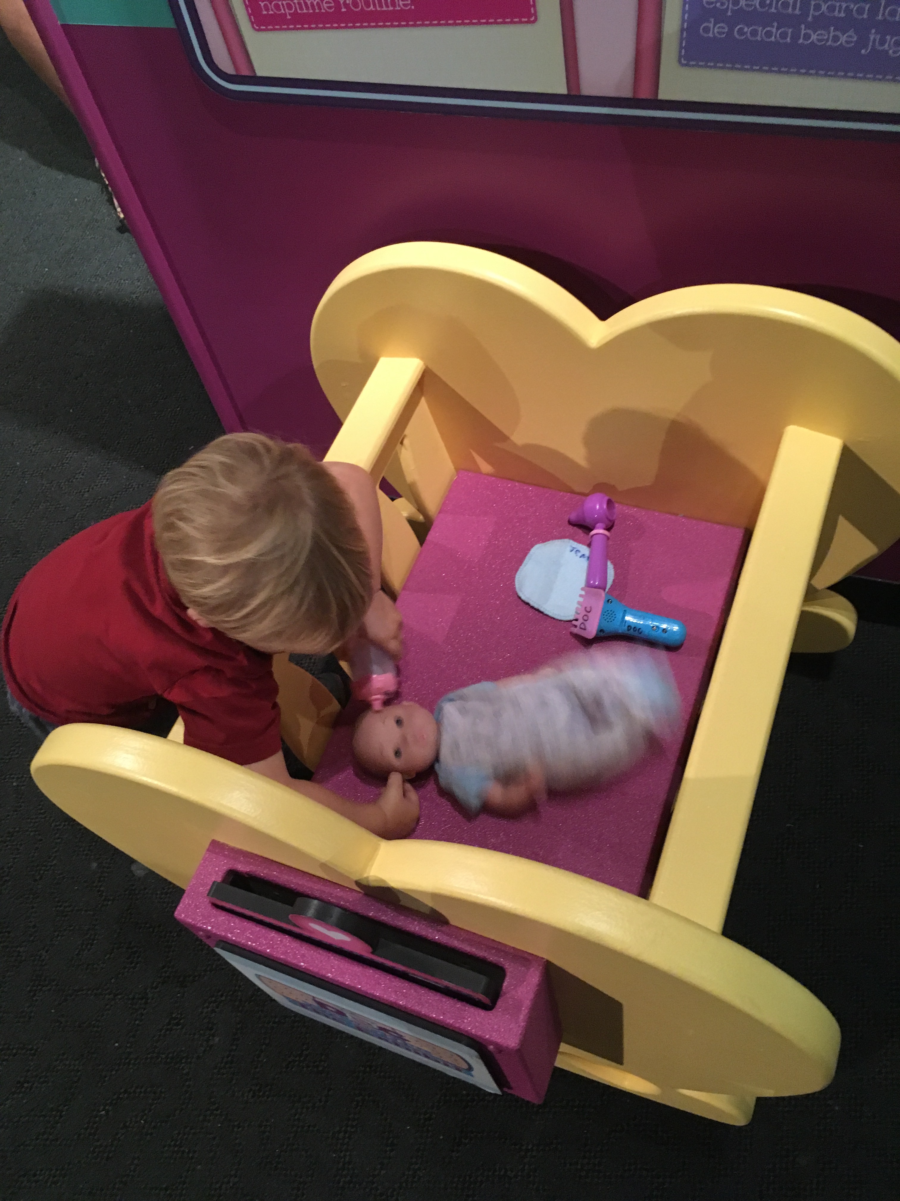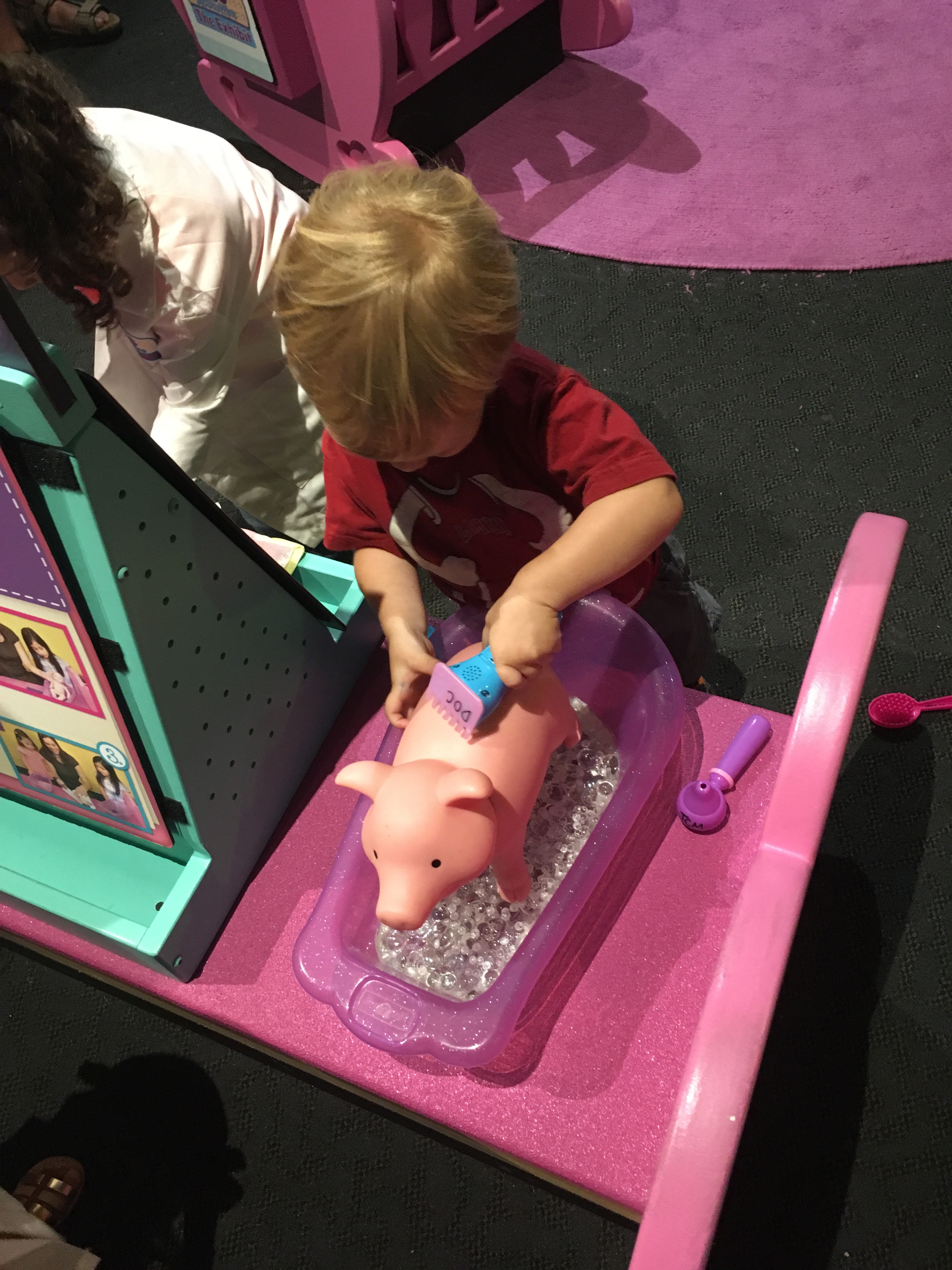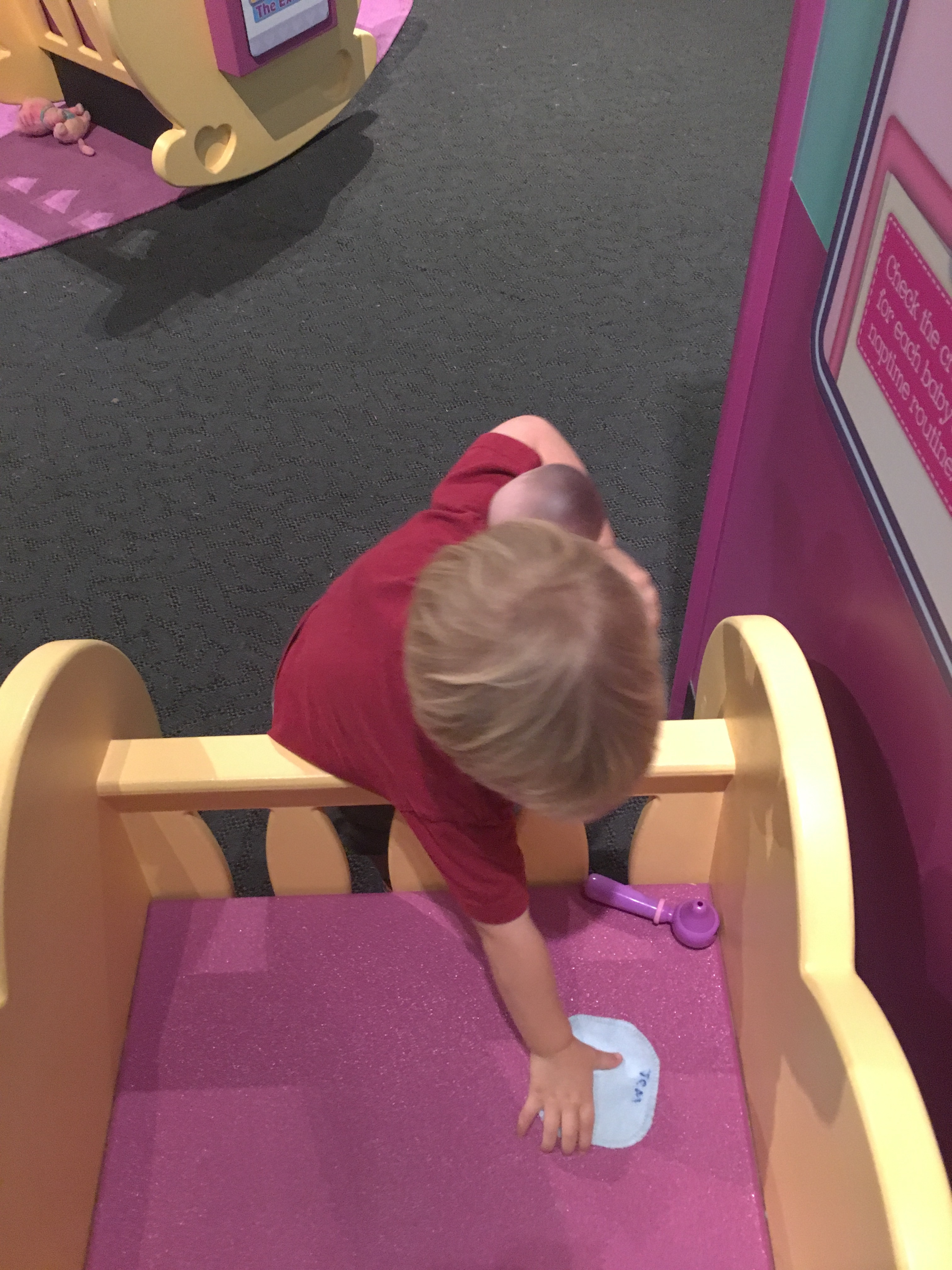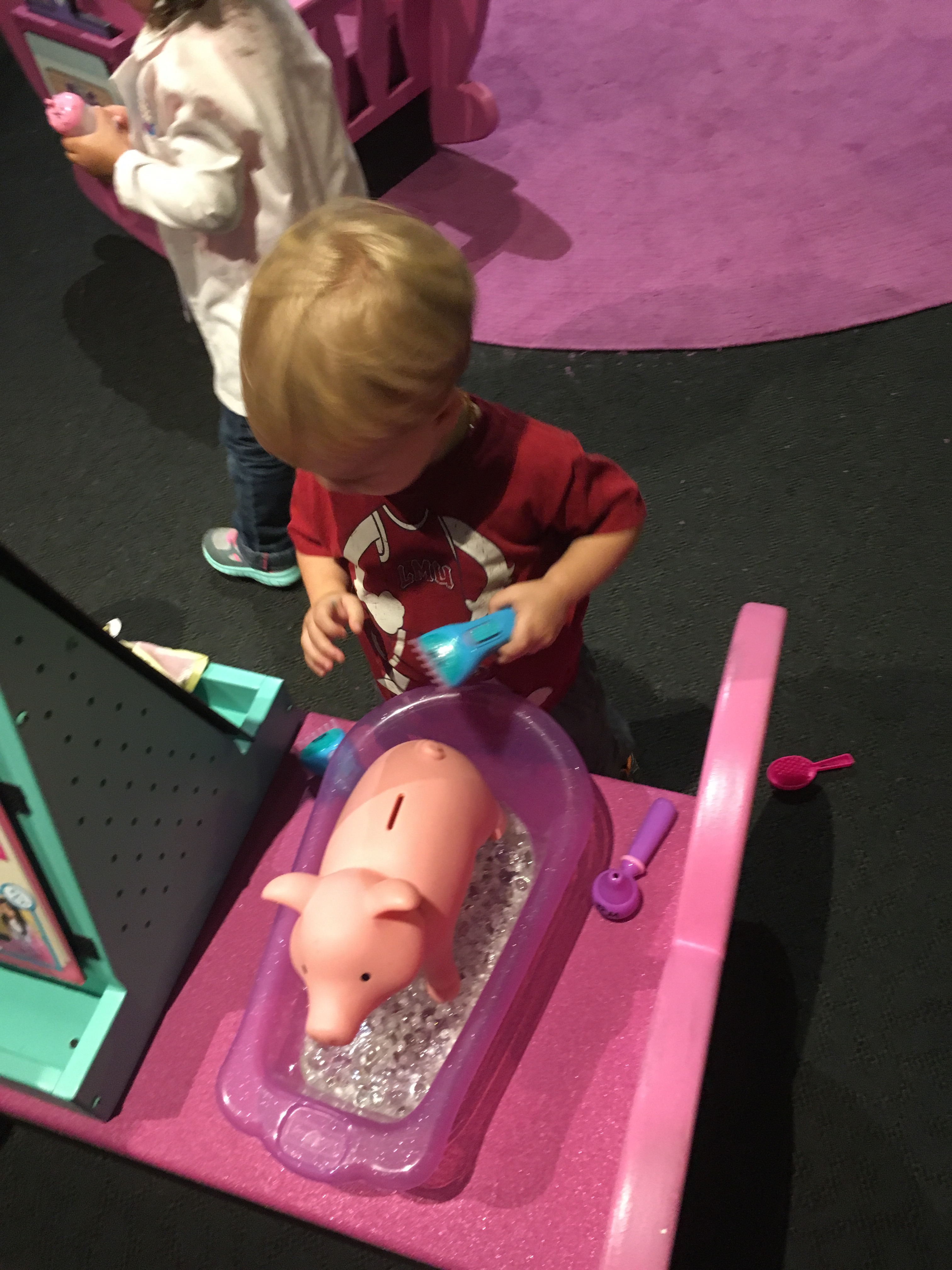 The featured exhibits were Doc McStuffins and an outer space exhibit by Boeing. Jackson loved the Doc exhibit. it was full of cribs and baby bathtubs and a vet clinic, and he enjoyed grooming and feeding baby dolls and a plastic piggy bank. Jacob was not impressed.