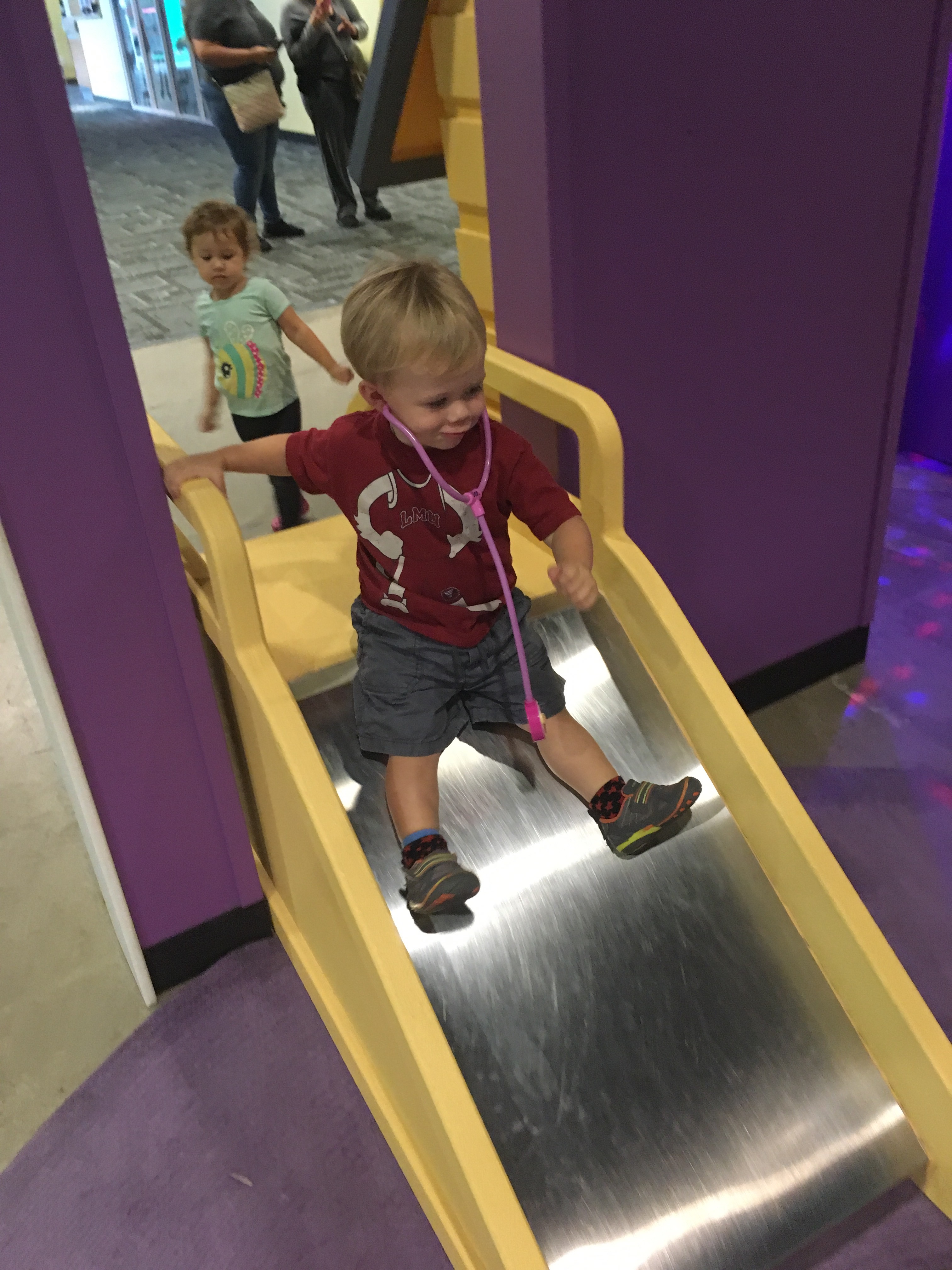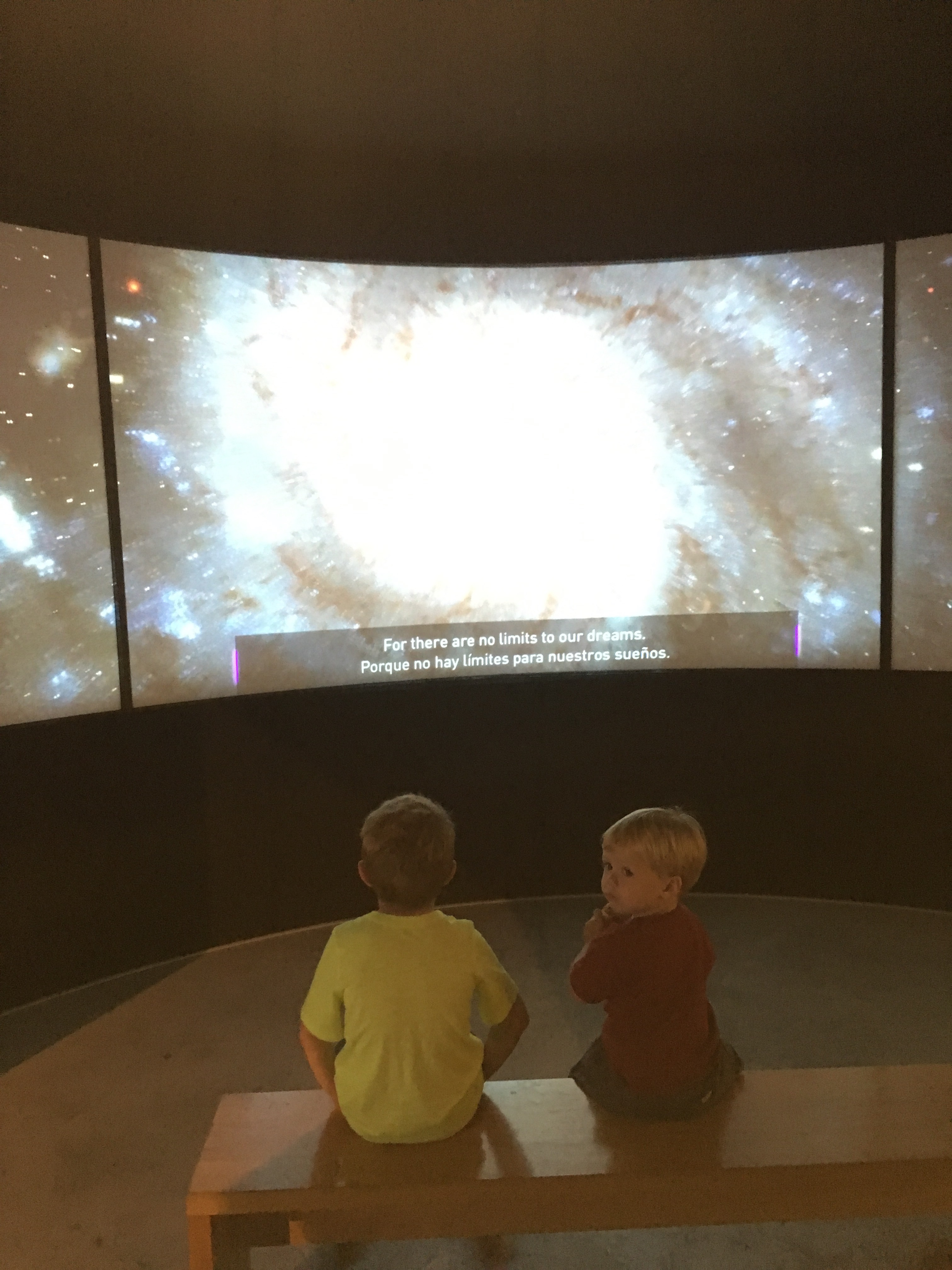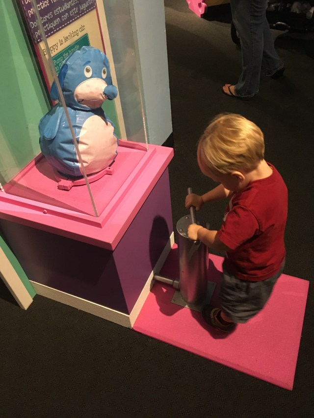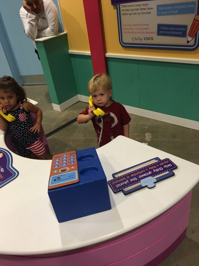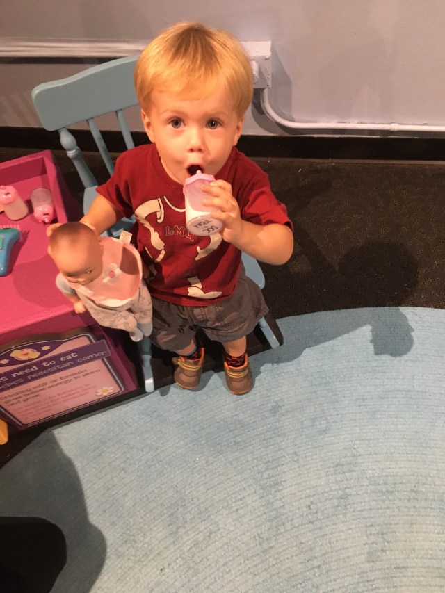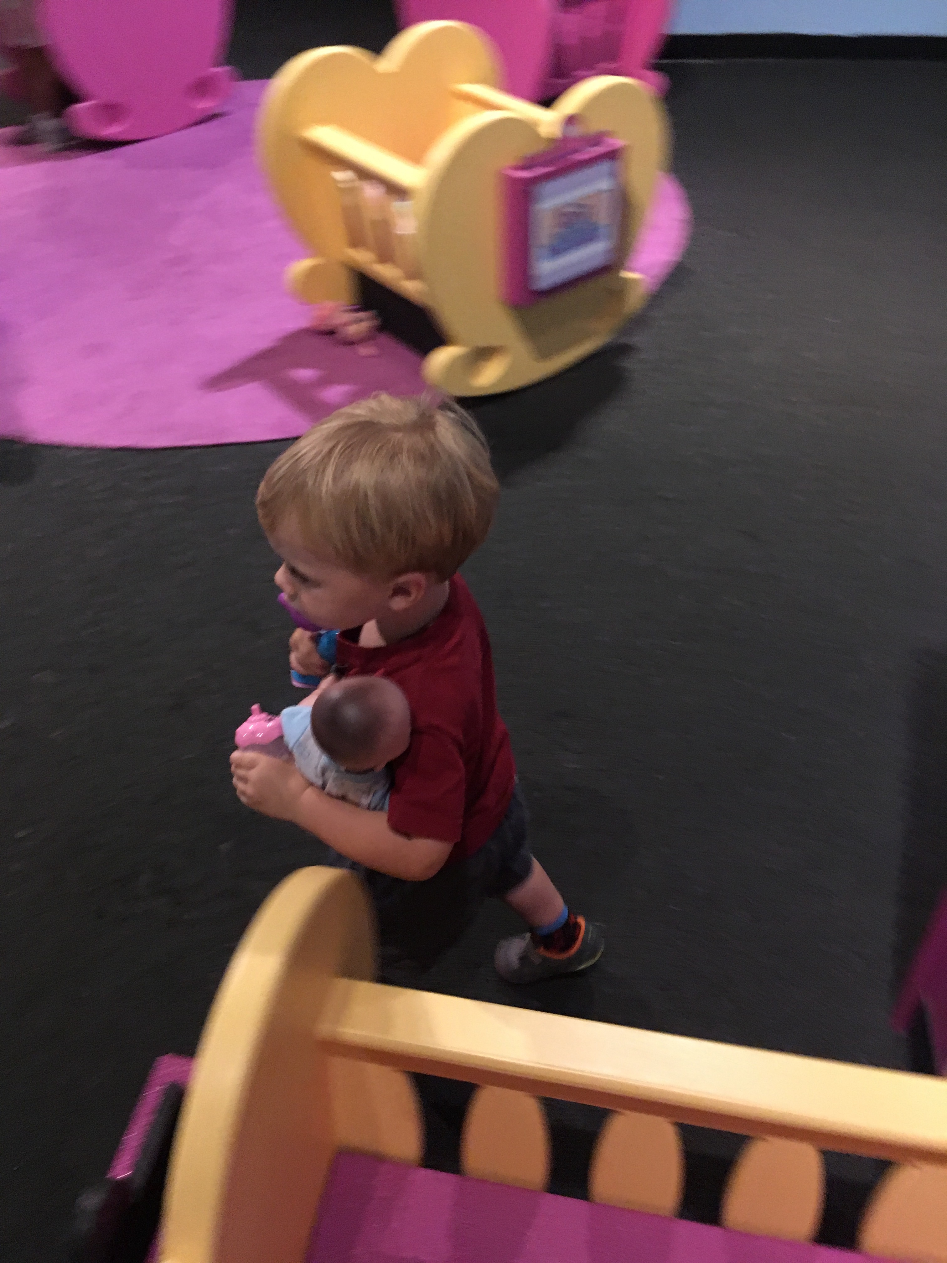 The featured exhibits were Doc McStuffins and an outer space exhibit by Boeing. Jackson loved the Doc exhibit. it was full of cribs and baby bathtubs and a vet clinic, and he enjoyed grooming and feeding baby dolls and a plastic piggy bank. Jacob was not impressed.