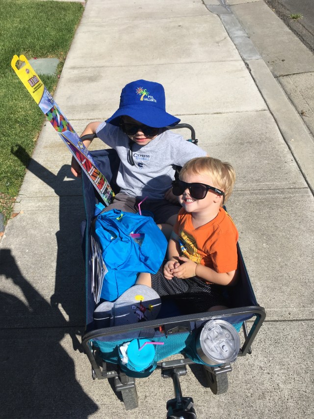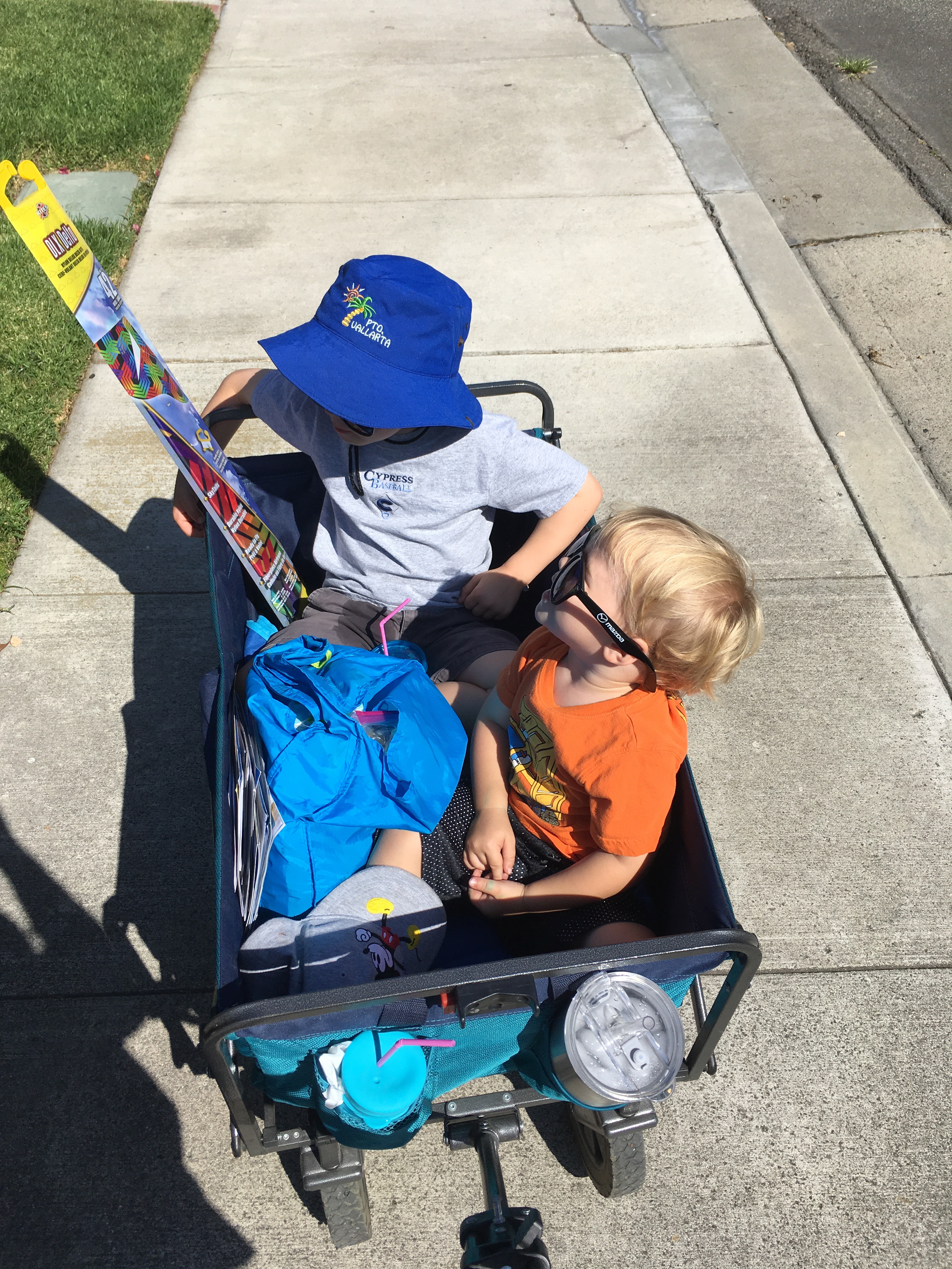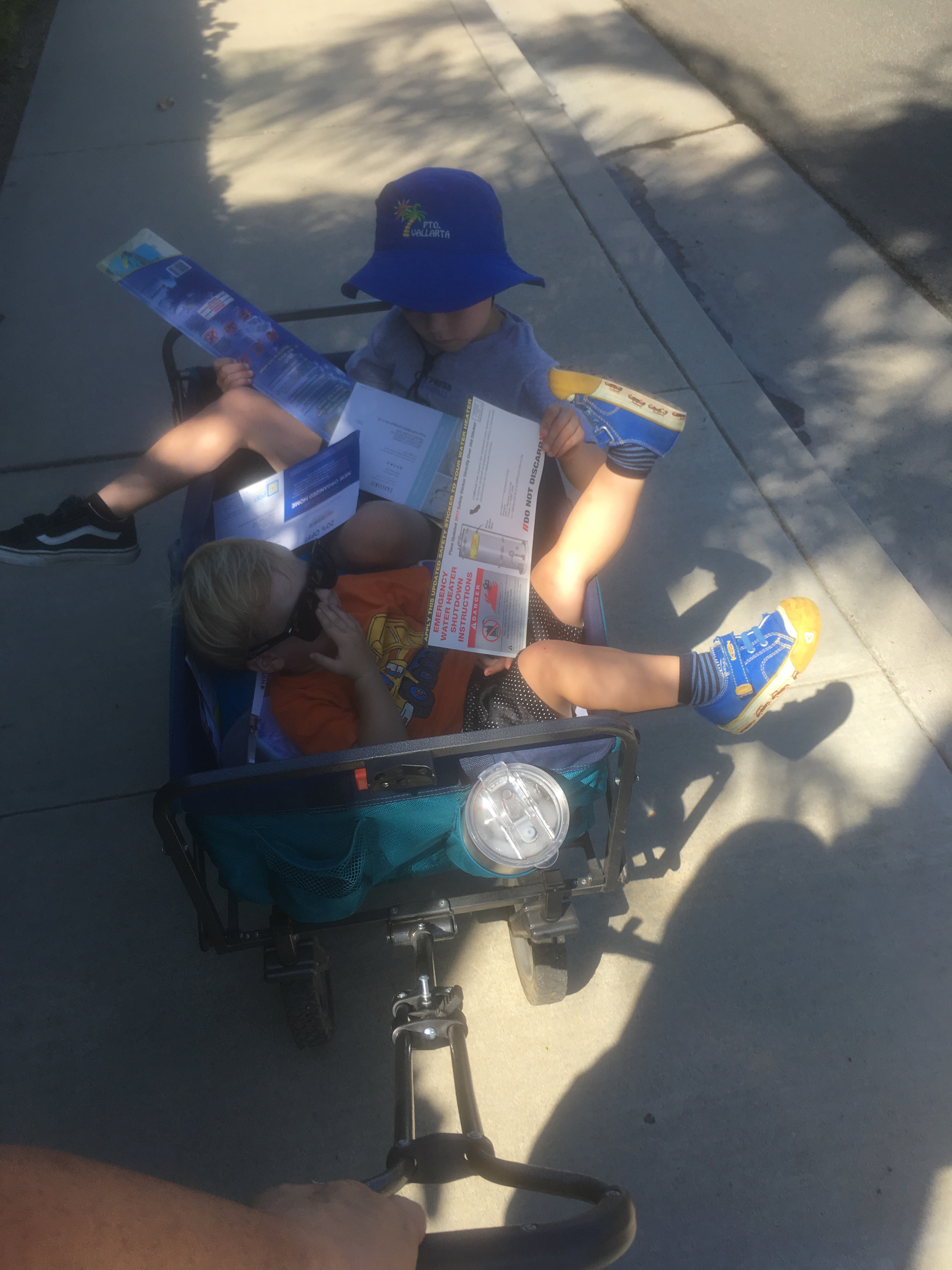 We took off for park on foot, which is a big deal because it’s over a mile up the hill from us. The kids were great sports, sitting in the wagon and occasionally pretending to read the mail.