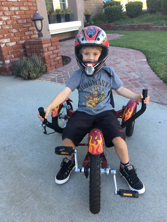 Jacob is a lucky kid! Cousin Kaden passed along this awesome three wheel bike and full face helmet, and jacob is in love. He is already a pro at riding this bike; steering around tight turns and skidding into small spaces. He is quite the sight!