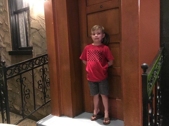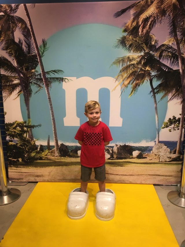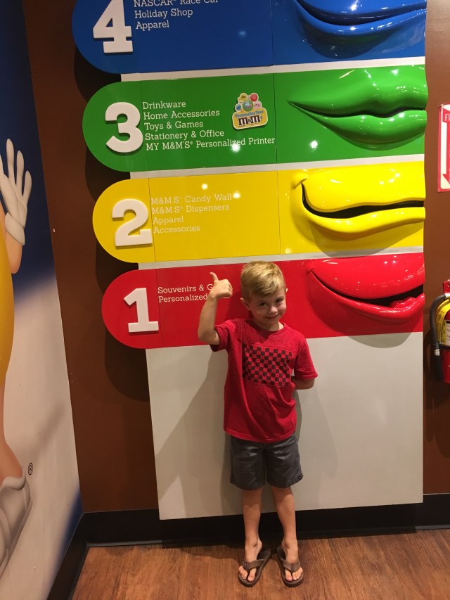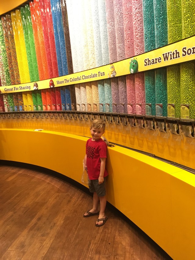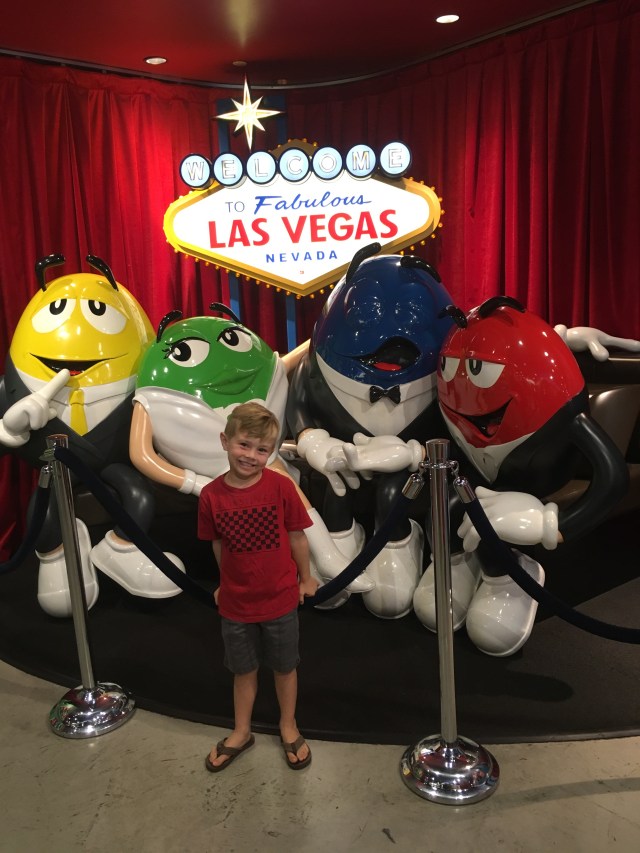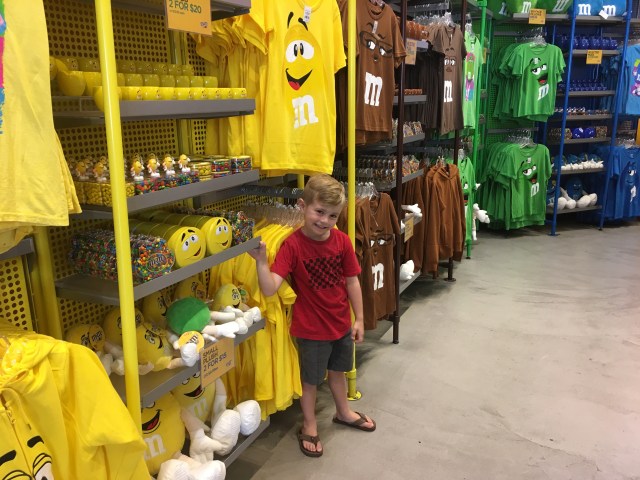 Our day started really wonderfully with a visit from the Massaros who were on their way to Utah! Then, josh went to the convention and the kids and I boarded the monorail to the strip. Our hotel (Embassy Suites) was a ten-minute walk from the convention center and monorail station. Kids 5 and under are free! I bought both josh and I a 24-hour pass for $10 each. (One ride is usually $5). The trains run about every 7 minutes and have a great view of the backside of many hotels. The kids loved it! We rode to MGM, the furthest south stop, to get to the M&M world store. This store is, in my opinion, really lame, but the kids were excited. š from there we trekked across the strip and into New York New York. I thought jacob would be really impressed with the outdoor street feel, but he wasn’t really.